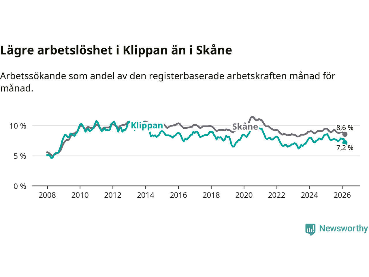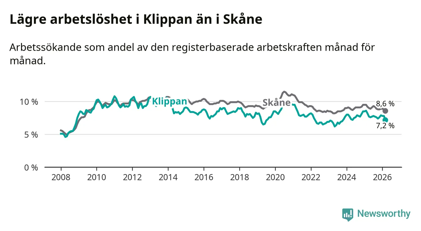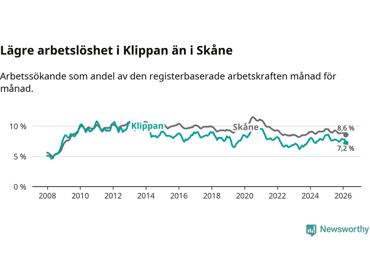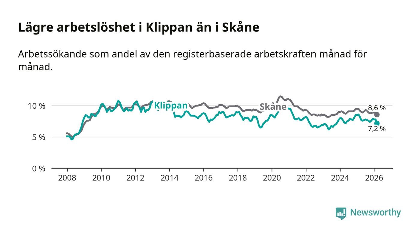 Under mars månad rapporterade Klippans kommun en total arbetslöshet på 7,2 procent. Det är en minskning jämfört med samma tidpunkt i fjol (−1,0 procentenheter). Även i Skåne län sjunker arbetslösheten .