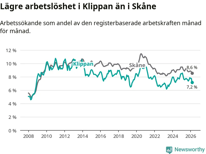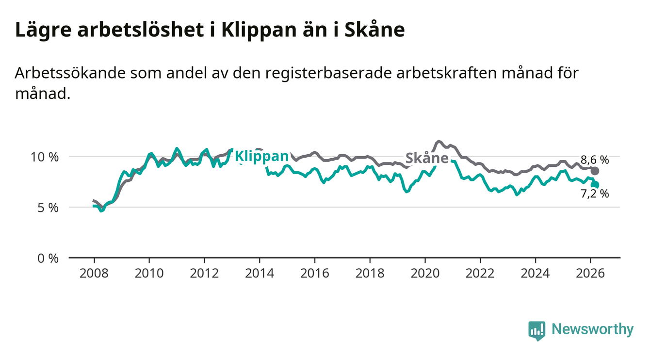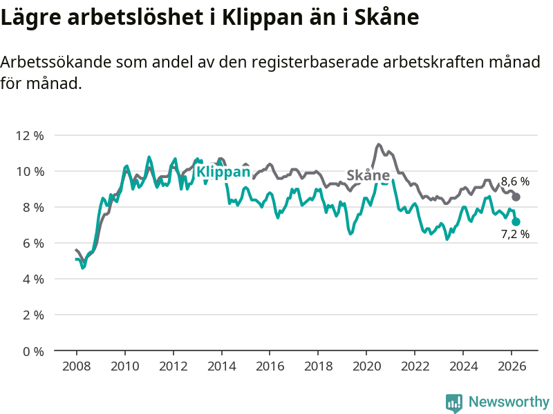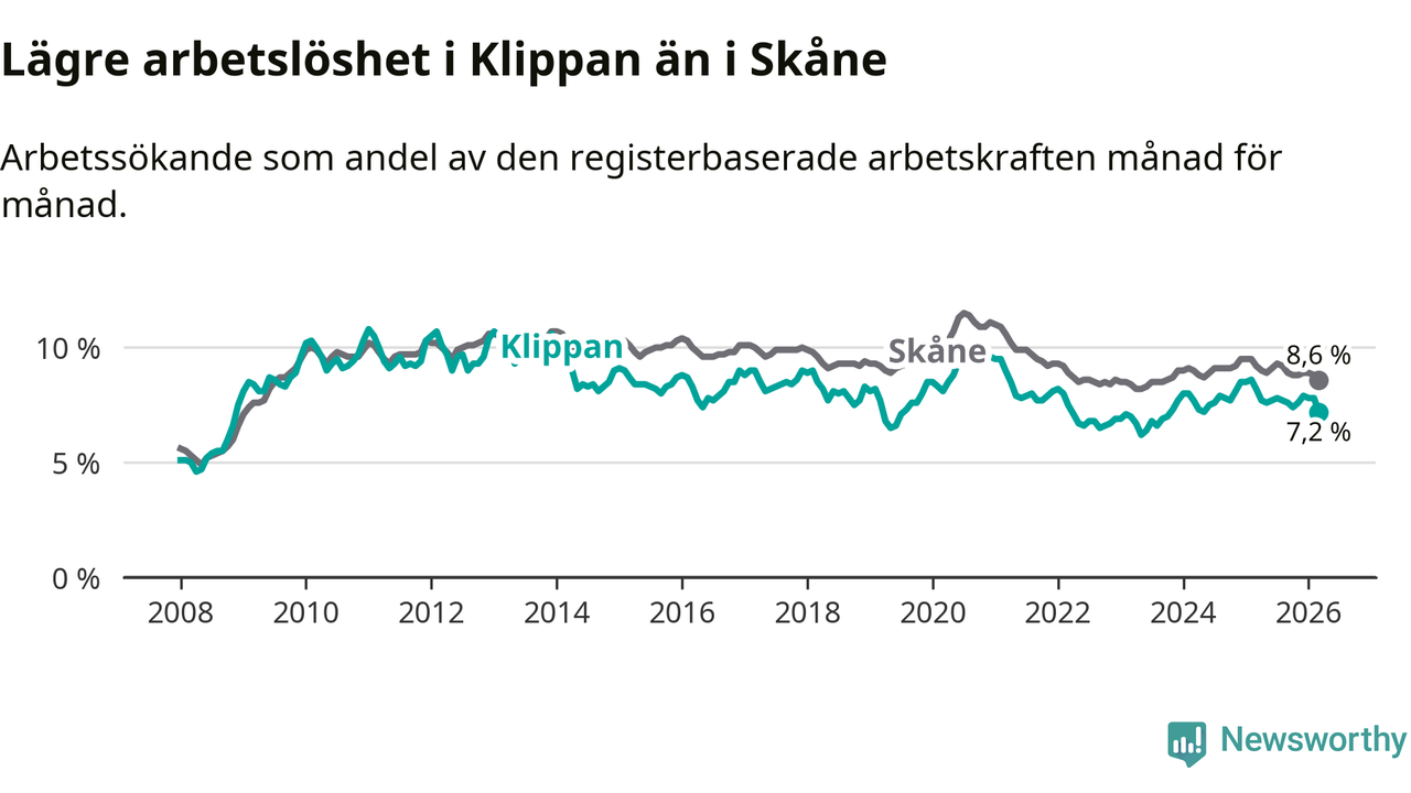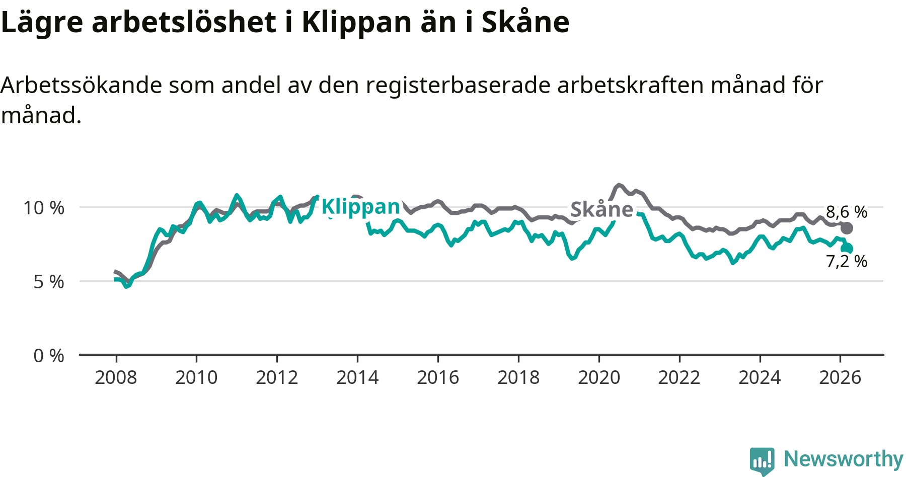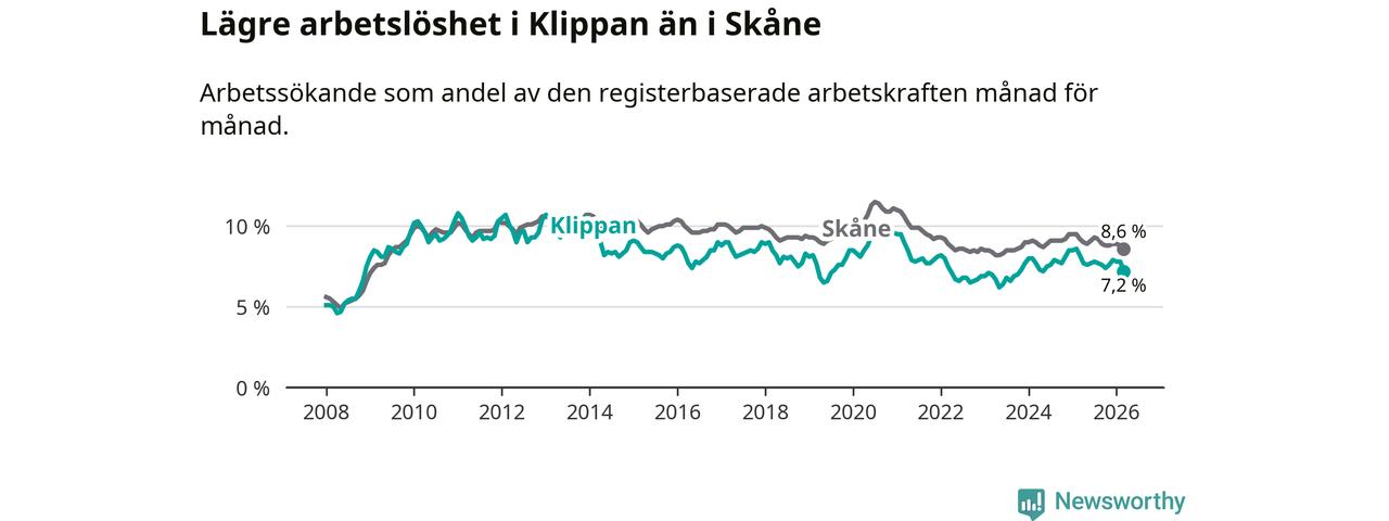 Under mars månad rapporterade Klippans kommun en total arbetslöshet på 7,2 procent. Det är en minskning jämfört med samma tidpunkt i fjol (−1,0 procentenheter). Även i Skåne län sjunker arbetslösheten .