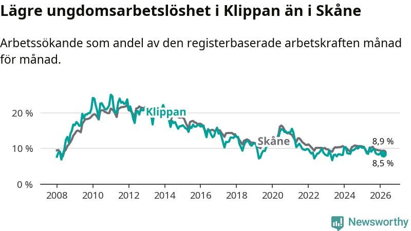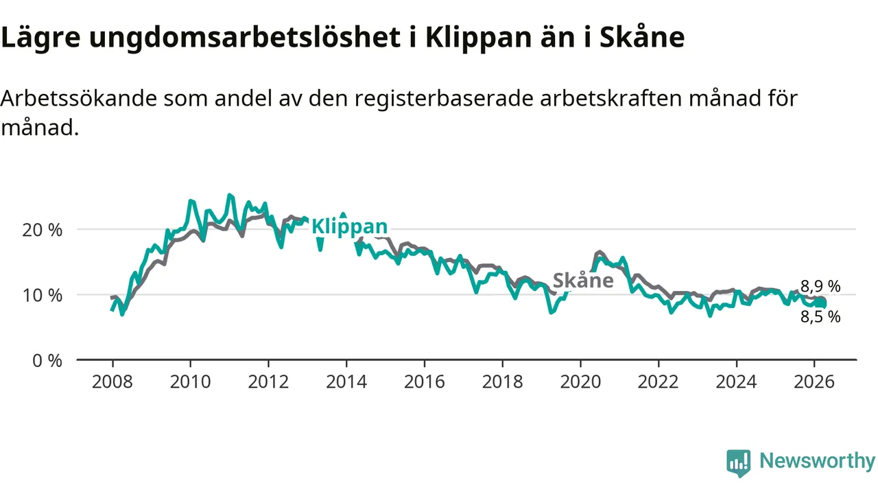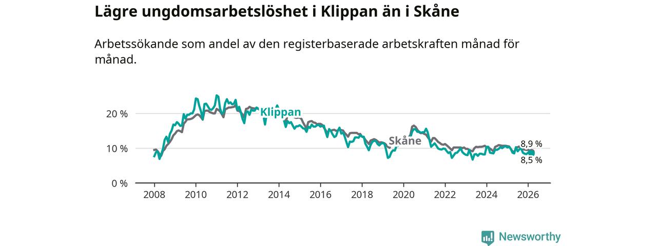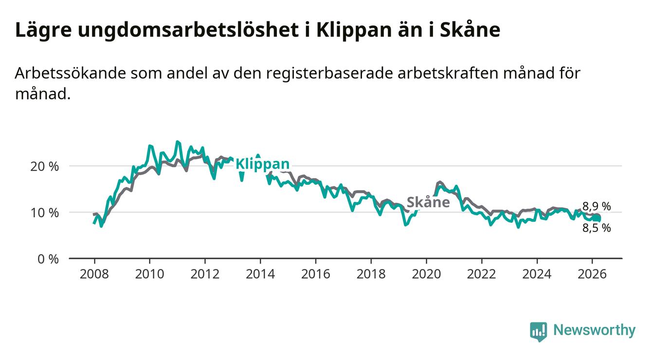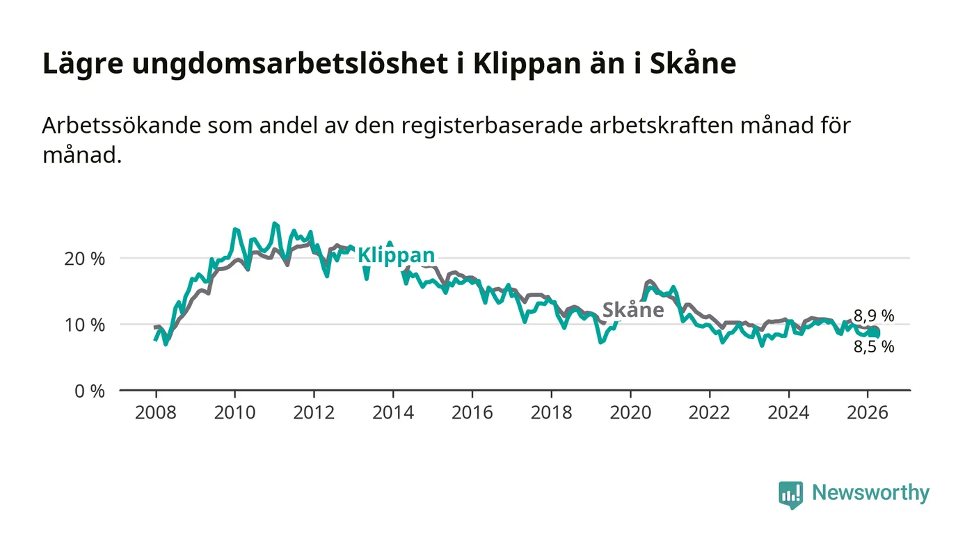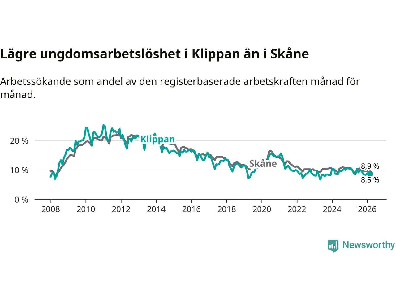 I och med den senaste månadens nedgång har de ungas arbetslöshet i Klippan sjunkit nio månader i följd (ner från 10,3 procent i juni 2025 till 8,5 procent nu).
