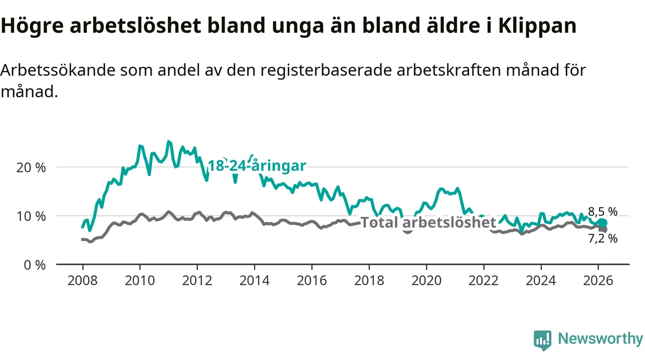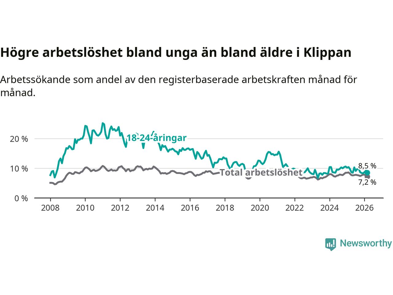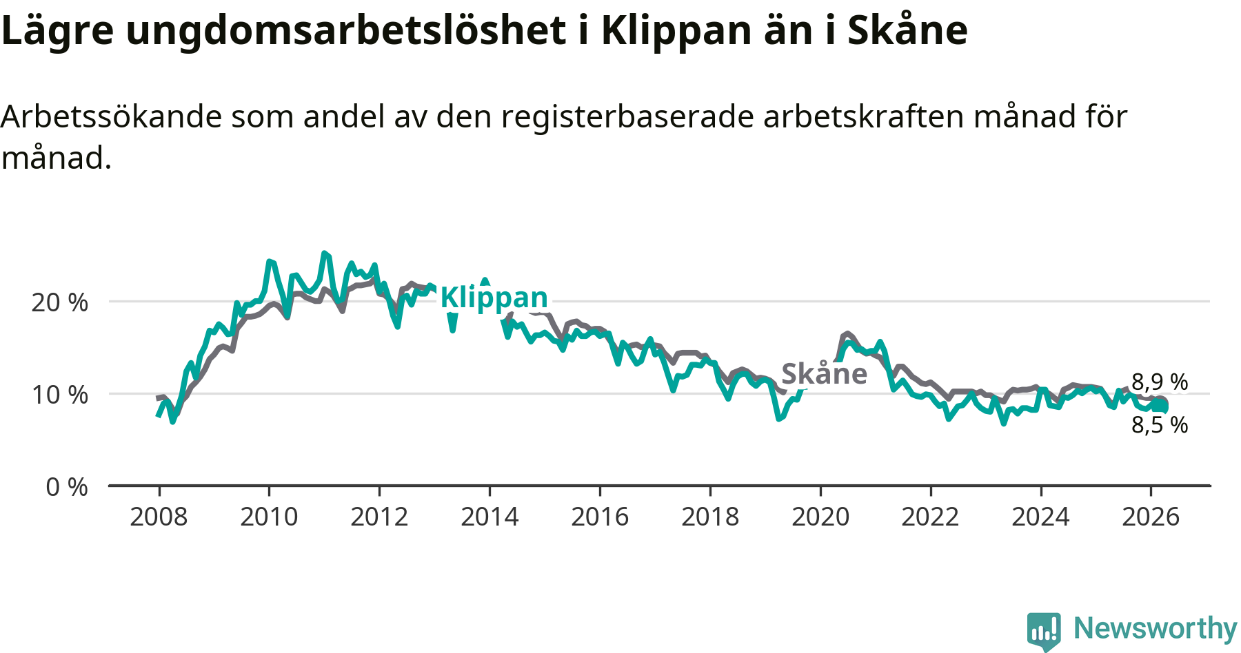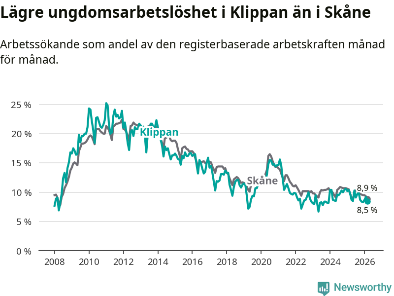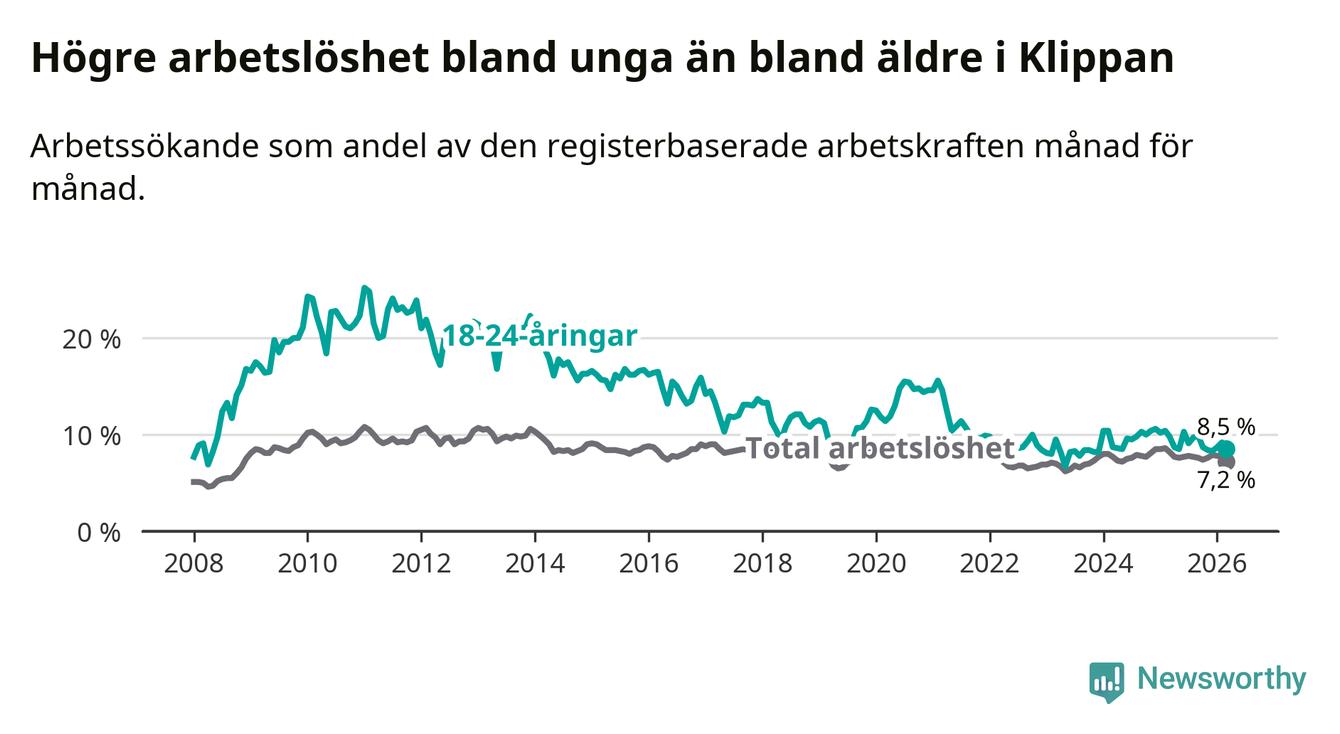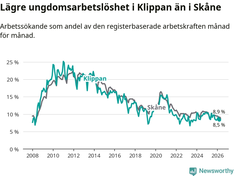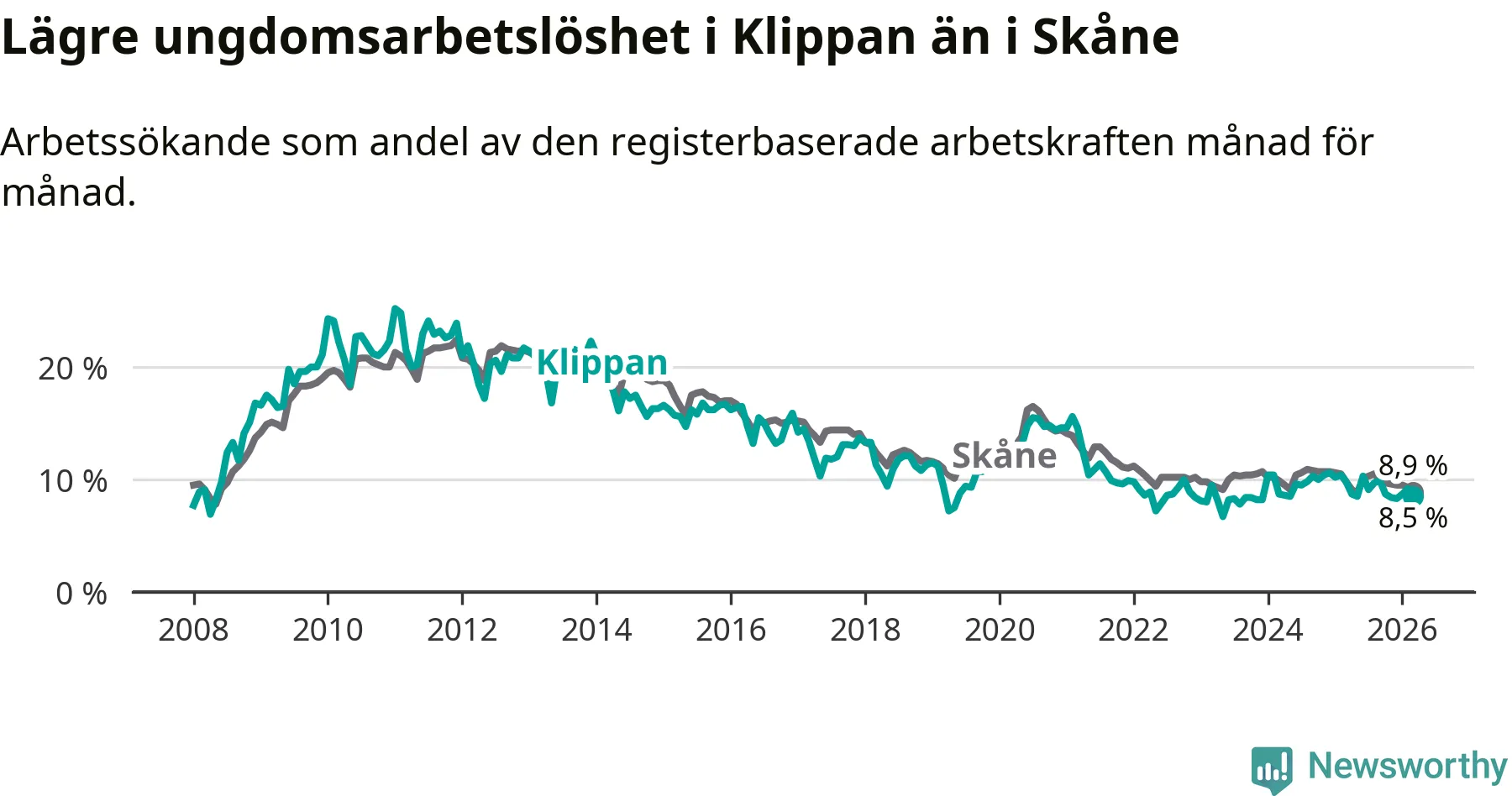 I och med den senaste månadens nedgång har de ungas arbetslöshet i Klippan sjunkit nio månader i följd (ner från 10,3 procent i juni 2025 till 8,5 procent nu).