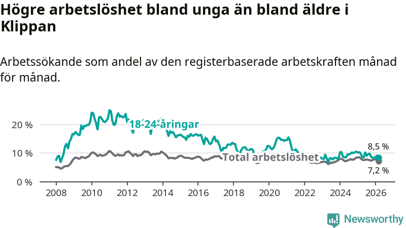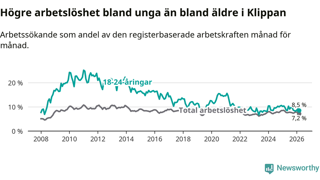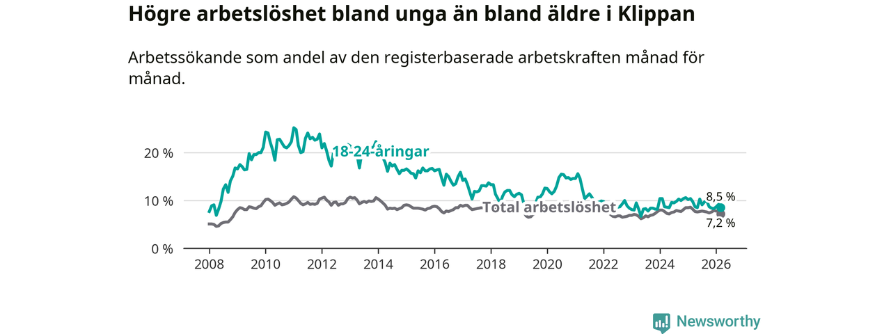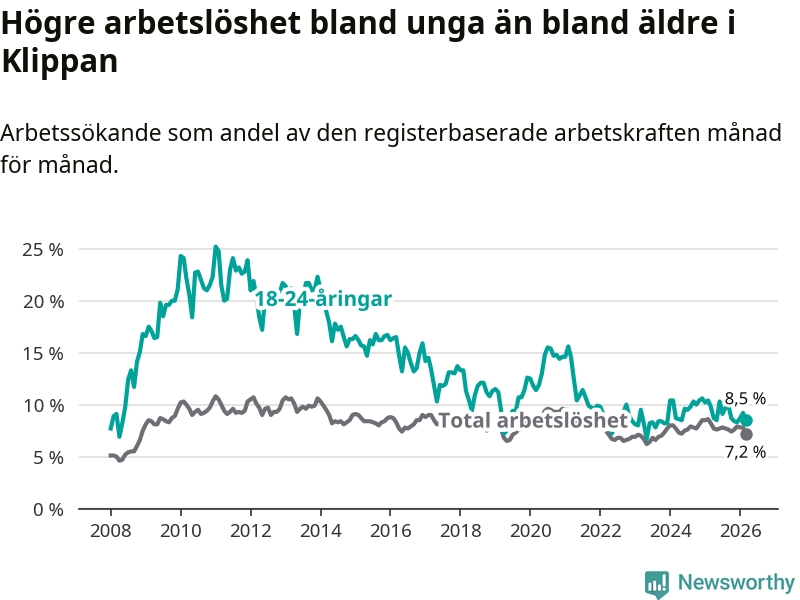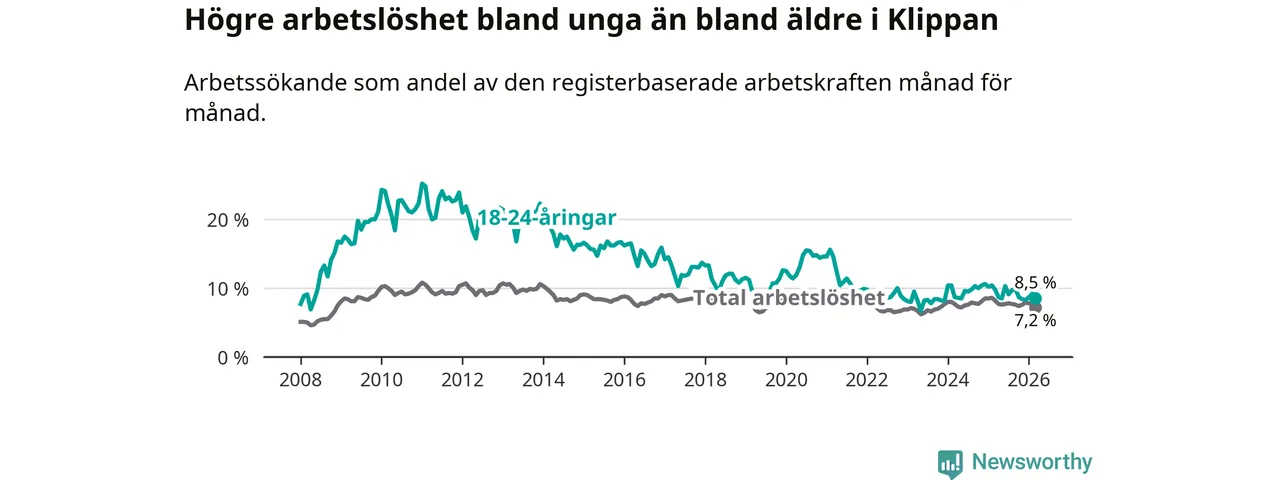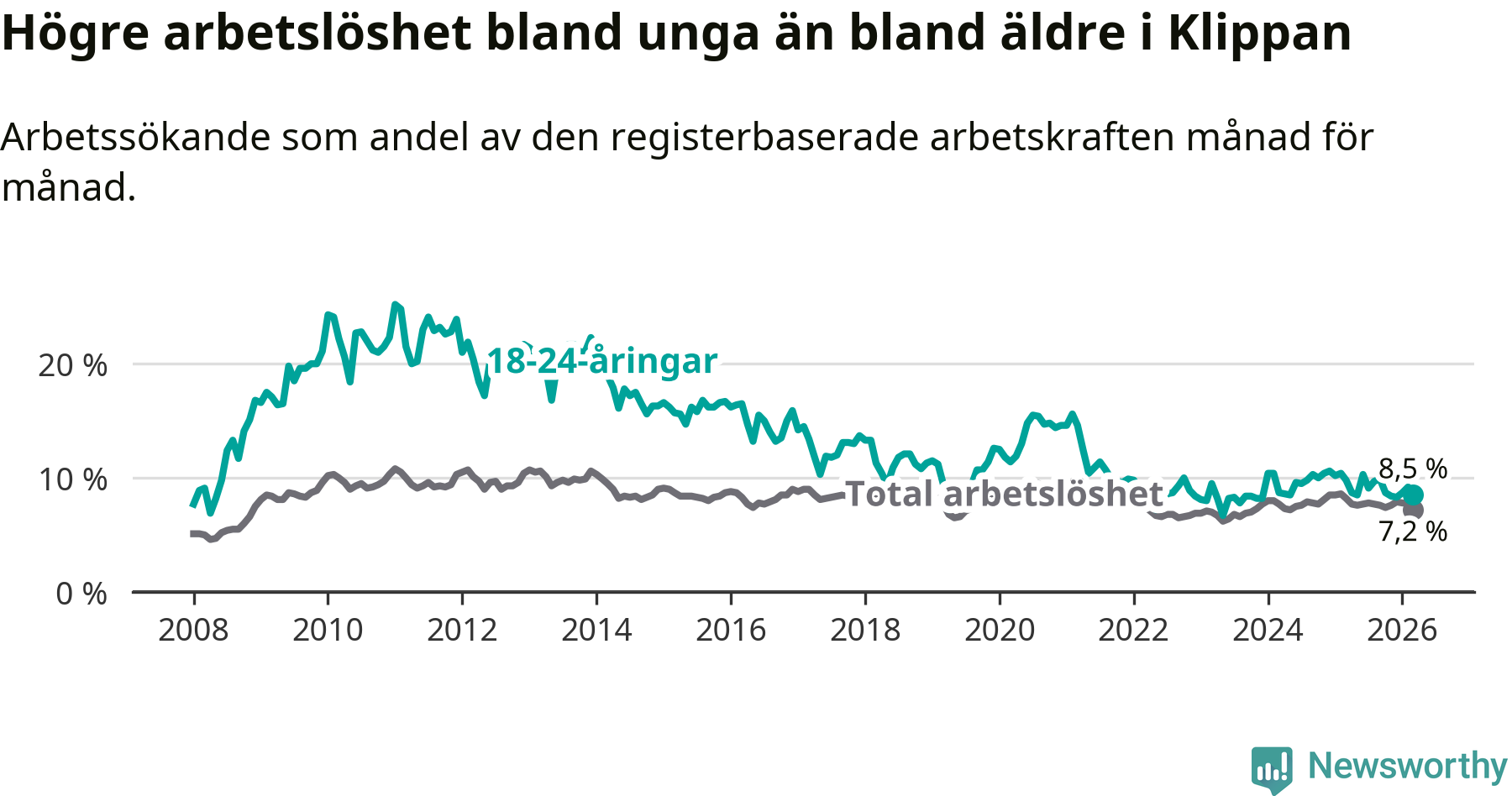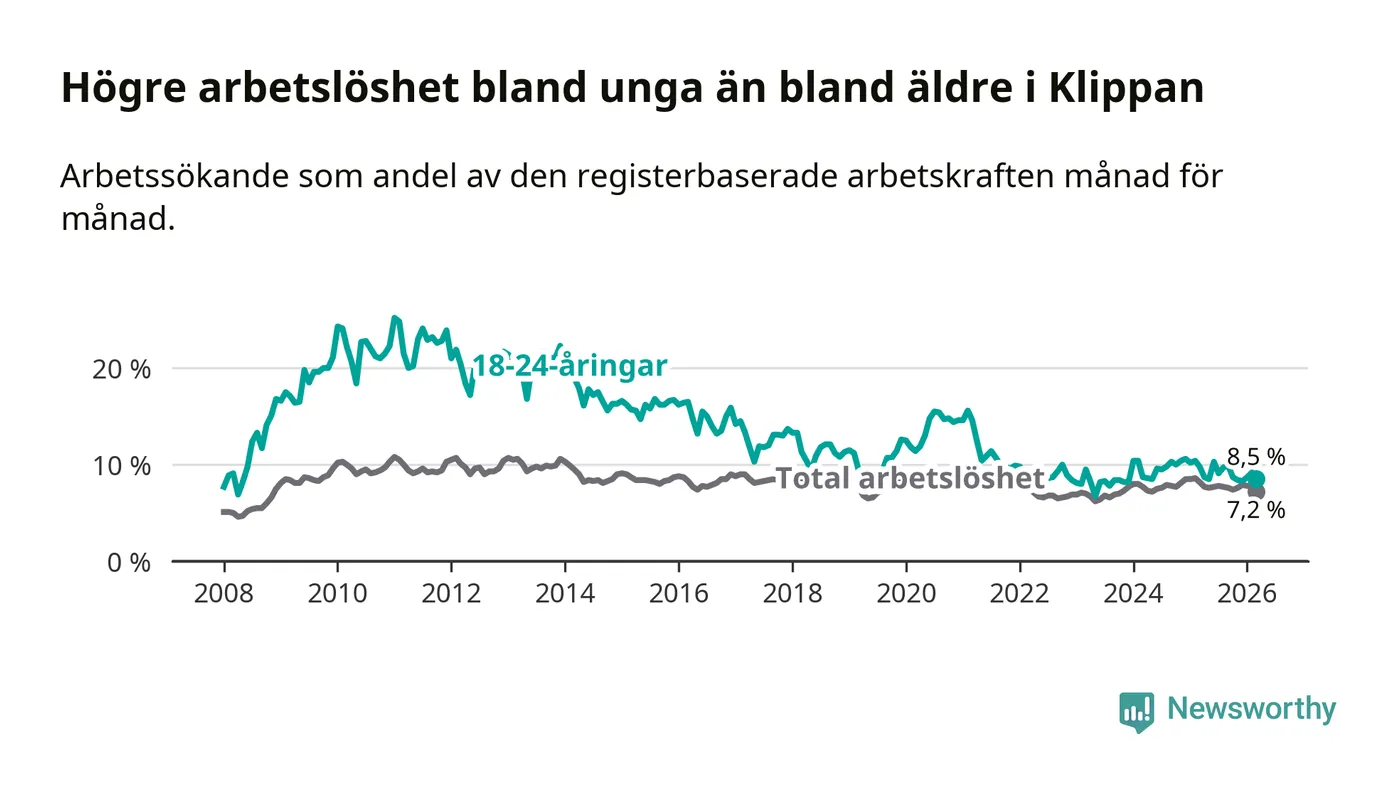 I och med den senaste månadens nedgång har de ungas arbetslöshet i Klippan sjunkit nio månader i följd (ner från 10,3 procent i juni 2025 till 8,5 procent nu).