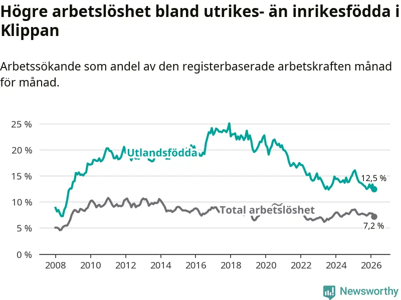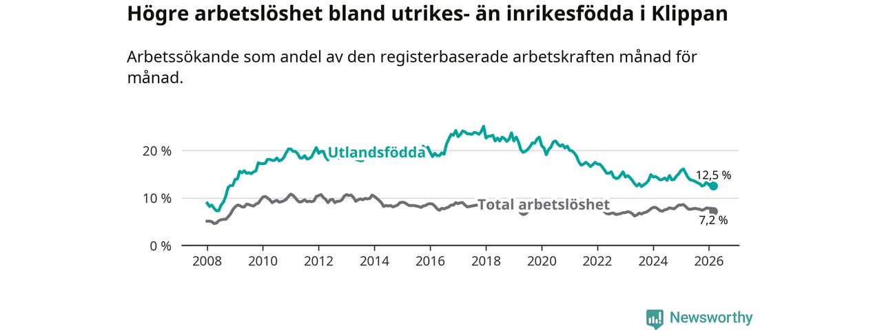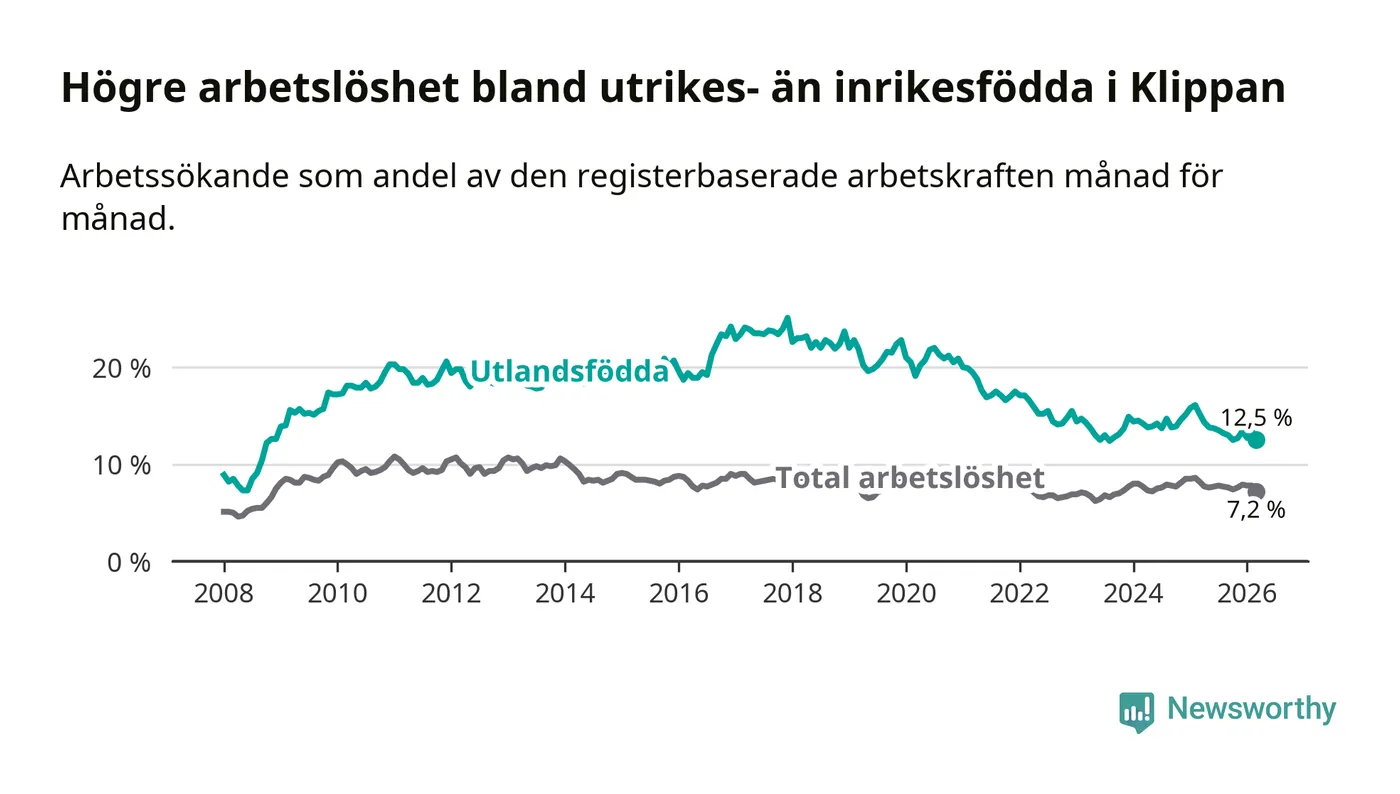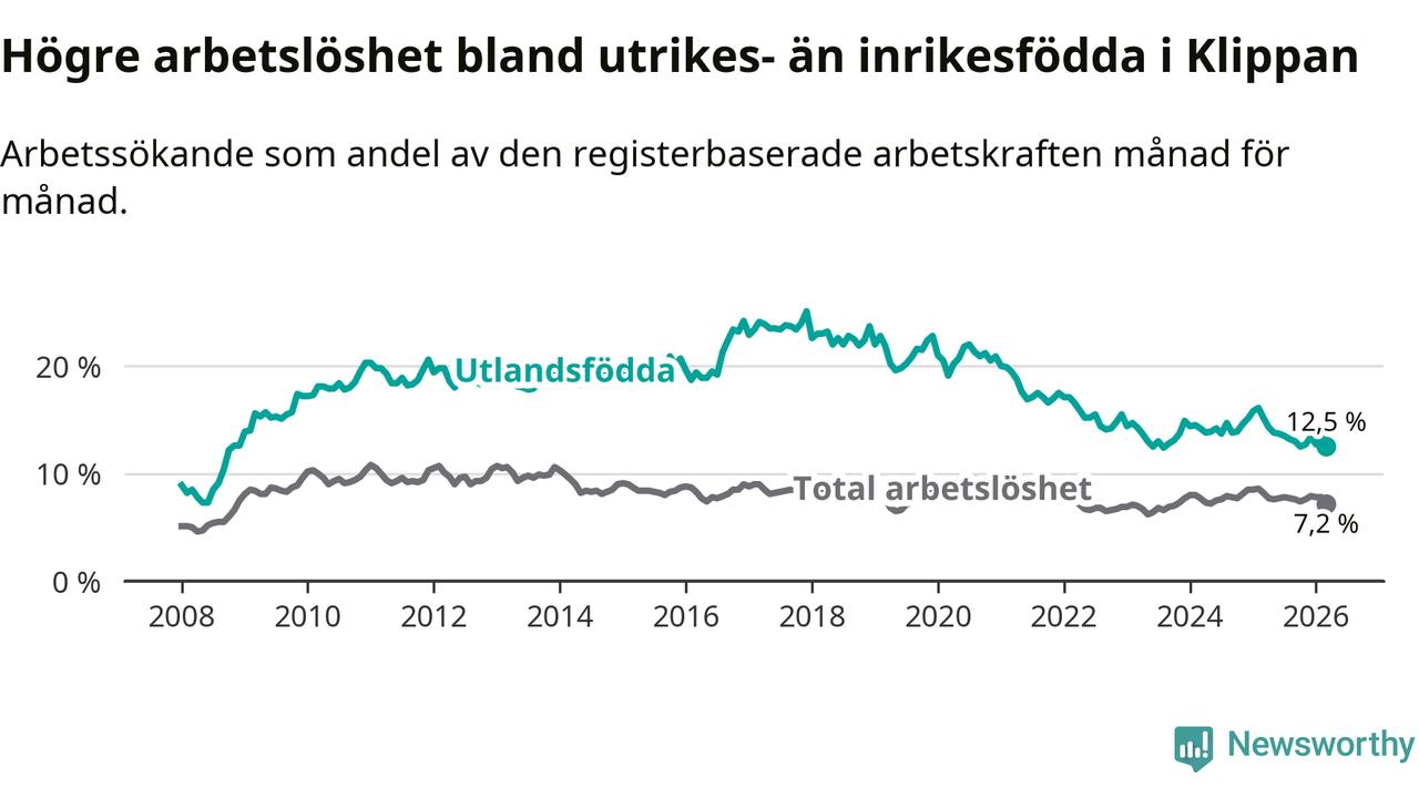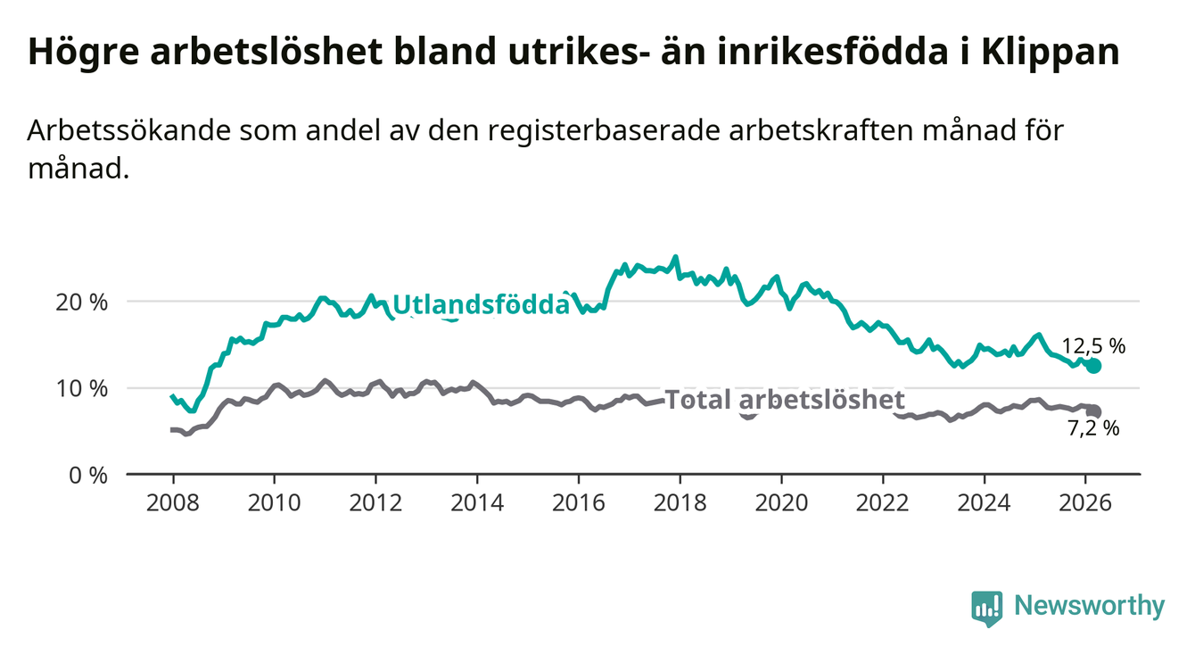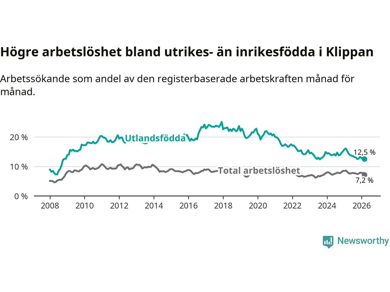 Arbetslösheten bland utlandsfödda var 12,5 procent i Klippan under mars månad, motsvarande 233 av 1 864 personer. Det är 2,7 procentenheter färre än vid samma tidpunkt i fjol (−50 om man räknar personer). Därmed är de utlandsföddas arbetslöshet lägre än vid samma tidpunkt i fjol för elfte månaden i följd. Sedan april 2025 har arbetslösheten bland utlandsfödda minskat från 14,3 till 12,5 procent.