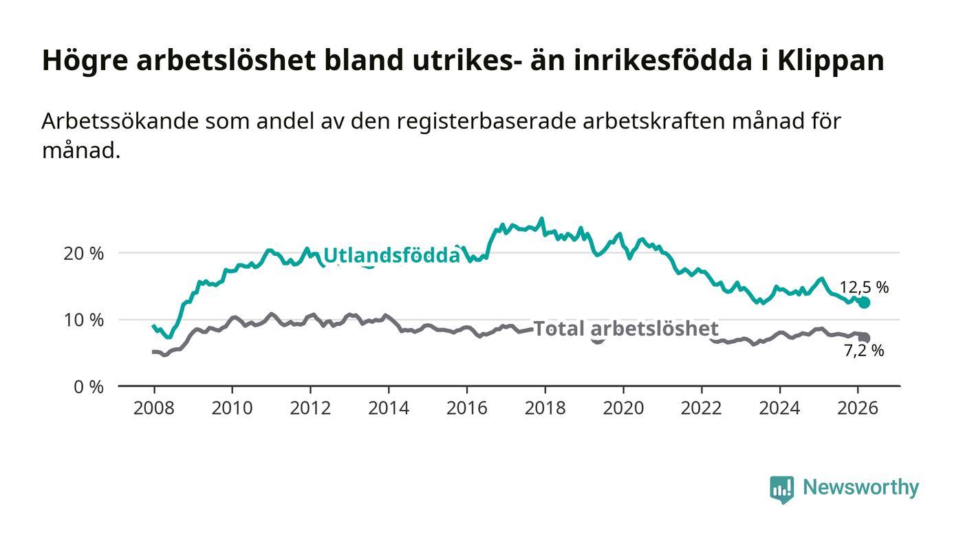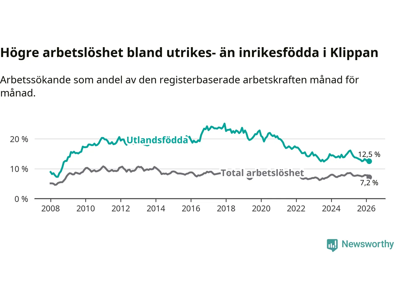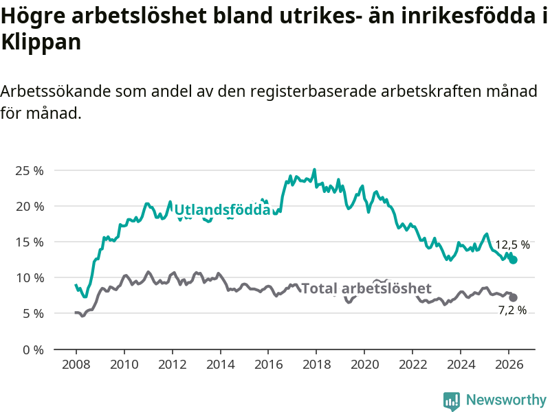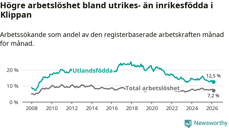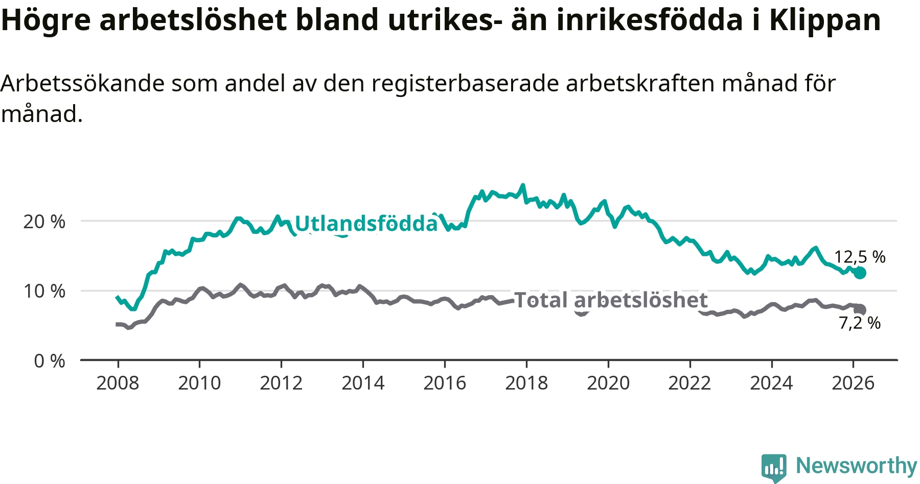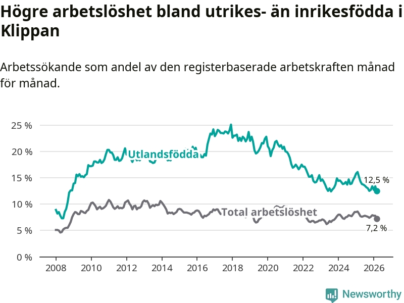 Arbetslösheten bland utlandsfödda var 12,5 procent i Klippan under mars månad, motsvarande 233 av 1 864 personer. Det är 2,7 procentenheter färre än vid samma tidpunkt i fjol (−50 om man räknar personer). Därmed är de utlandsföddas arbetslöshet lägre än vid samma tidpunkt i fjol för elfte månaden i följd. Sedan april 2025 har arbetslösheten bland utlandsfödda minskat från 14,3 till 12,5 procent.