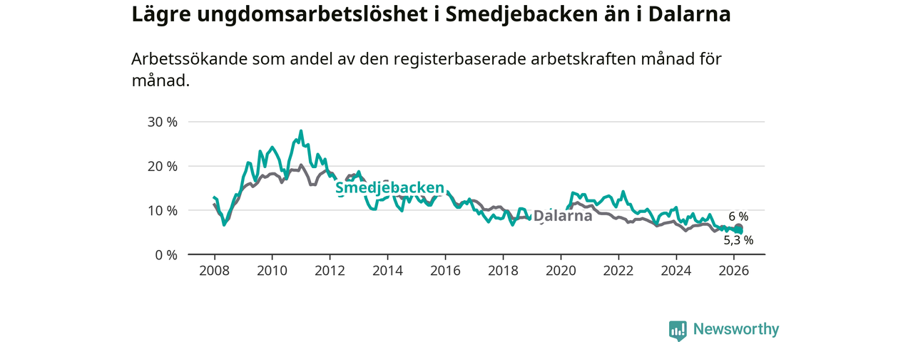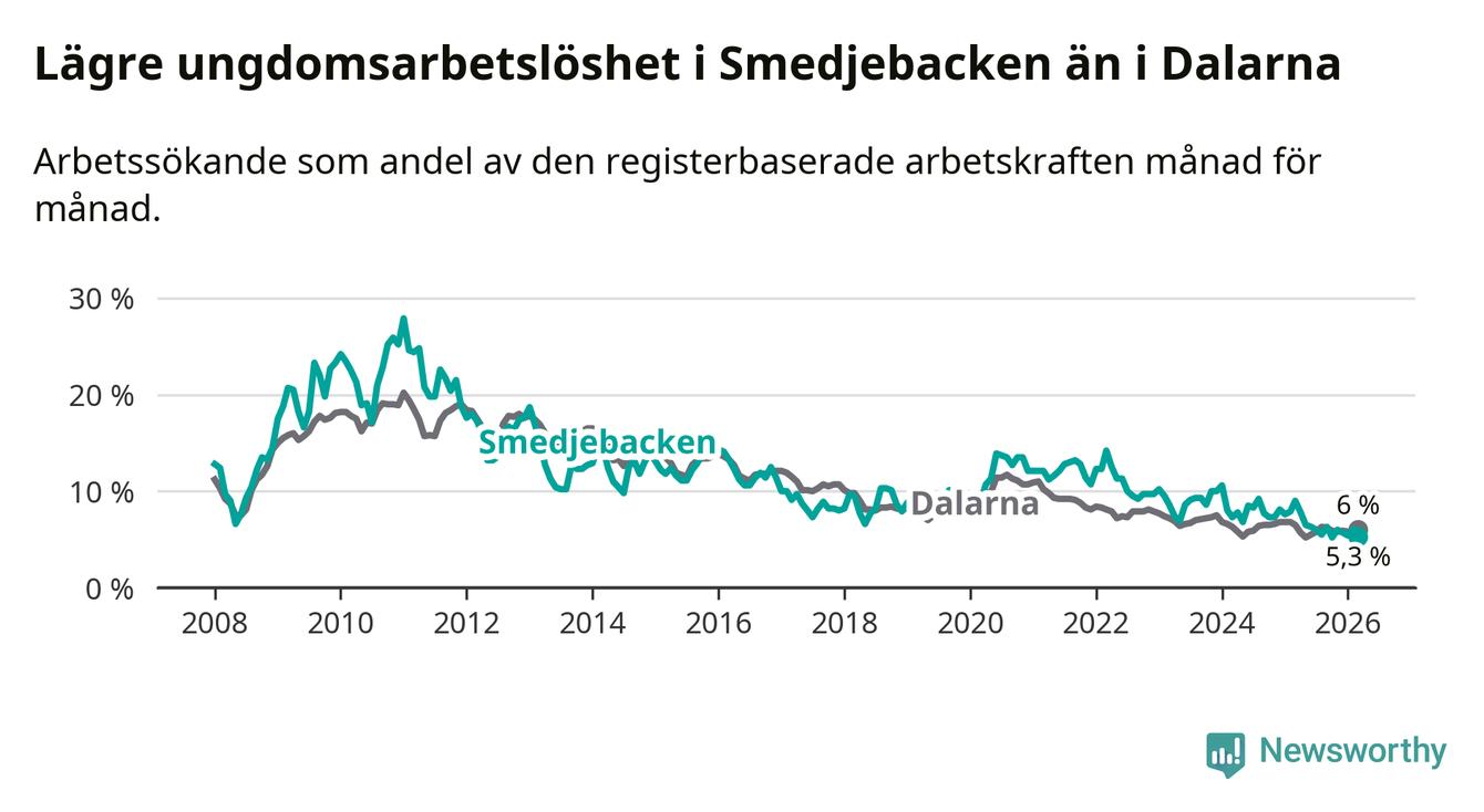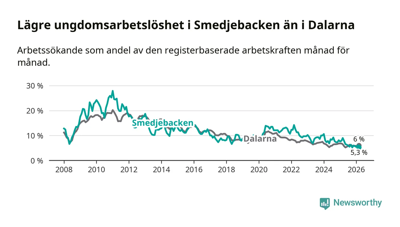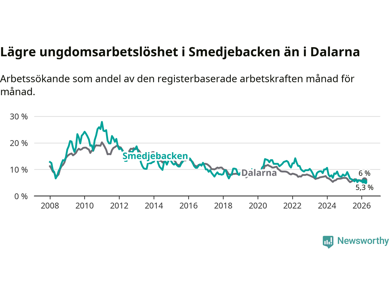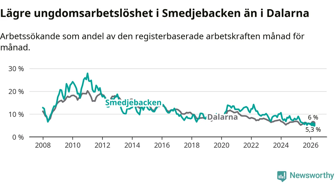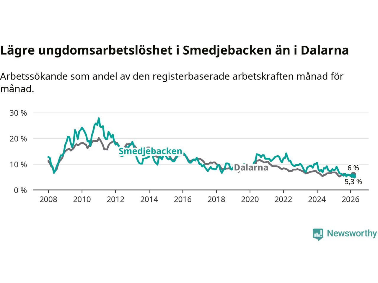 I och med den senaste månadens nedgång har de ungas arbetslöshet i Smedjebacken sjunkit elva månader i följd (ner från 7,8 procent i april 2025 till 5,3 procent nu).