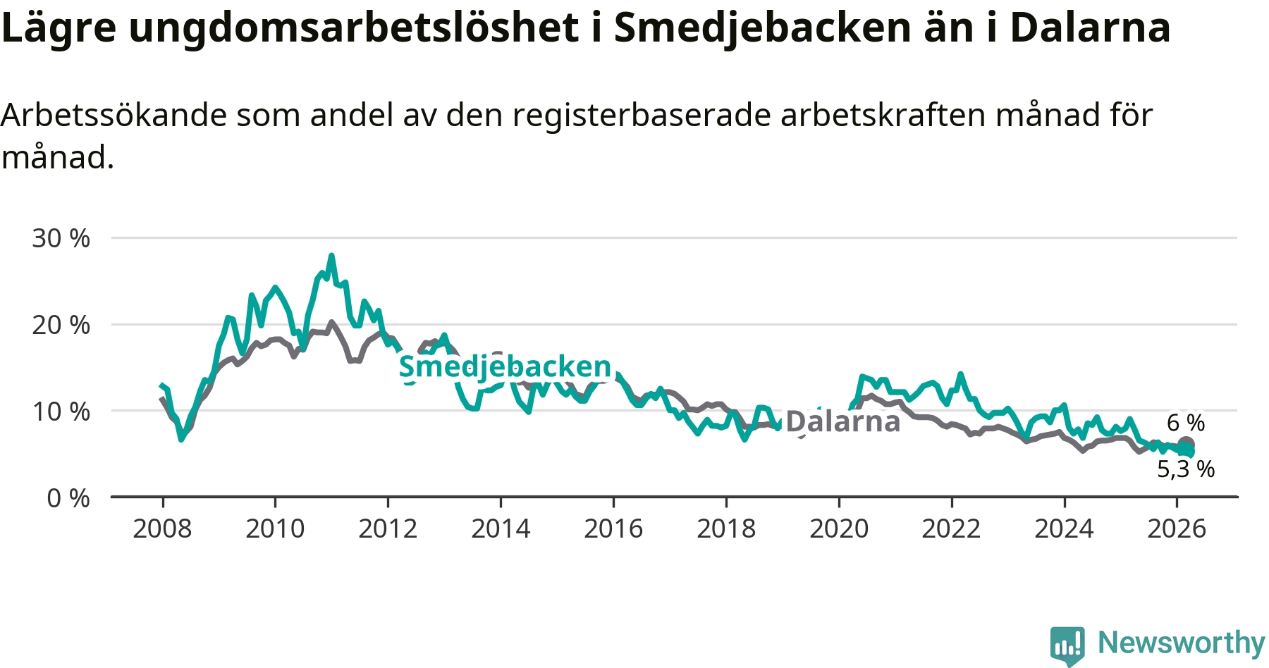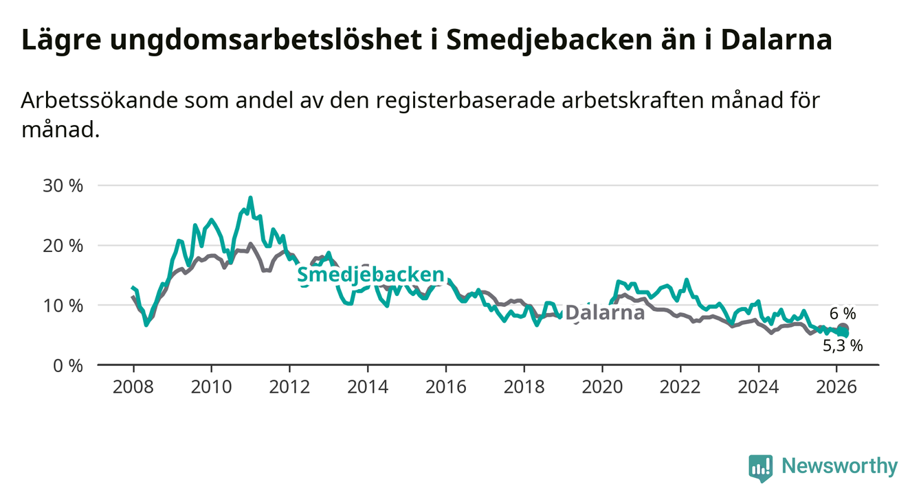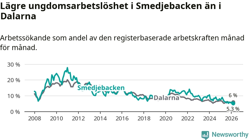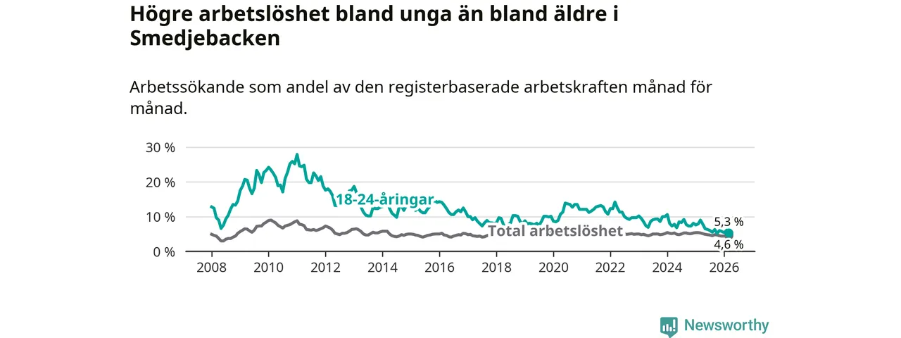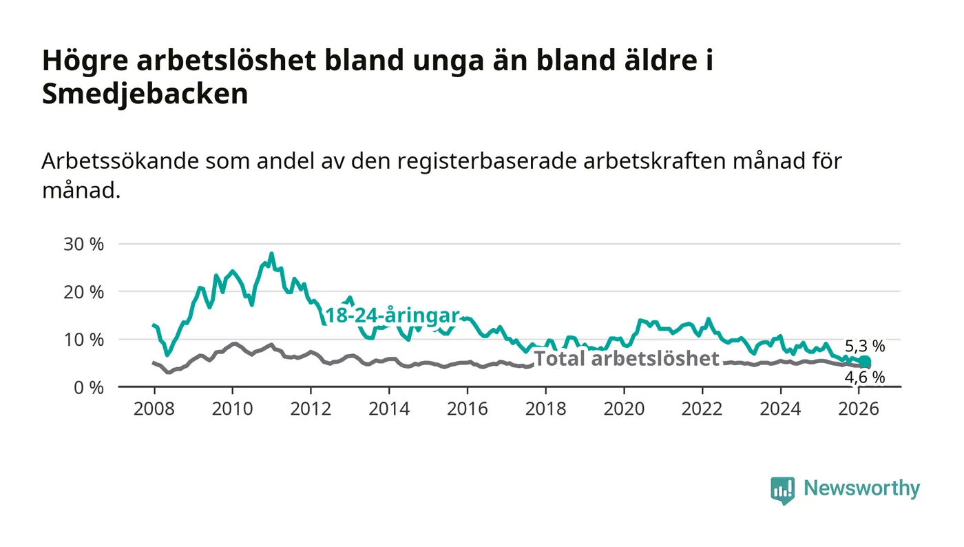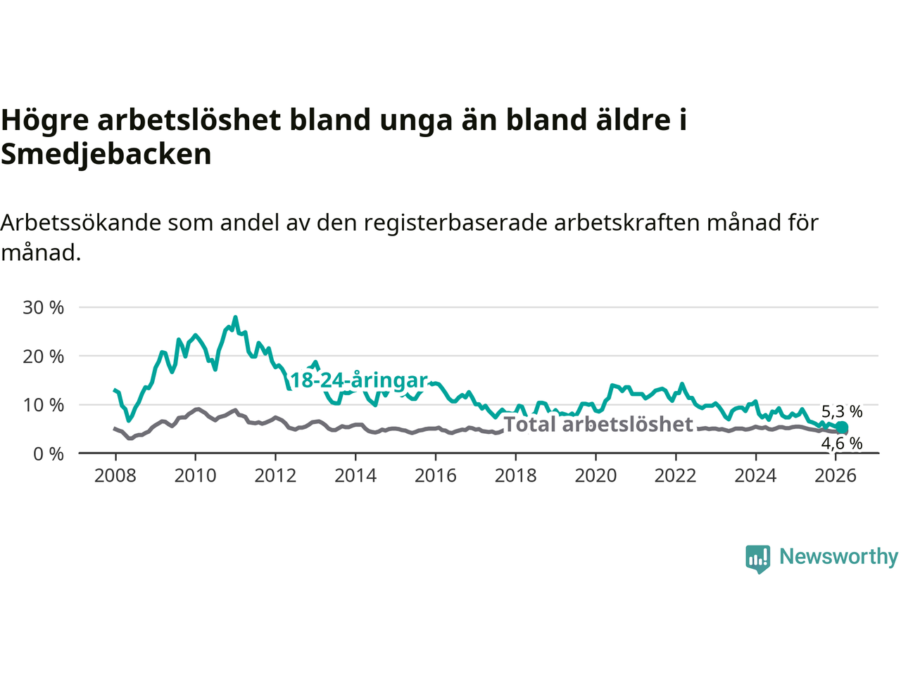 I och med den senaste månadens nedgång har de ungas arbetslöshet i Smedjebacken sjunkit elva månader i följd (ner från 7,8 procent i april 2025 till 5,3 procent nu).