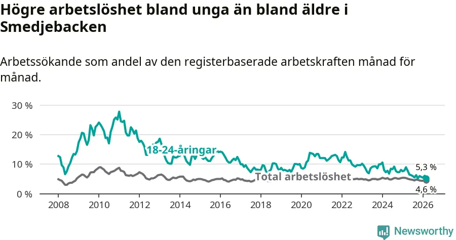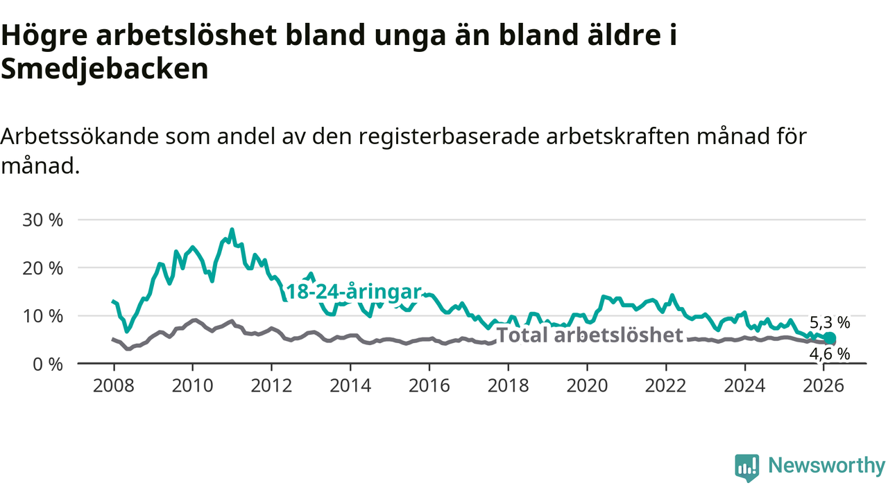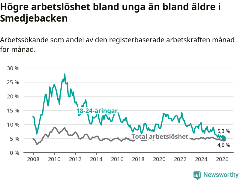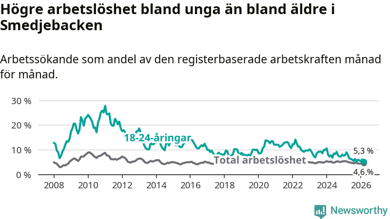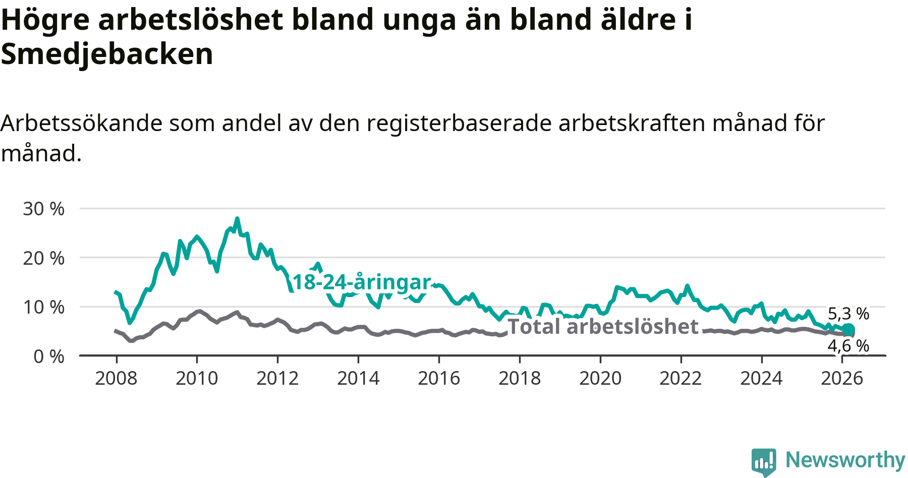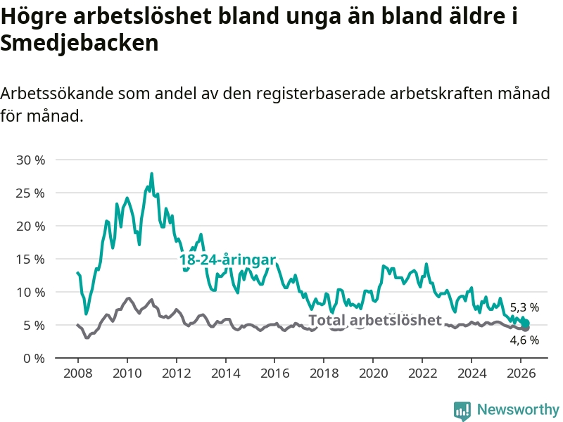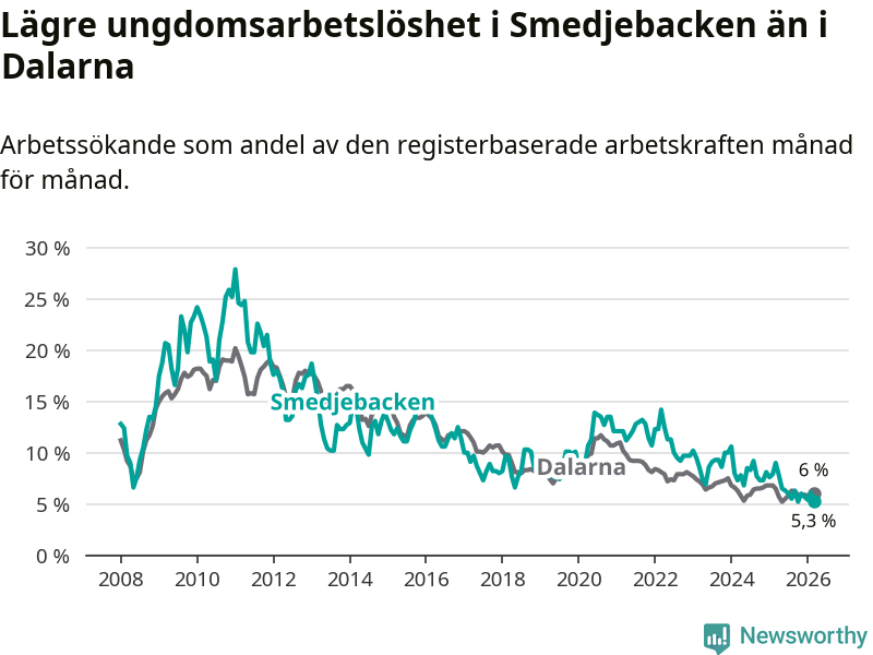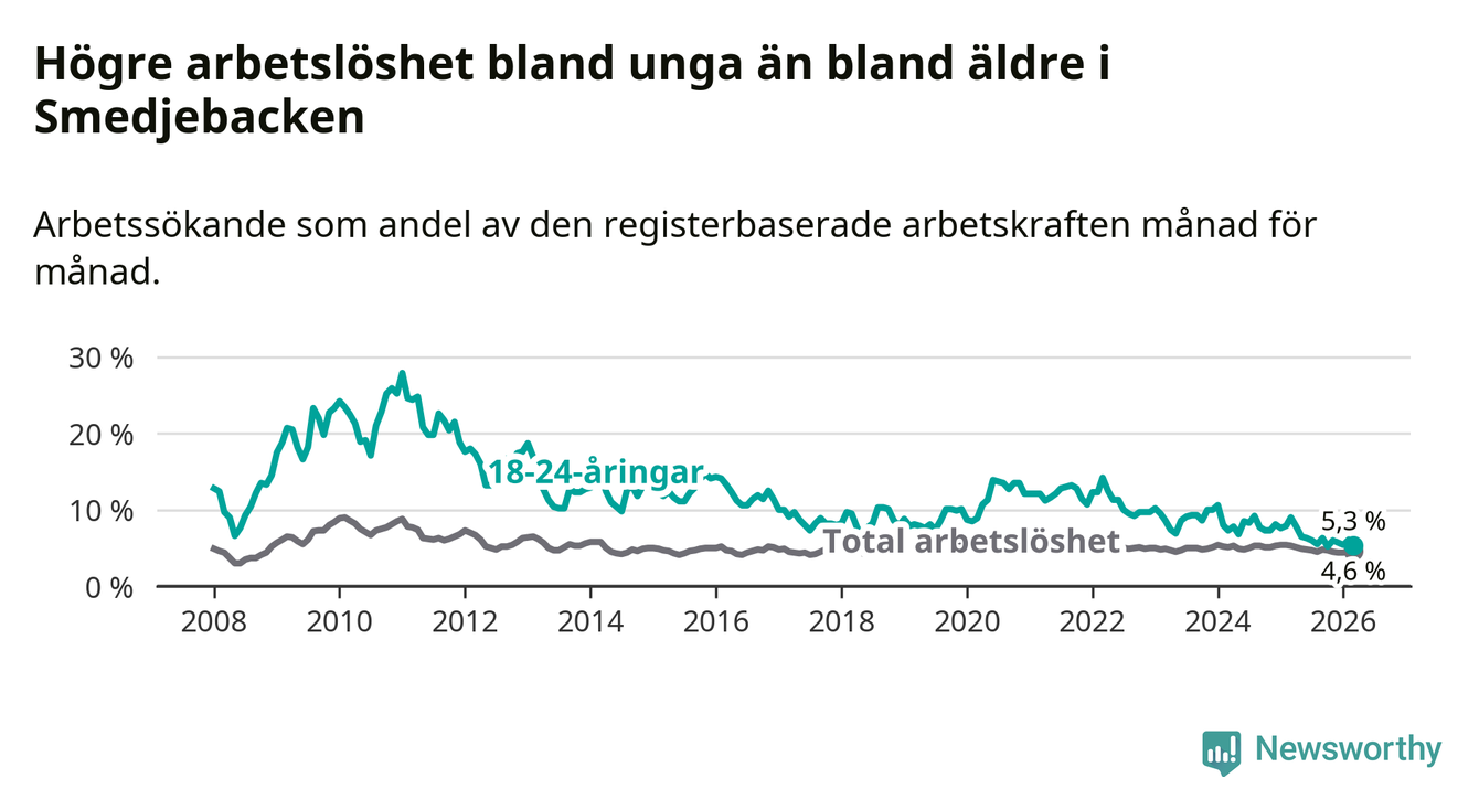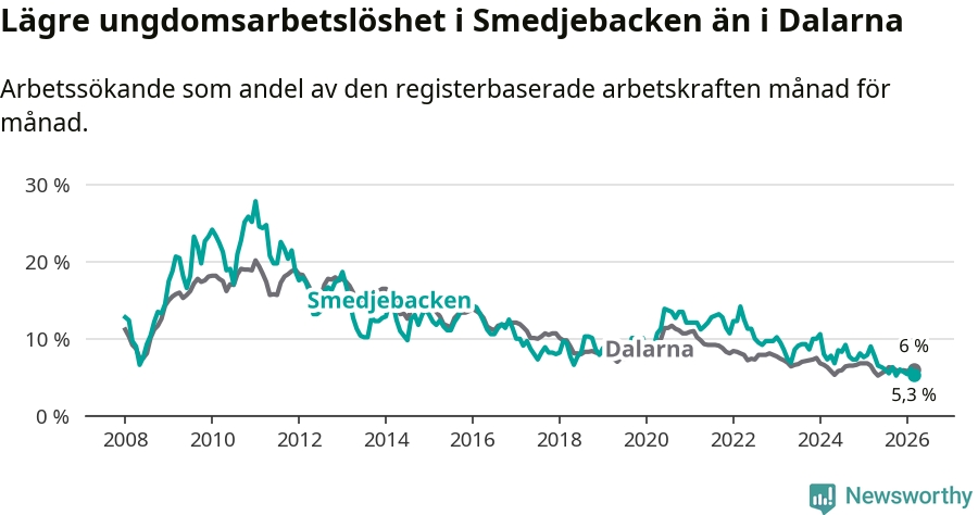 I och med den senaste månadens nedgång har de ungas arbetslöshet i Smedjebacken sjunkit elva månader i följd (ner från 7,8 procent i april 2025 till 5,3 procent nu).