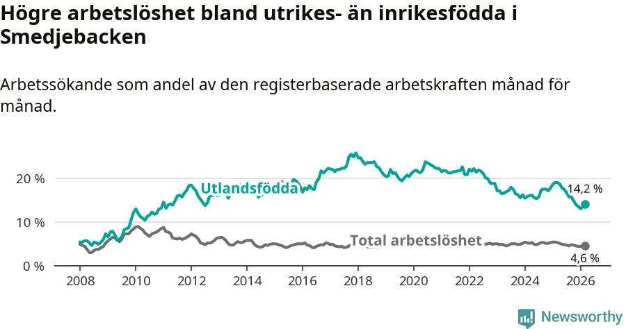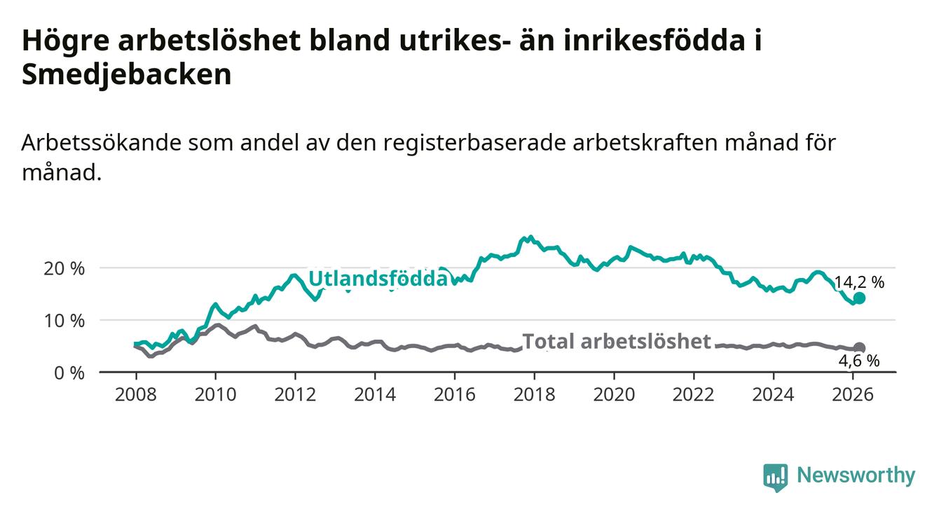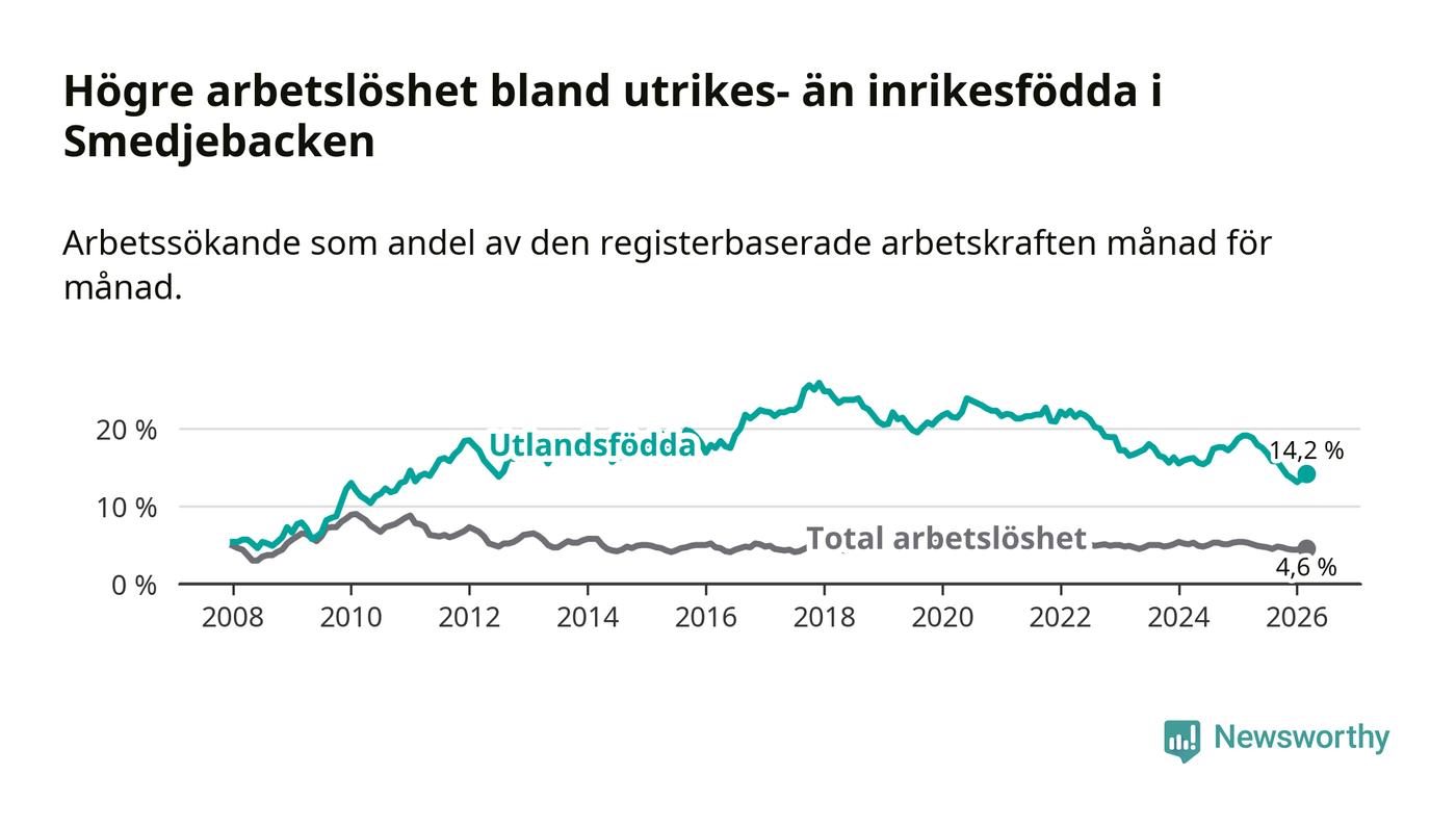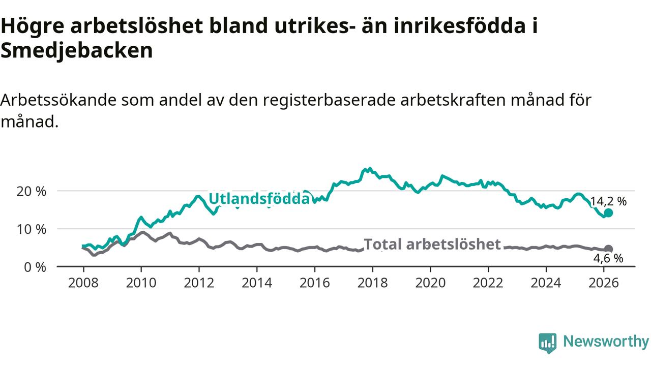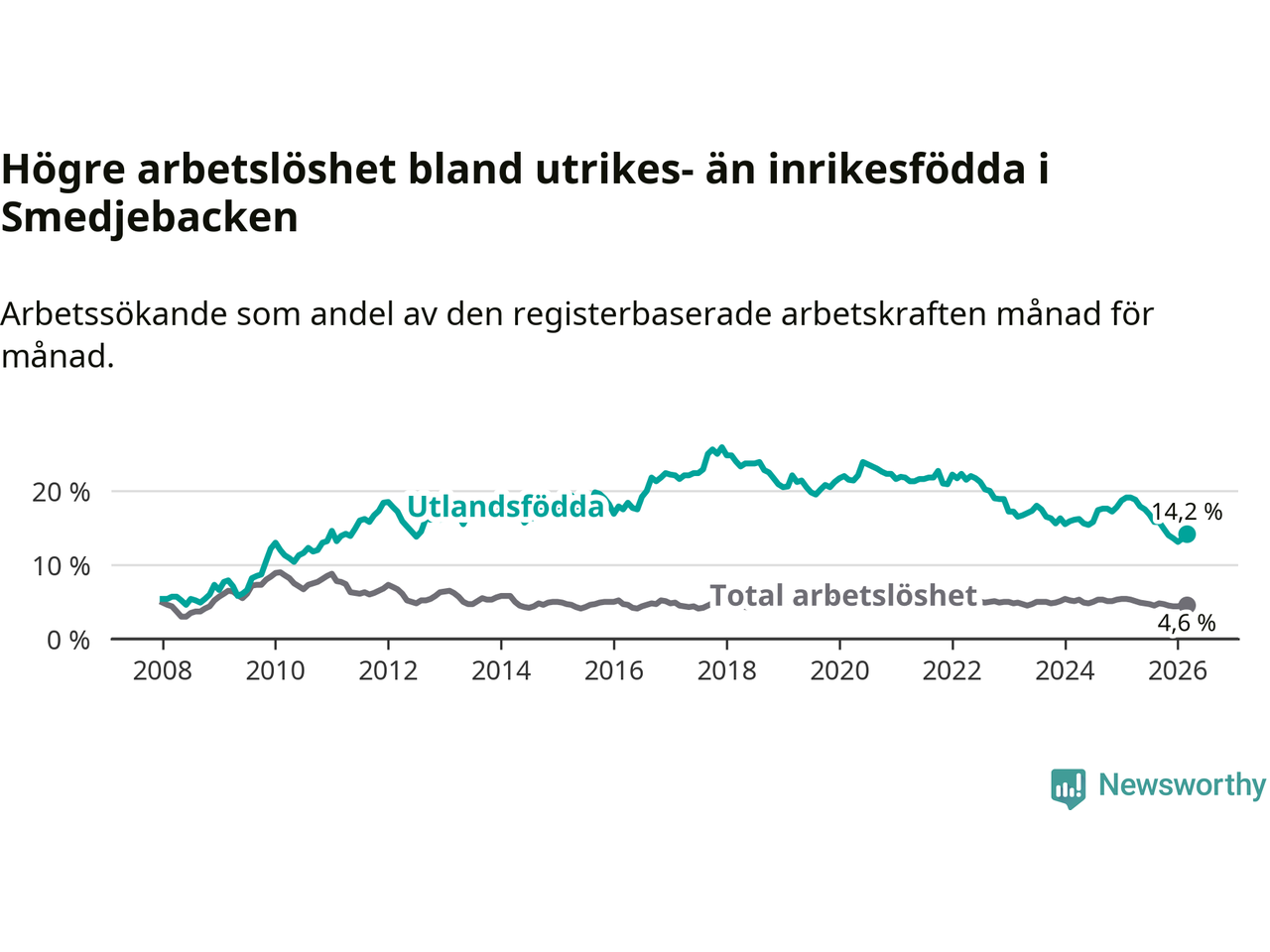 Arbetslösheten bland utlandsfödda var 14,2 procent i Smedjebacken under mars månad, motsvarande 73 av 514 personer. Det är 4,9 procentenheter färre än vid samma tidpunkt i fjol (−22 om man räknar personer). Därmed är de utlandsföddas arbetslöshet lägre än vid samma tidpunkt i fjol för åttonde månaden i följd. Sedan juli 2025 har arbetslösheten bland utlandsfödda minskat från 16,8 till 14,2 procent.