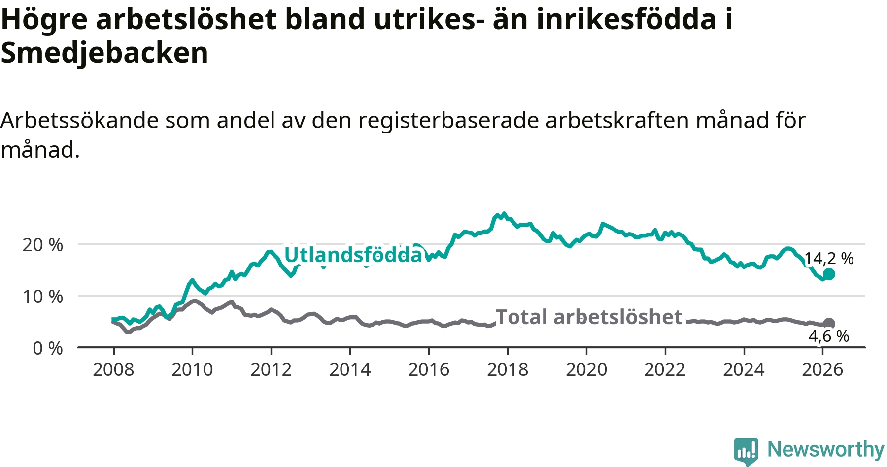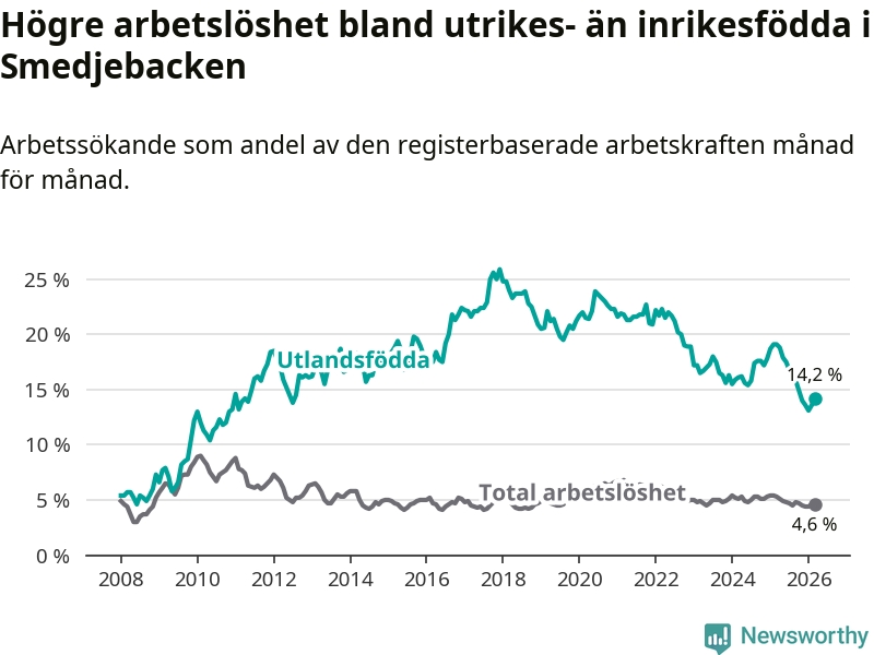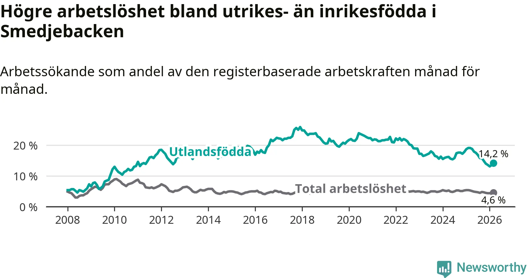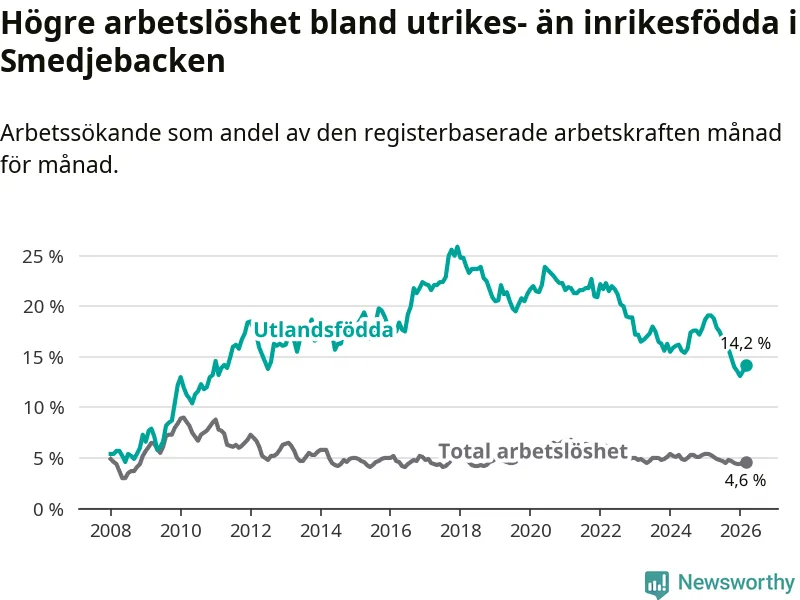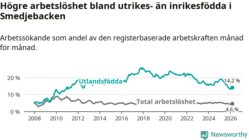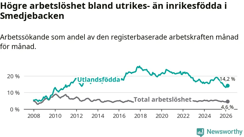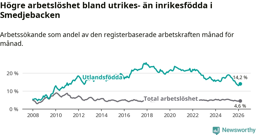 Arbetslösheten bland utlandsfödda var 14,2 procent i Smedjebacken under mars månad, motsvarande 73 av 514 personer. Det är 4,9 procentenheter färre än vid samma tidpunkt i fjol (−22 om man räknar personer). Därmed är de utlandsföddas arbetslöshet lägre än vid samma tidpunkt i fjol för åttonde månaden i följd. Sedan juli 2025 har arbetslösheten bland utlandsfödda minskat från 16,8 till 14,2 procent.
