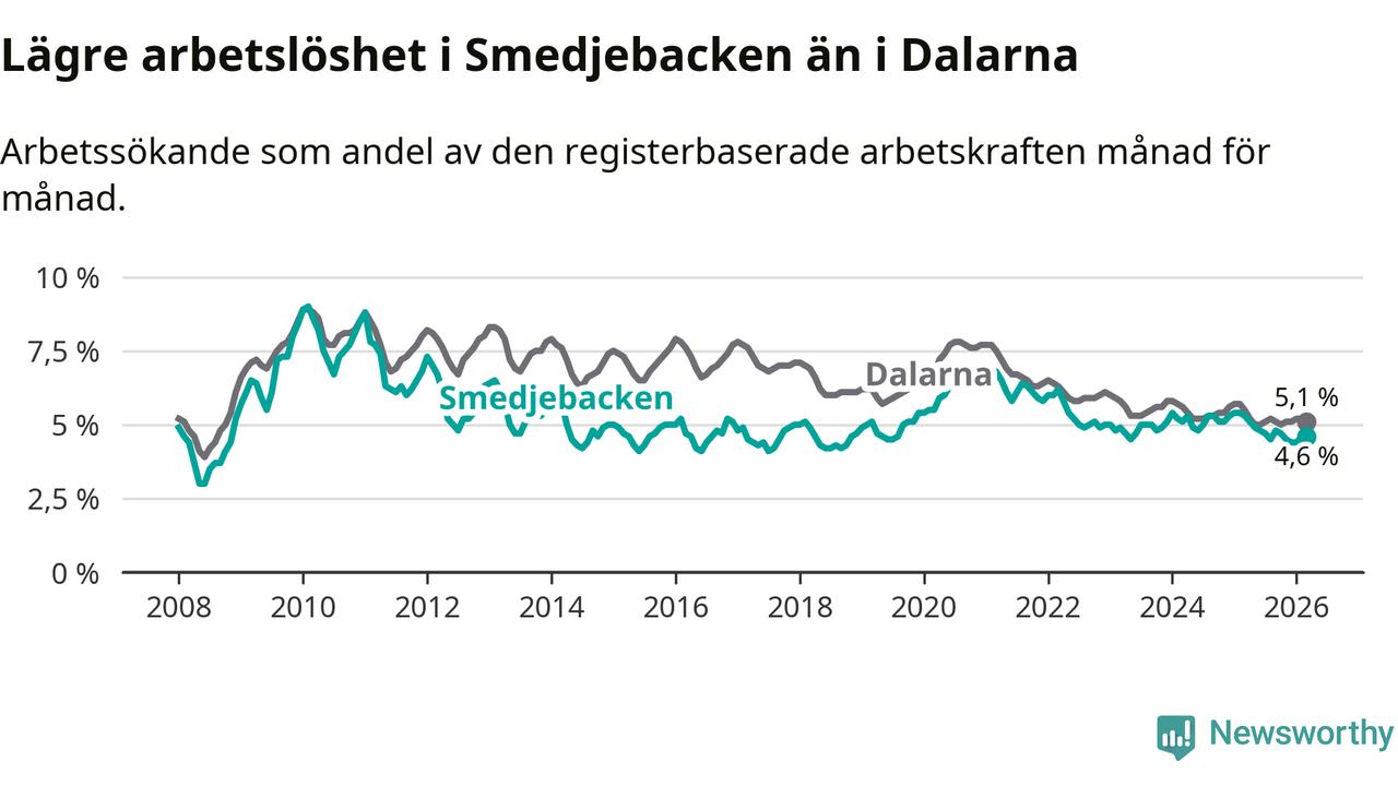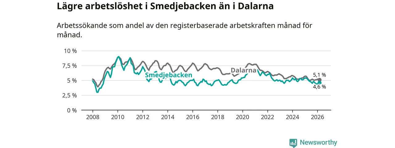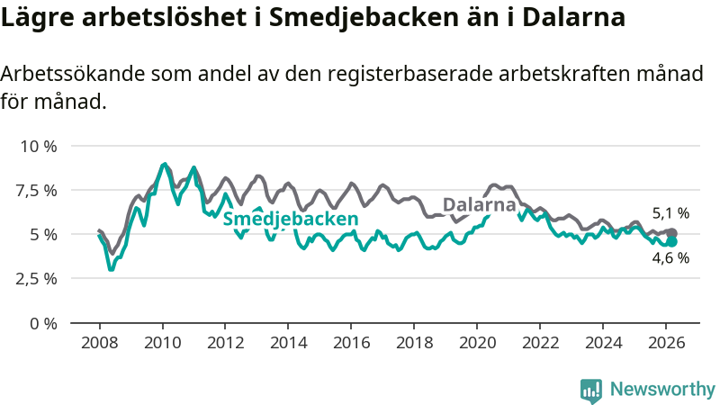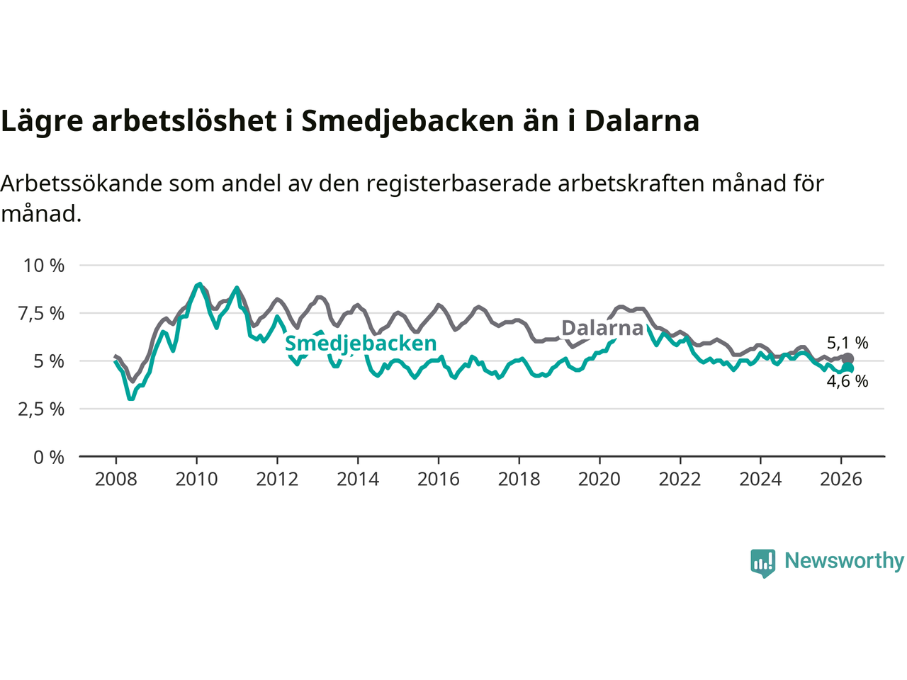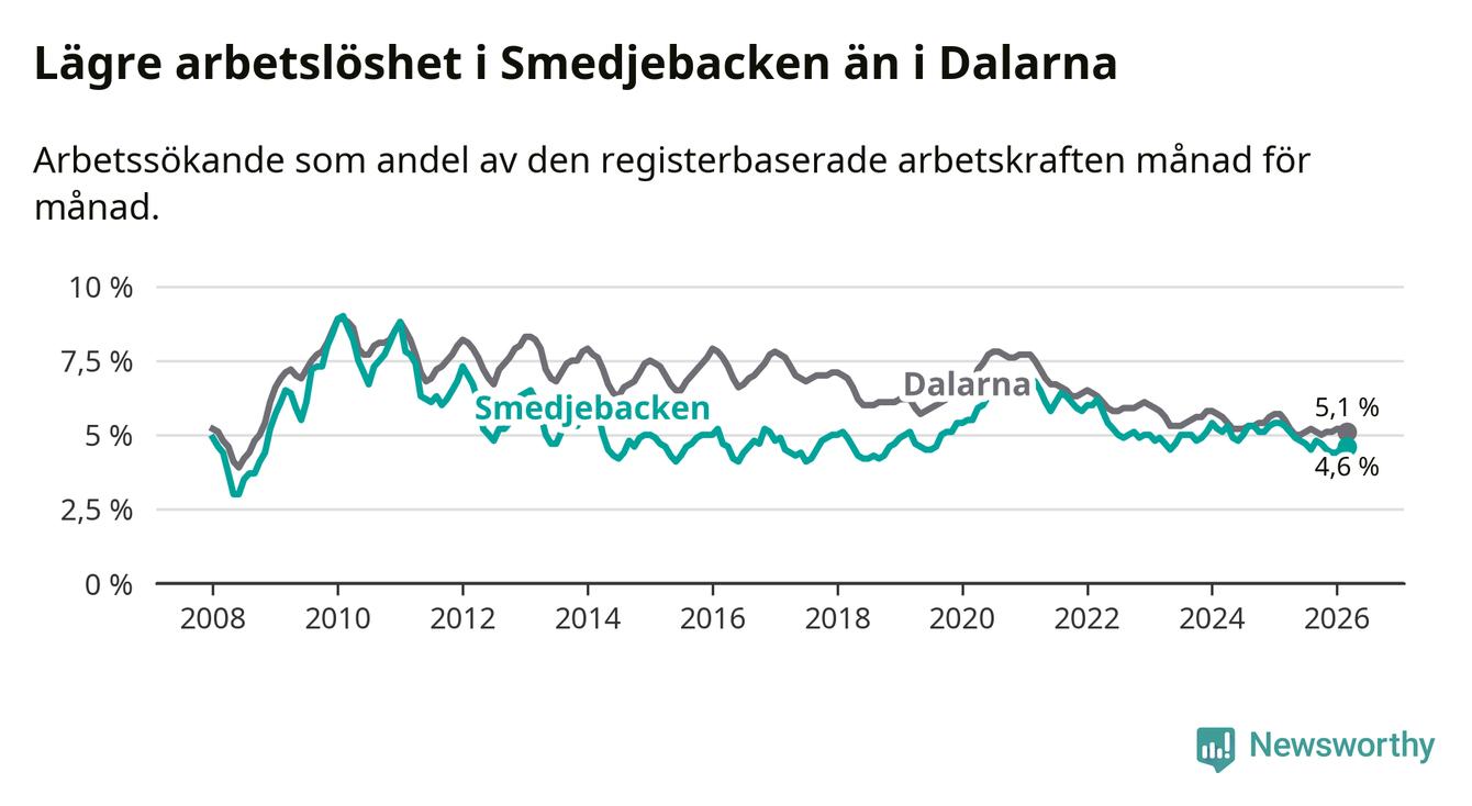 Under mars månad rapporterade Smedjebackens kommun en total arbetslöshet på 4,6 procent. Det är en minskning jämfört med samma tidpunkt i fjol (−0,7 procentenheter). Även i Dalarnas län sjunker arbetslösheten .