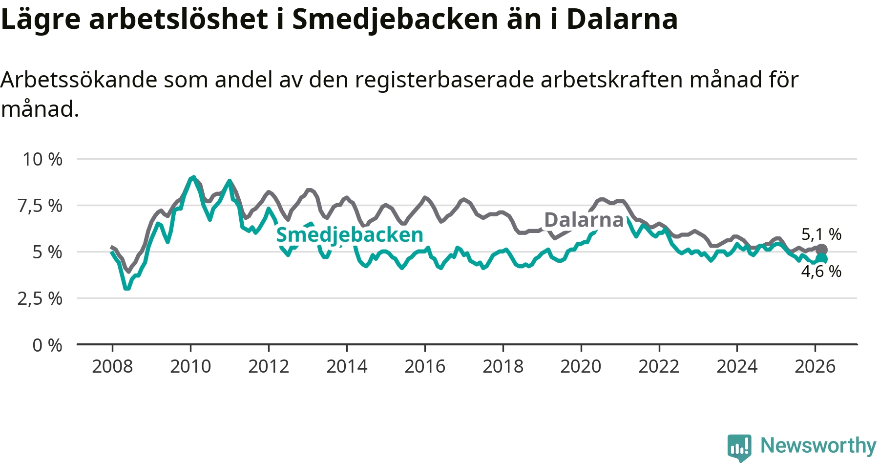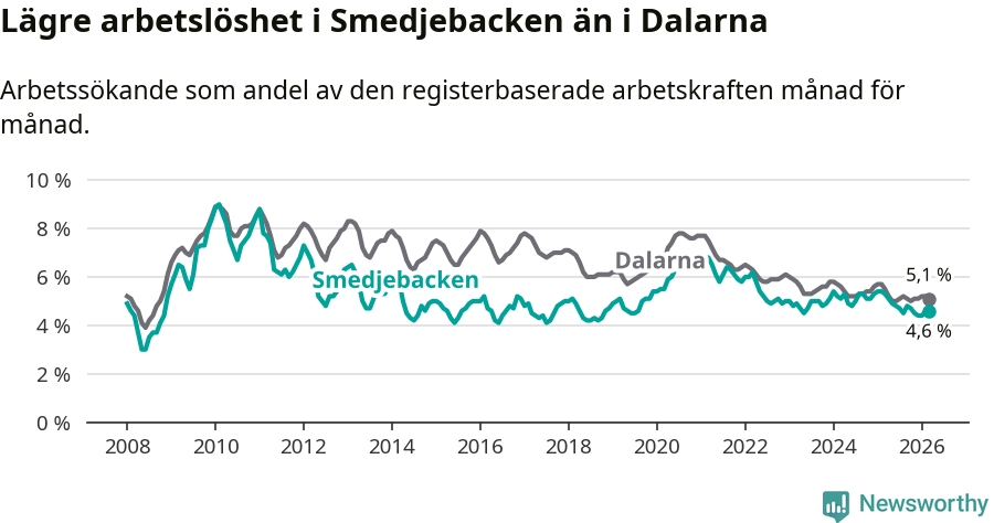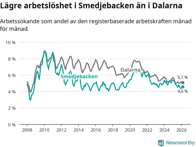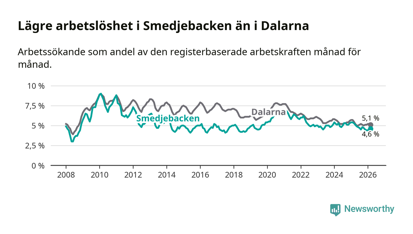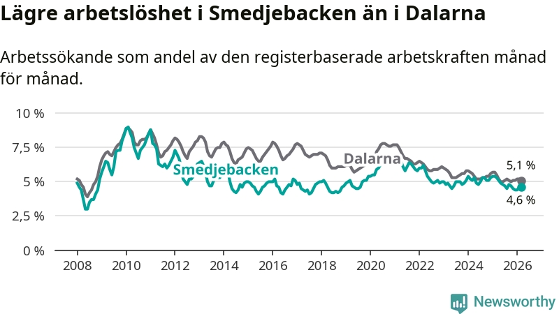 Under mars månad rapporterade Smedjebackens kommun en total arbetslöshet på 4,6 procent. Det är en minskning jämfört med samma tidpunkt i fjol (−0,7 procentenheter). Även i Dalarnas län sjunker arbetslösheten .