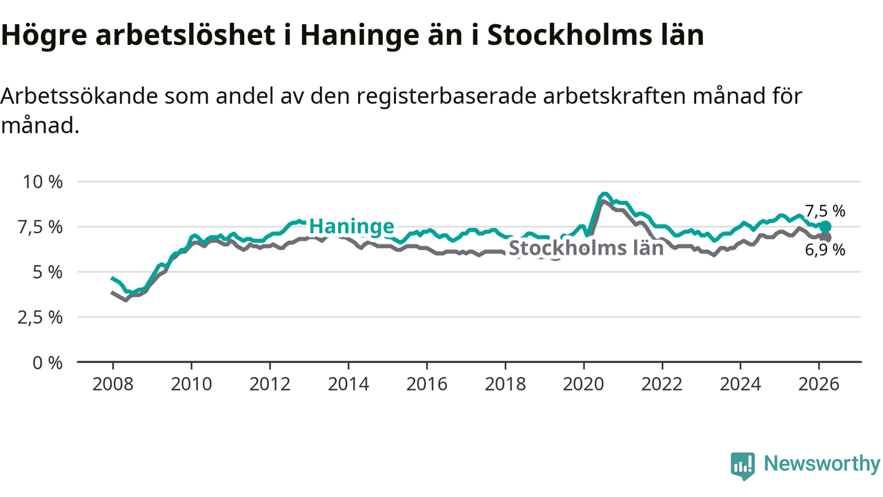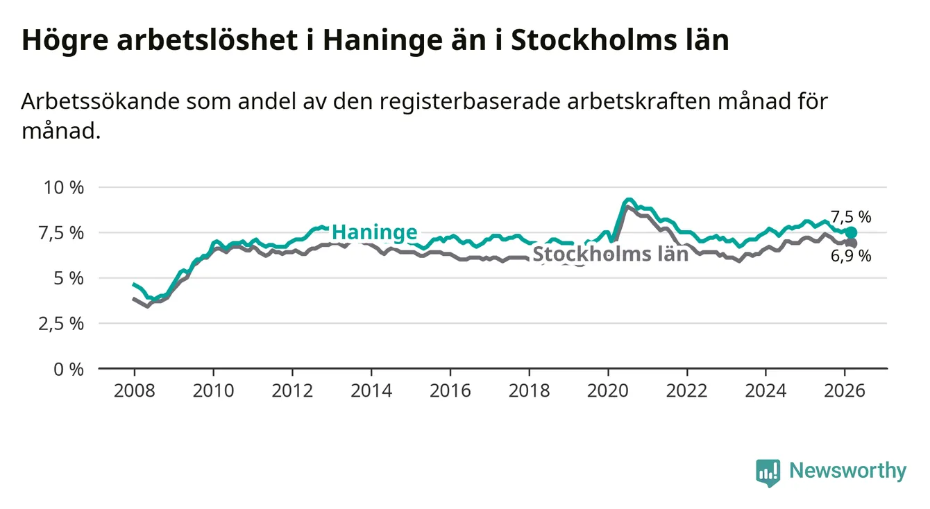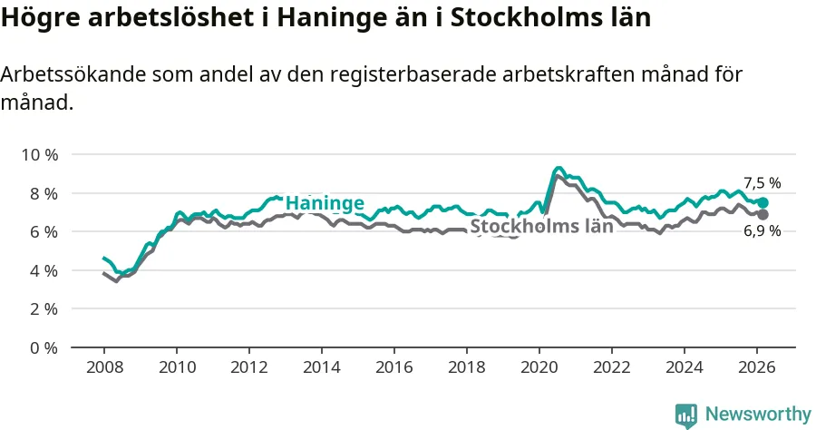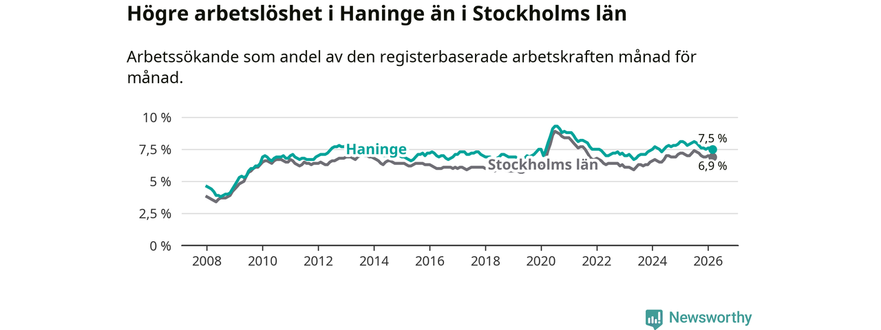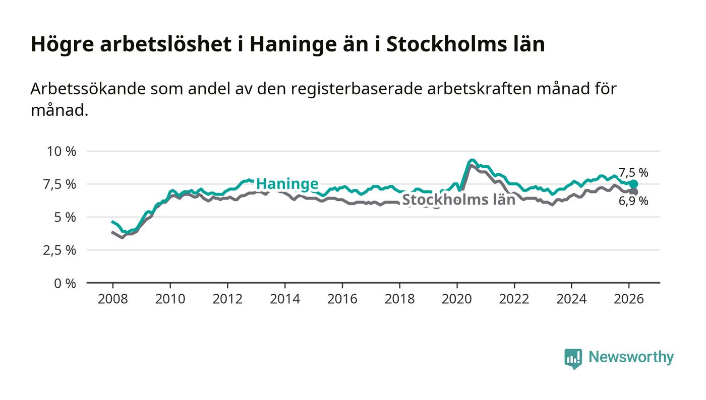Under mars månad rapporterade Haninge kommun en total arbetslöshet på 7,5 procent. Det är en minskning jämfört med samma tidpunkt i fjol (−0,5 procentenheter). Även i Stockholms län sjunker arbetslösheten något.