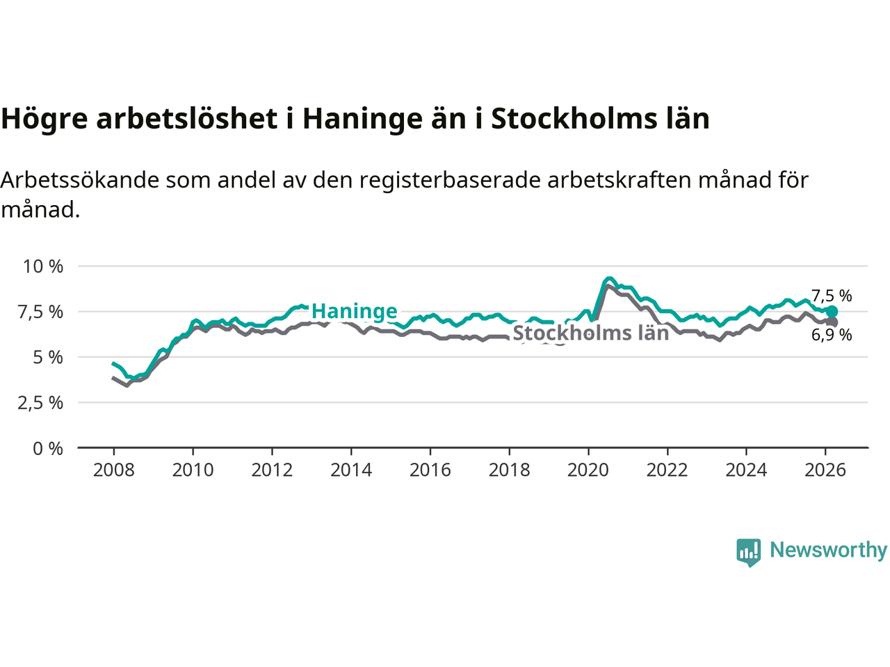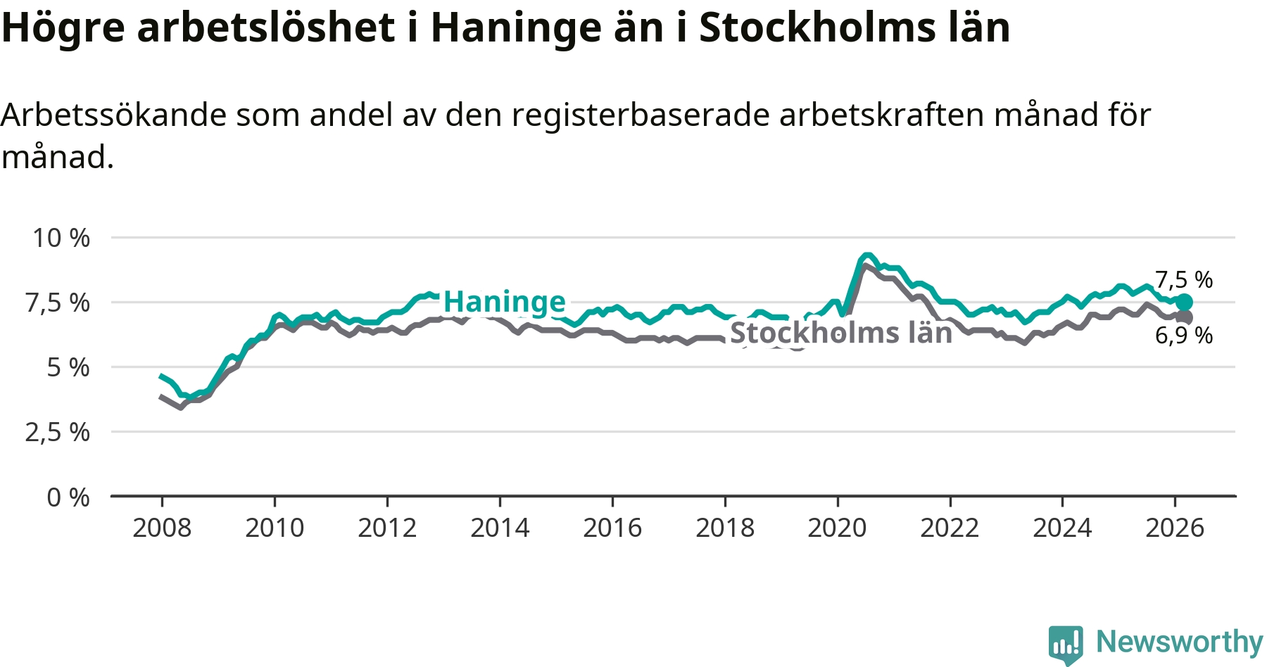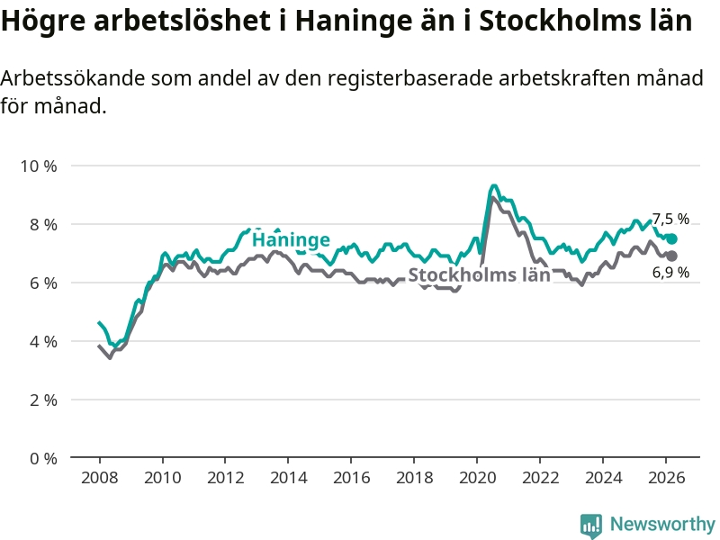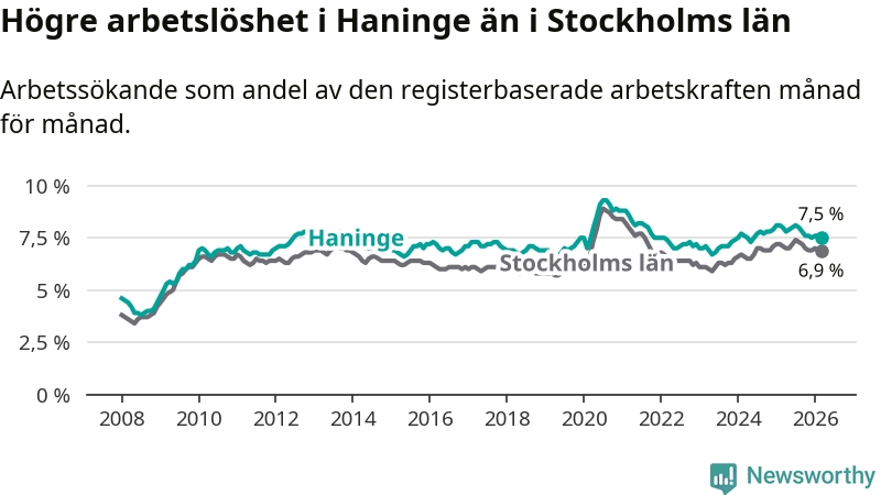 Under mars månad rapporterade Haninge kommun en total arbetslöshet på 7,5 procent. Det är en minskning jämfört med samma tidpunkt i fjol (−0,5 procentenheter). Även i Stockholms län sjunker arbetslösheten något.