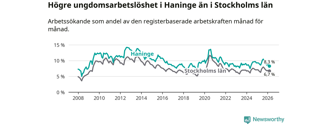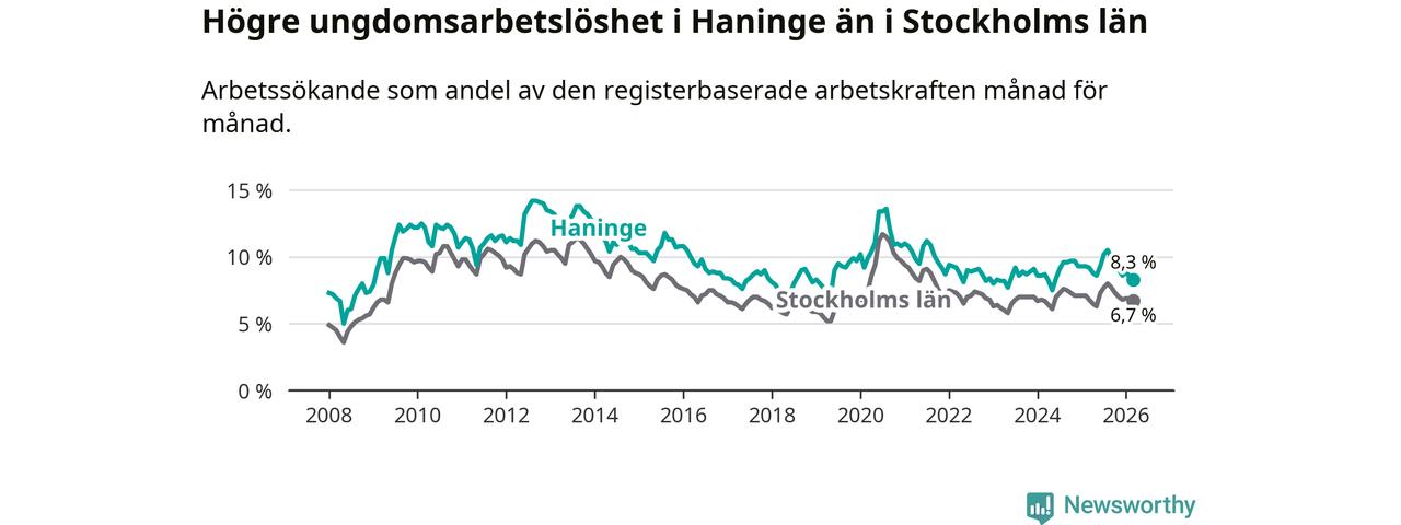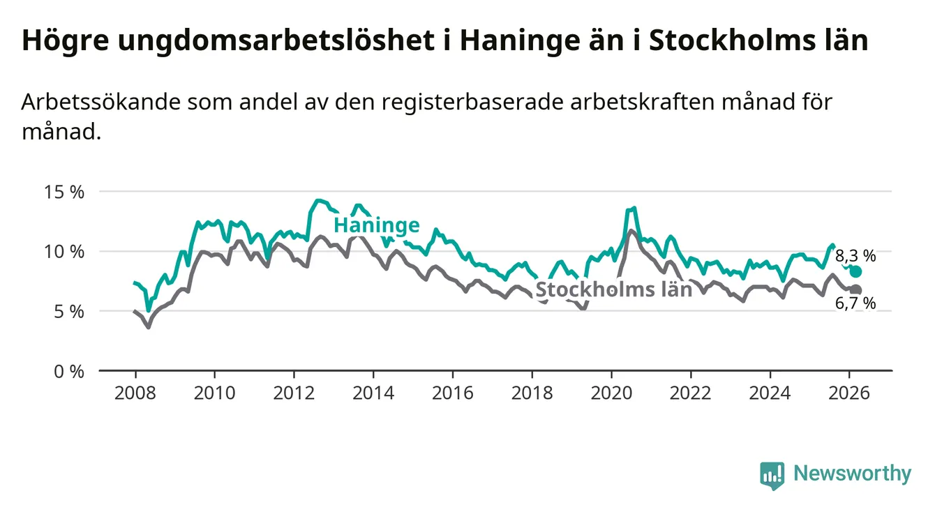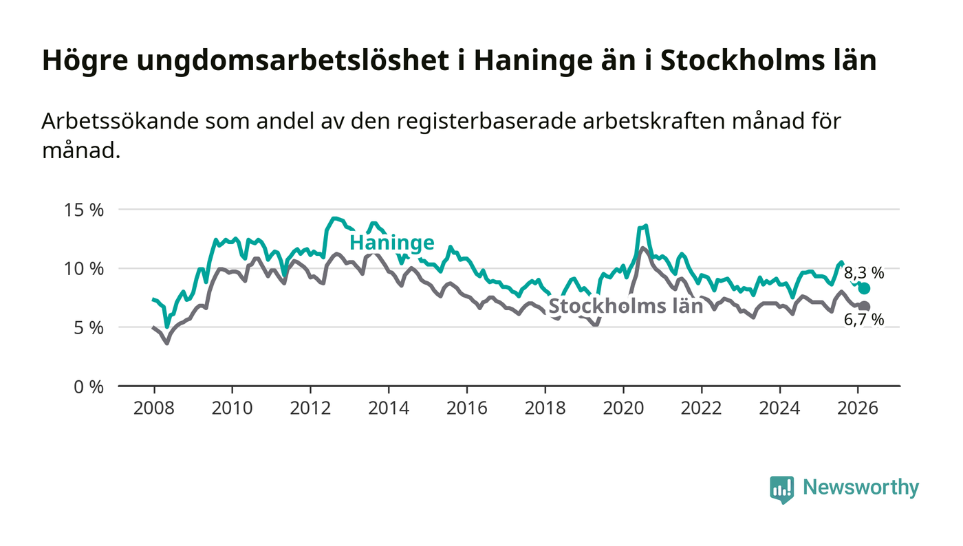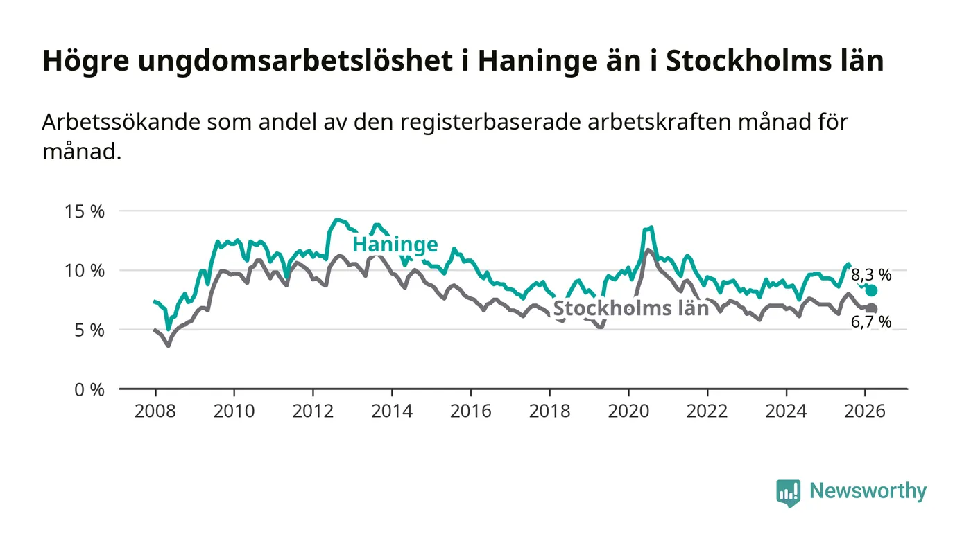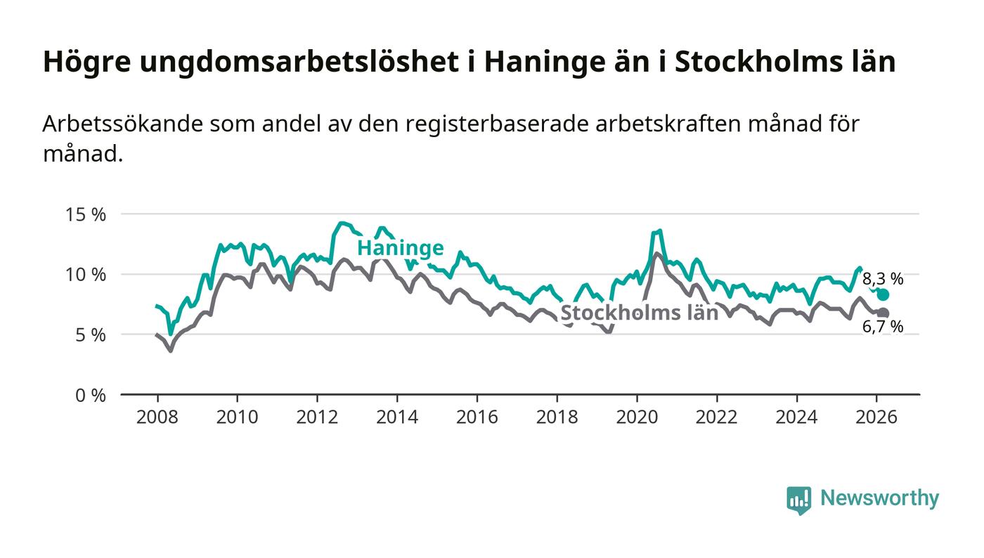 Precis som den totala arbetslösheten ligger ungdomsarbetslösheten i Haninge högre än i Stockholms län som helhet. Skillnaden mellan kommunen och länet är 1,6 procentenheter.