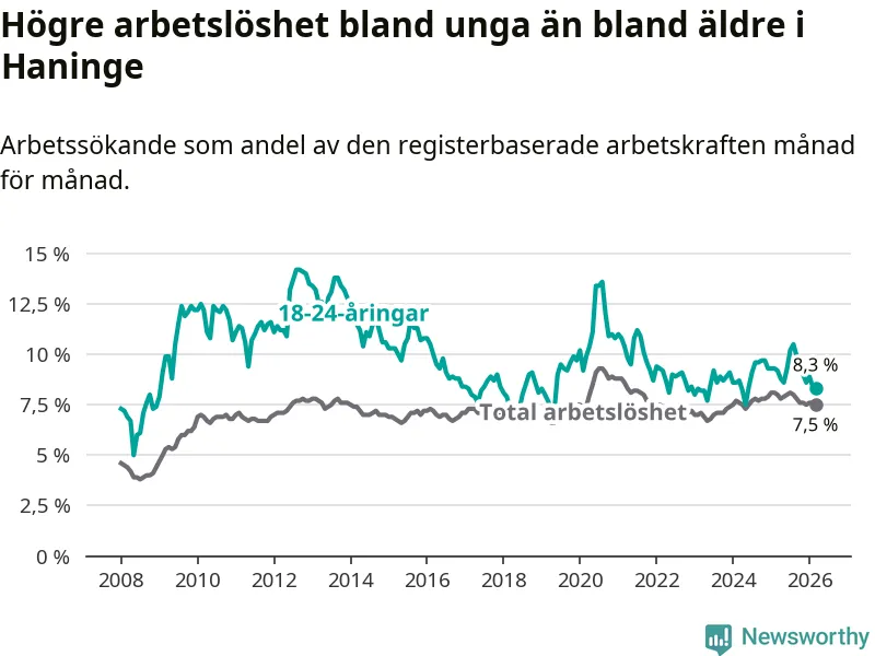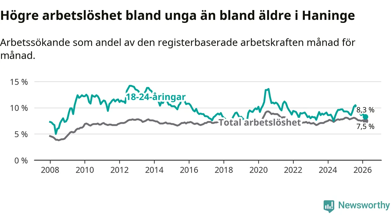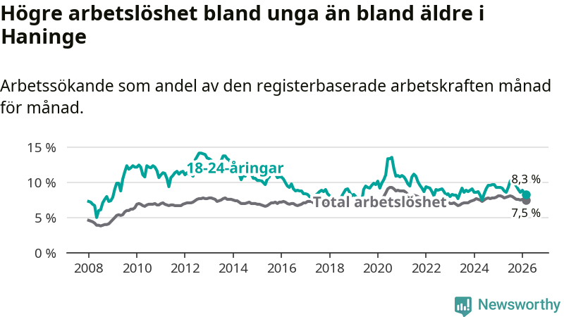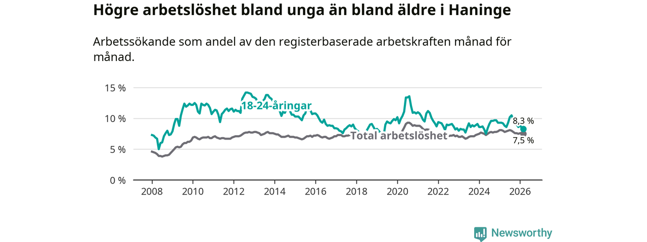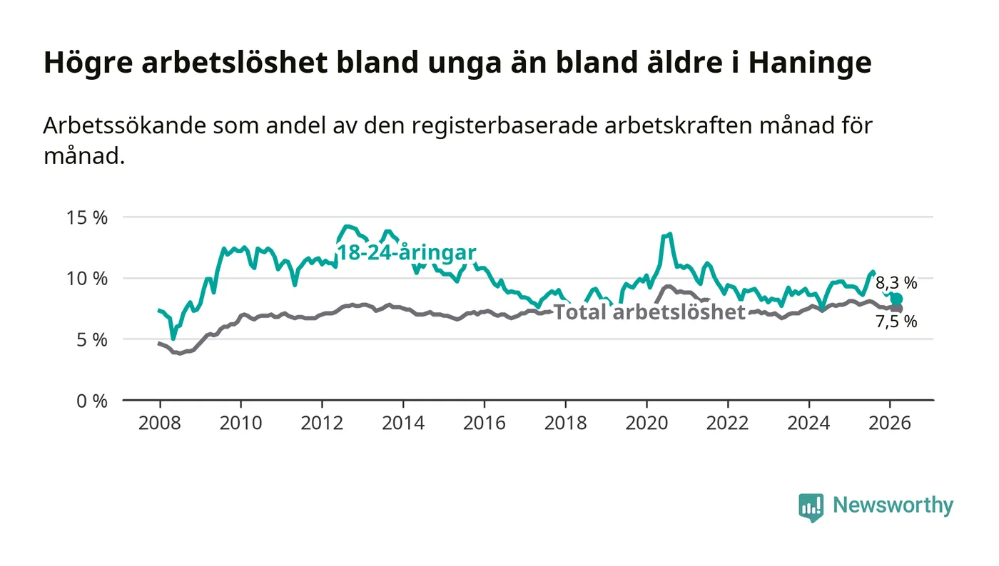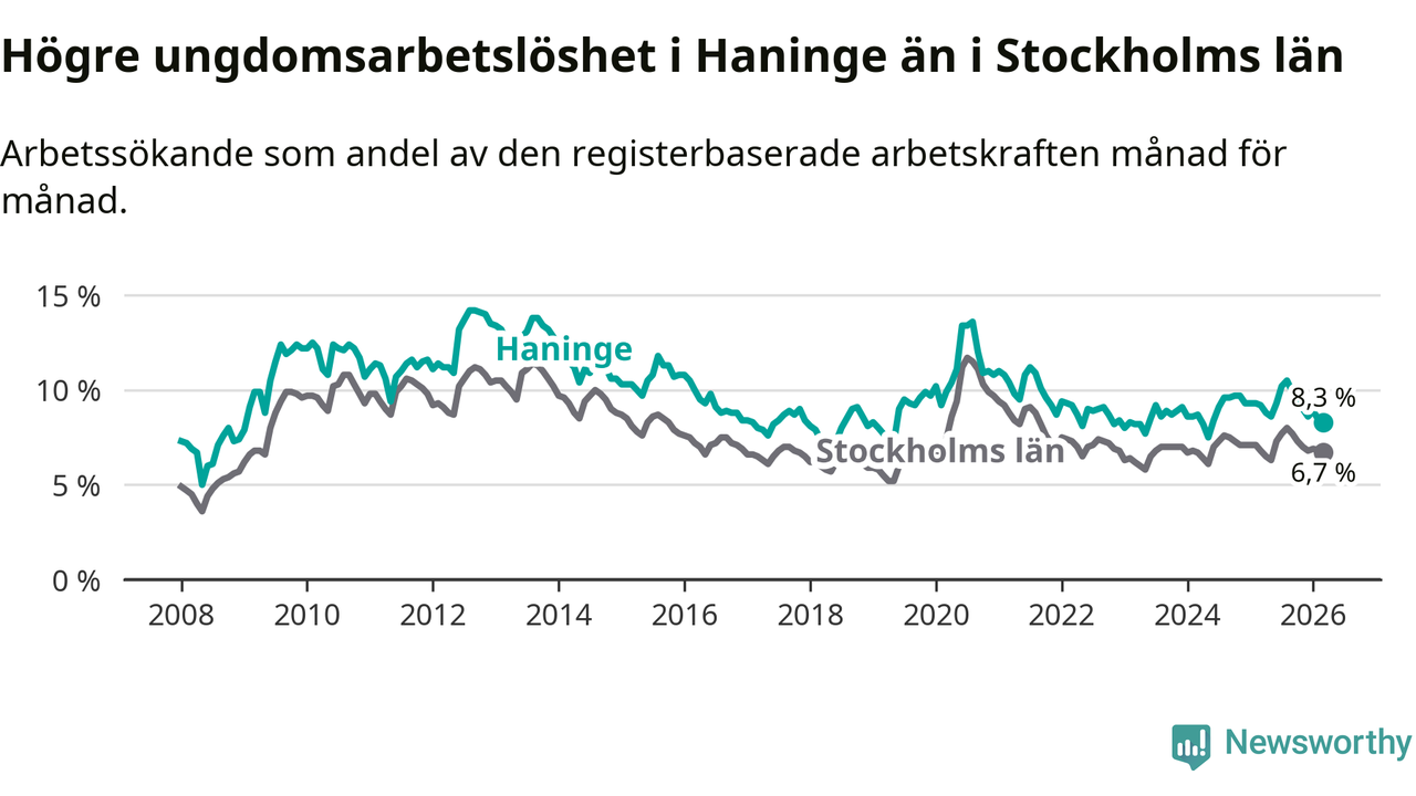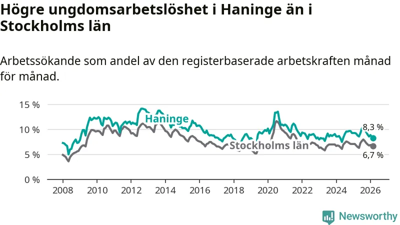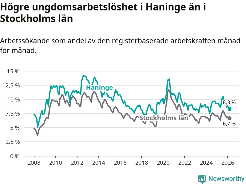 Precis som den totala arbetslösheten ligger ungdomsarbetslösheten i Haninge högre än i Stockholms län som helhet. Skillnaden mellan kommunen och länet är 1,6 procentenheter.