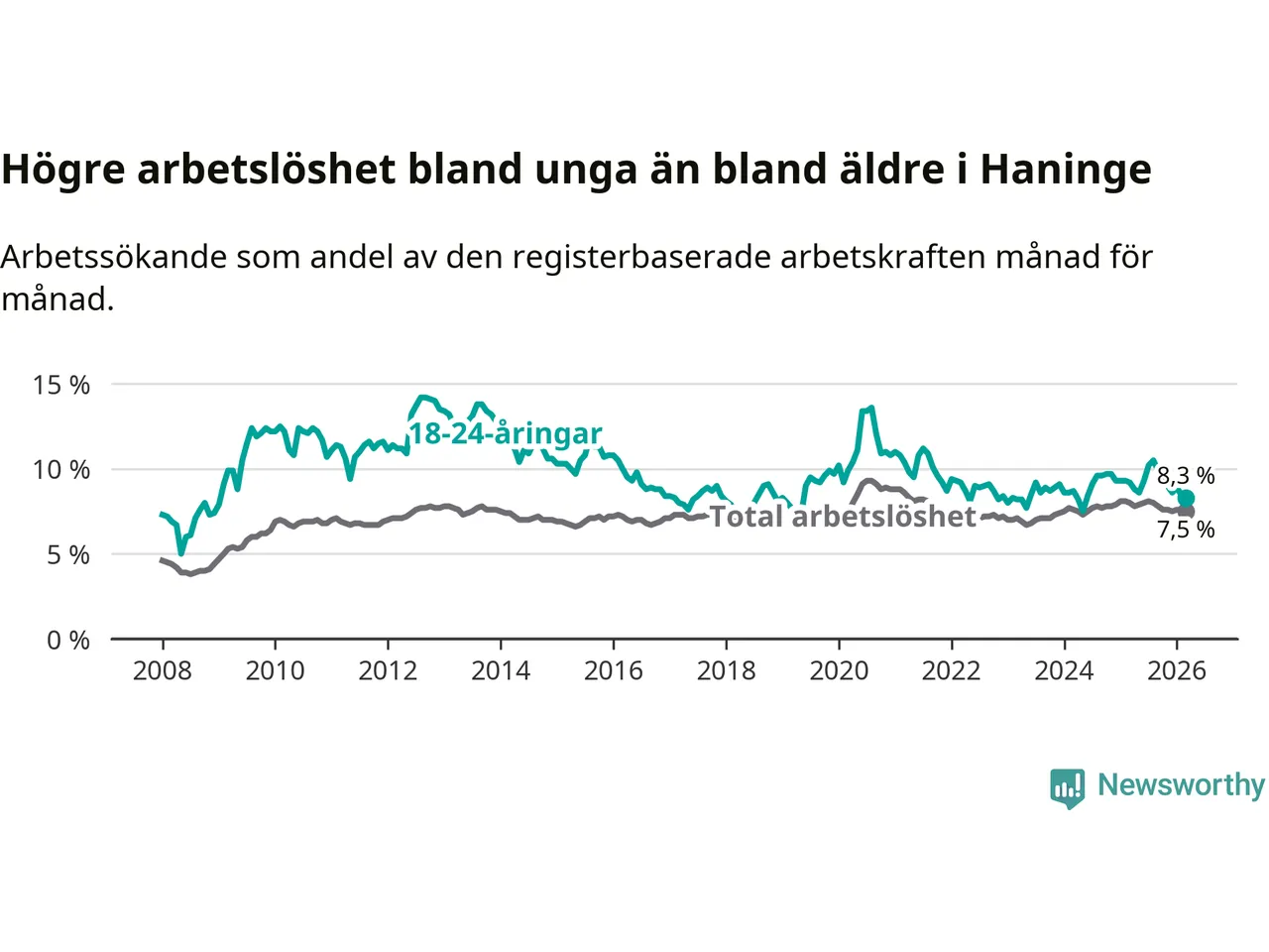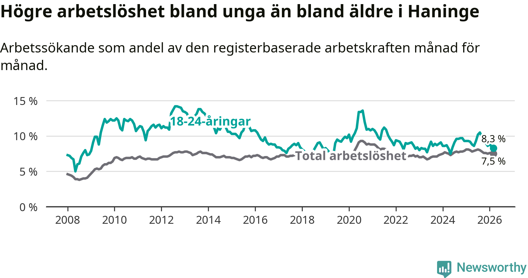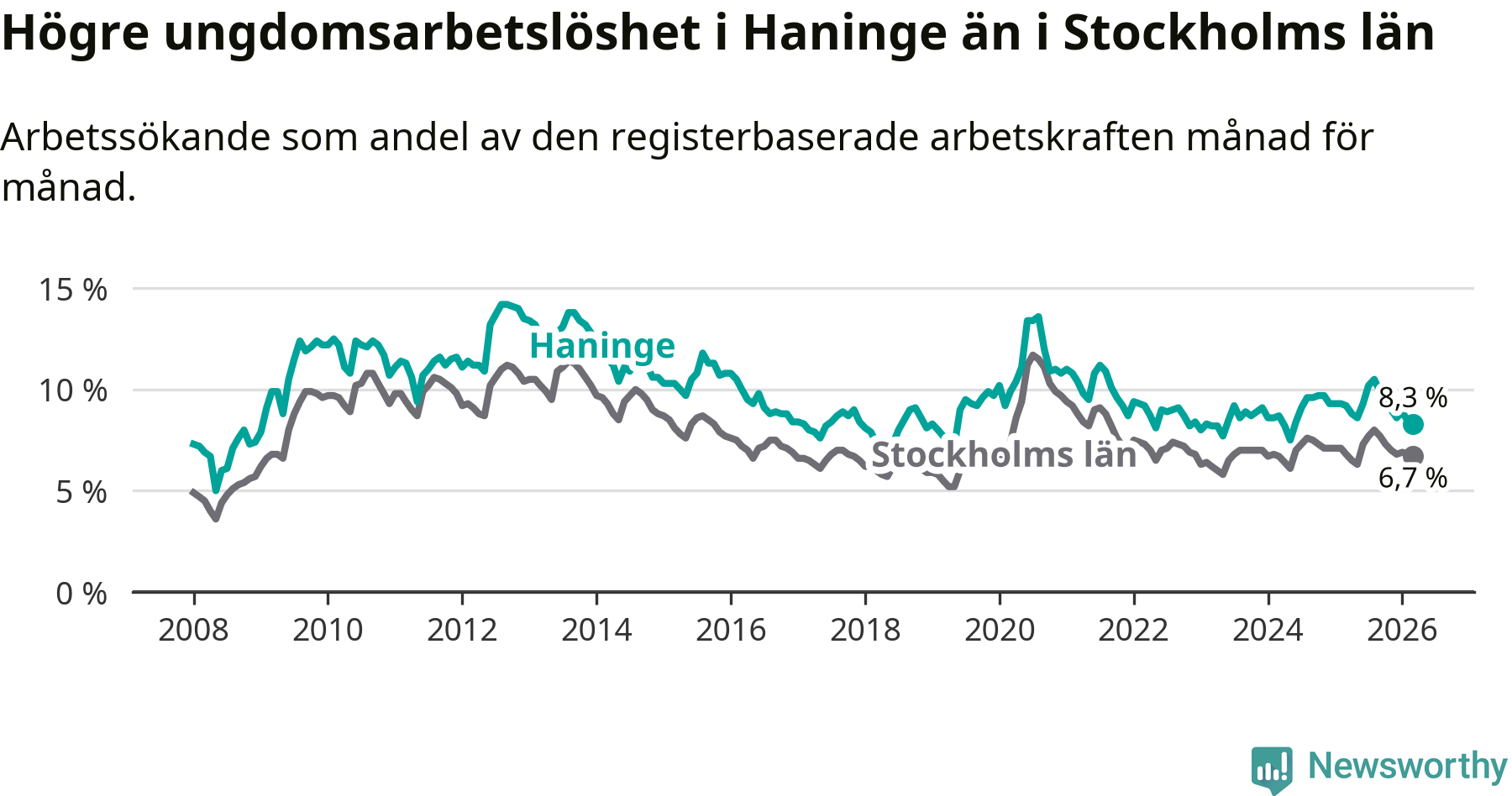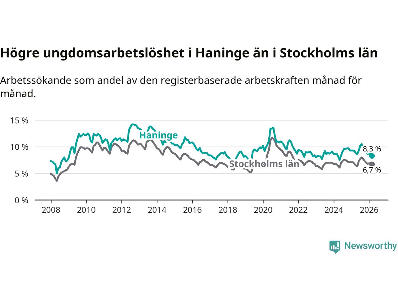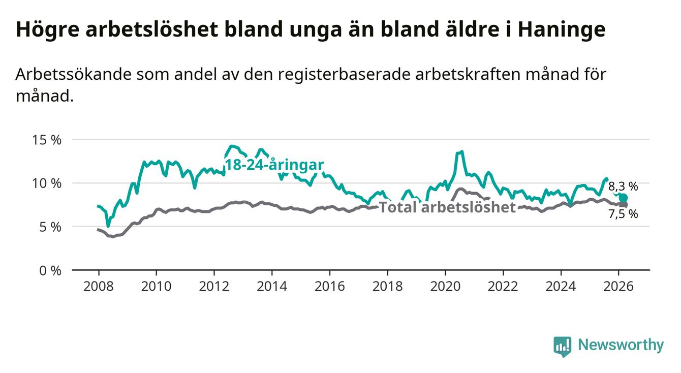 Precis som den totala arbetslösheten ligger ungdomsarbetslösheten i Haninge högre än i Stockholms län som helhet. Skillnaden mellan kommunen och länet är 1,6 procentenheter.
