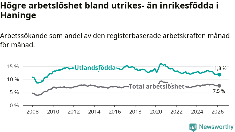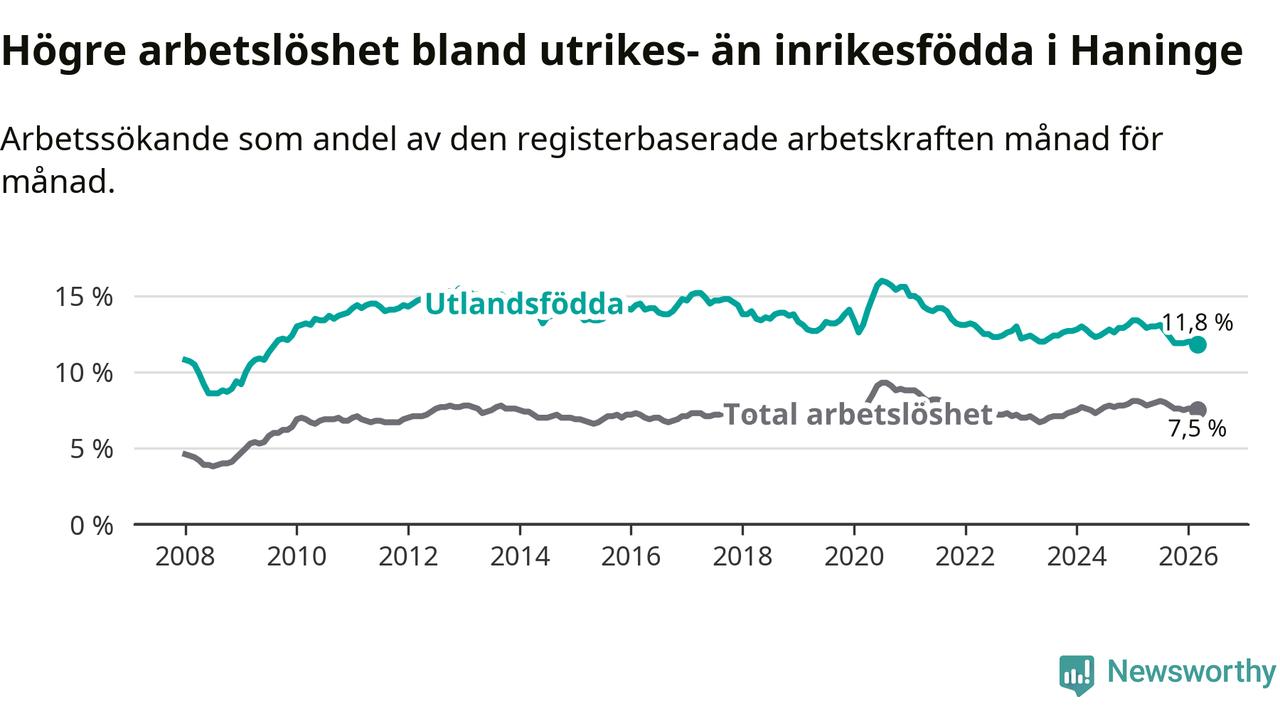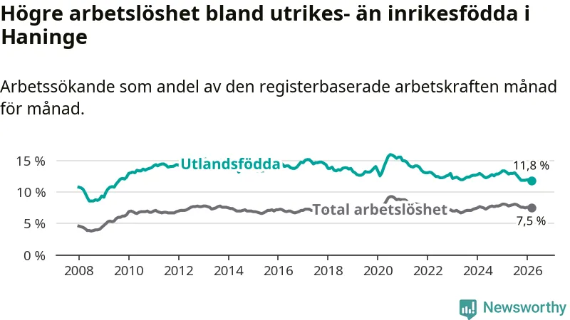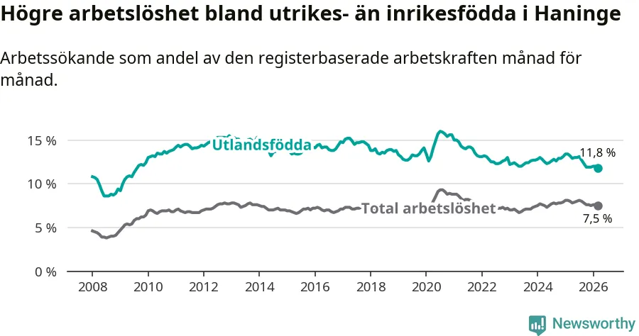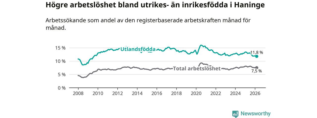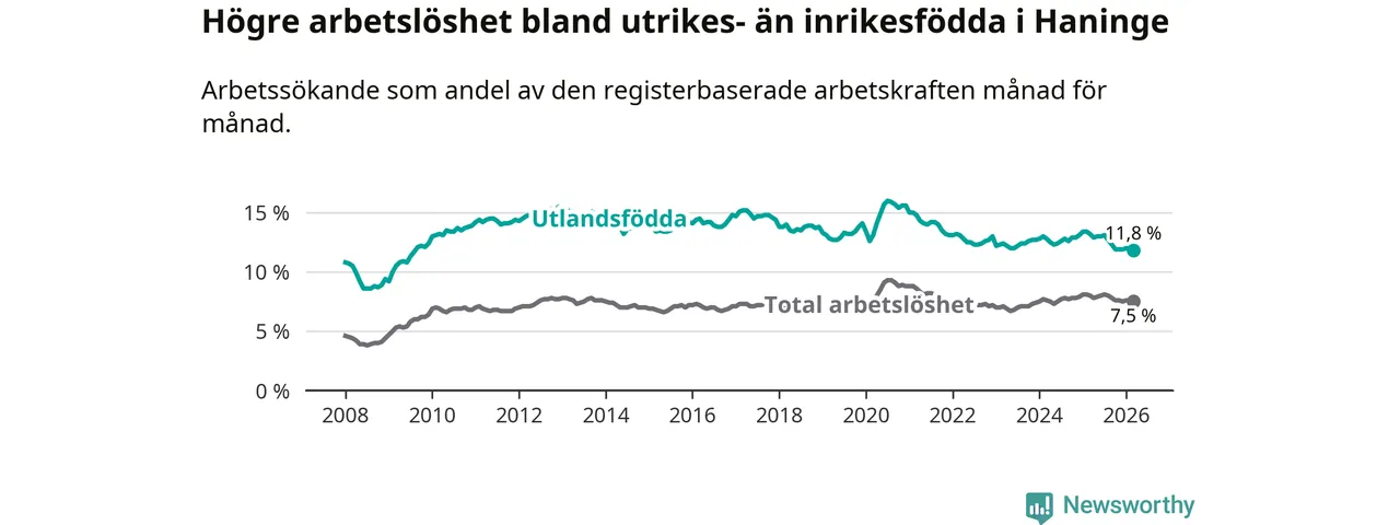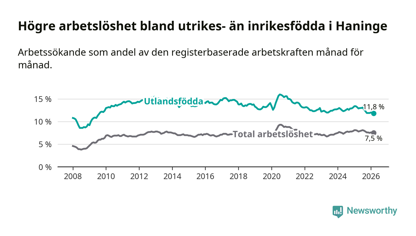 Arbetslösheten bland utlandsfödda var 11,8 procent i Haninge under mars månad, motsvarande 2 337 av 19 805 personer. Det är 1,4 procentenheter färre än vid samma tidpunkt i fjol (−189 om man räknar personer). Därmed är de utlandsföddas arbetslöshet lägre än vid samma tidpunkt i fjol för åttonde månaden i följd. Sedan juli 2025 har arbetslösheten bland utlandsfödda minskat från 13,1 till 11,8 procent. Den nuvarande arbetslöshetsnivån är den lägsta sedan augusti 2009.