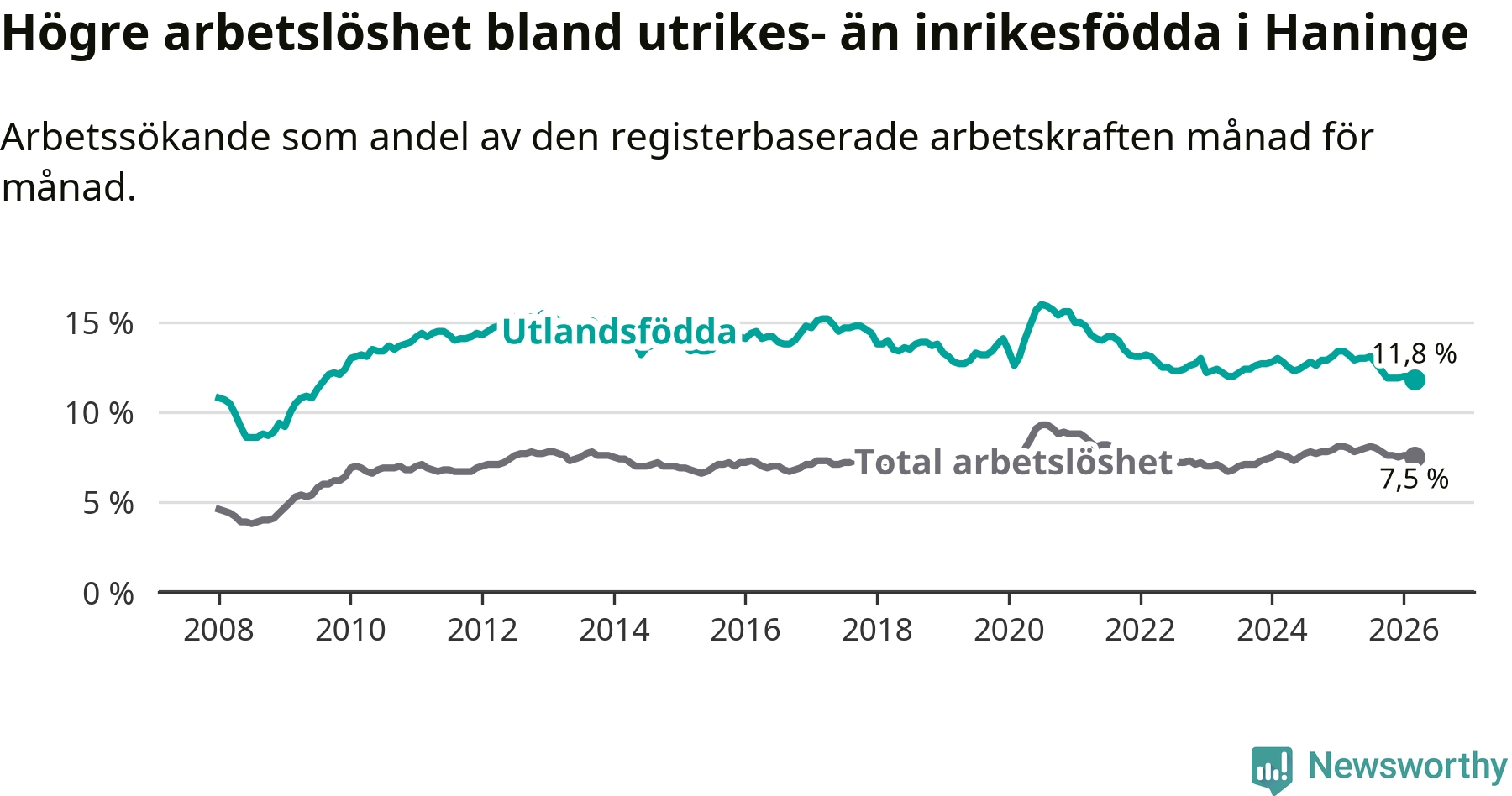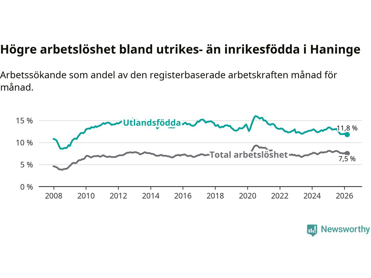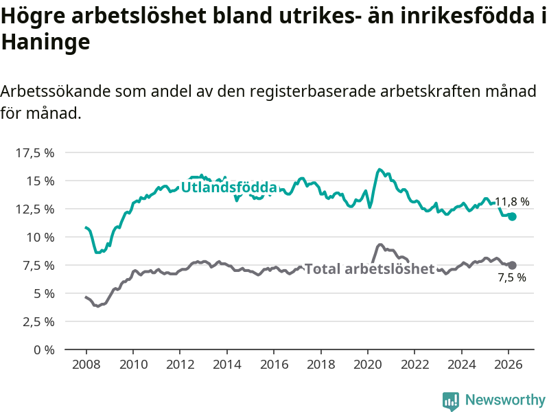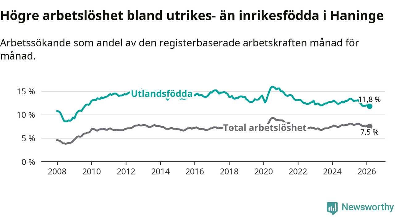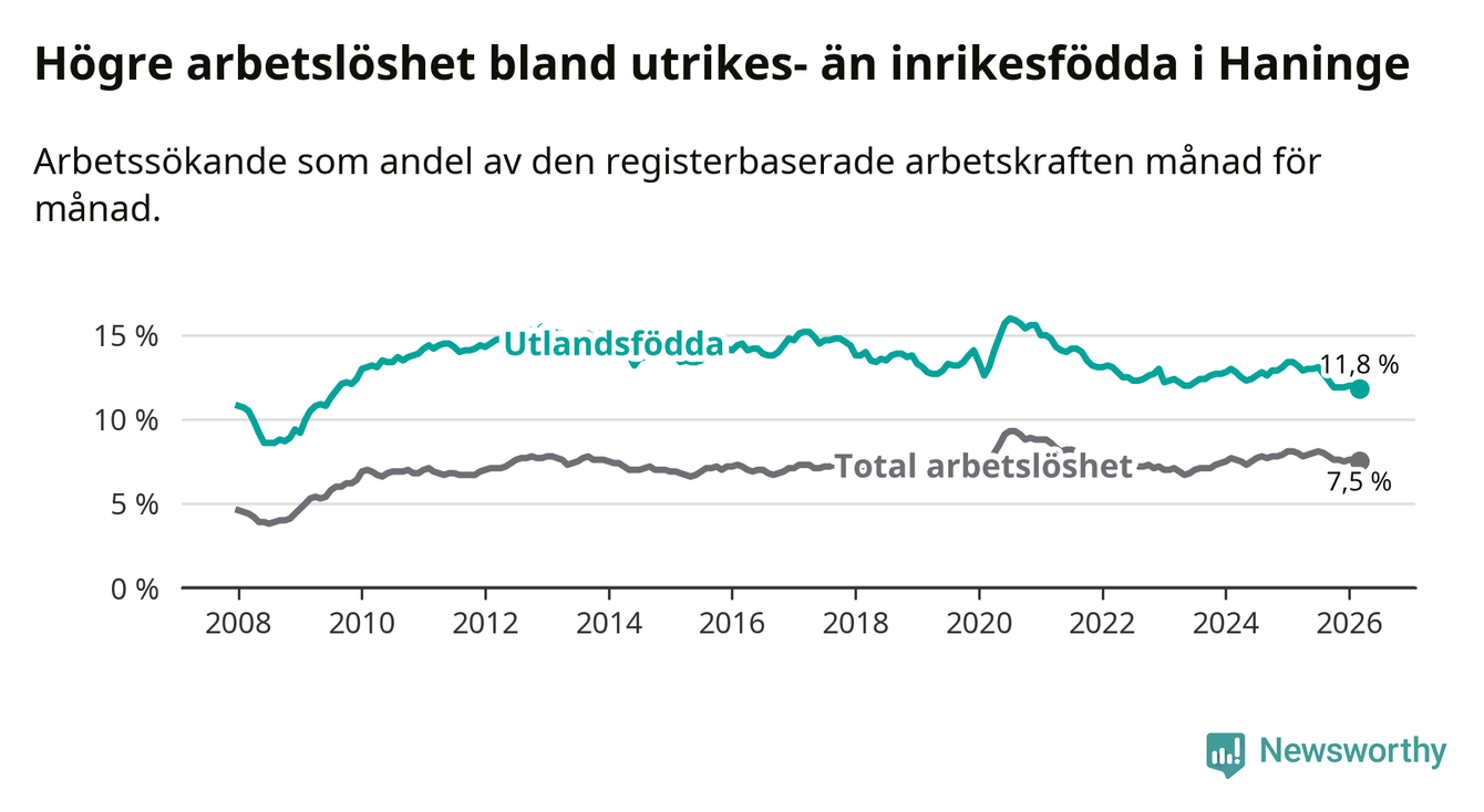 Arbetslösheten bland utlandsfödda var 11,8 procent i Haninge under mars månad, motsvarande 2 337 av 19 805 personer. Det är 1,4 procentenheter färre än vid samma tidpunkt i fjol (−189 om man räknar personer). Därmed är de utlandsföddas arbetslöshet lägre än vid samma tidpunkt i fjol för åttonde månaden i följd. Sedan juli 2025 har arbetslösheten bland utlandsfödda minskat från 13,1 till 11,8 procent. Den nuvarande arbetslöshetsnivån är den lägsta sedan augusti 2009.