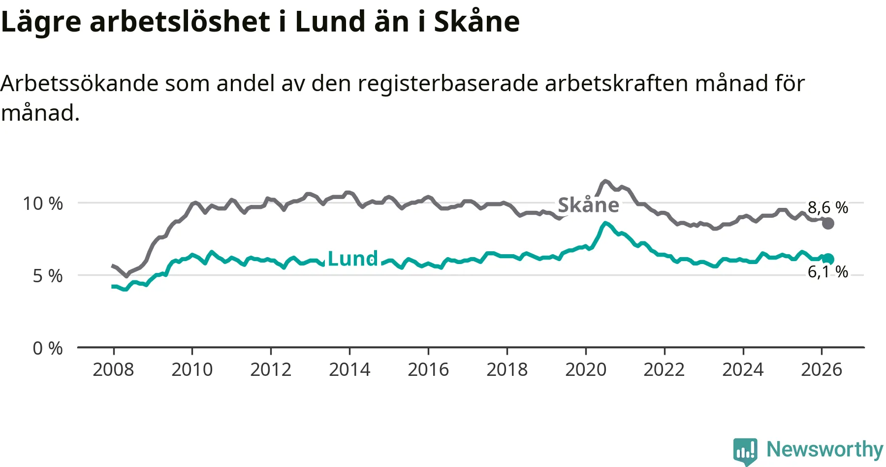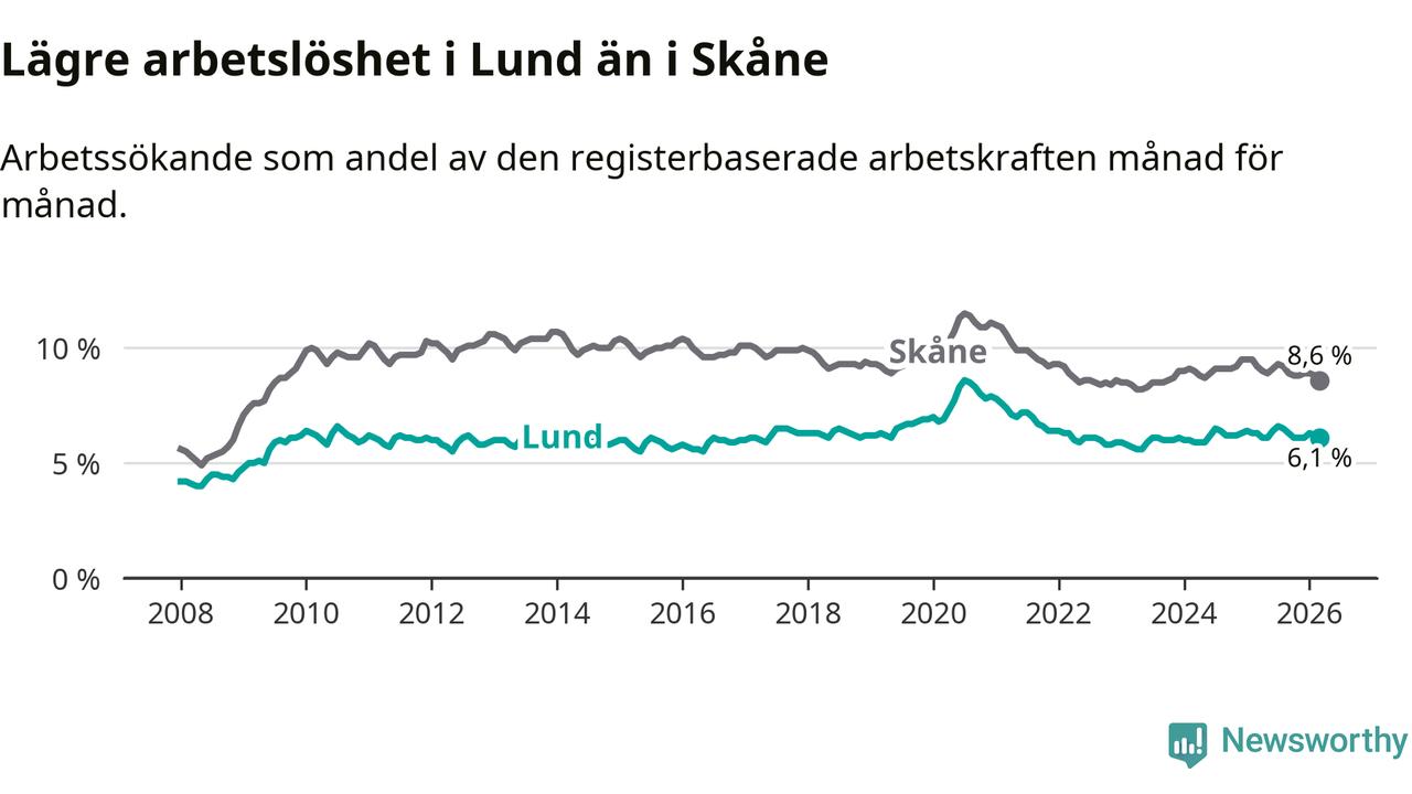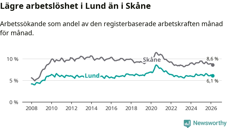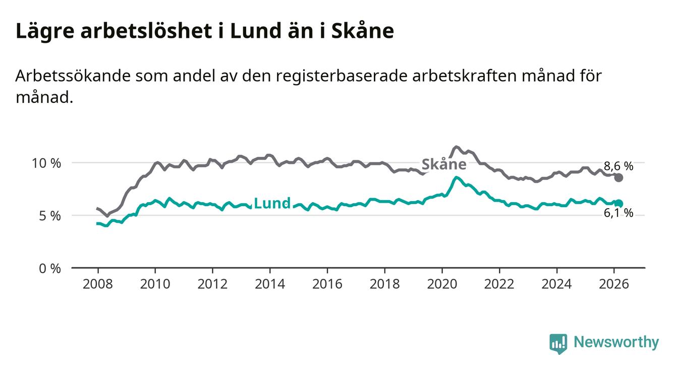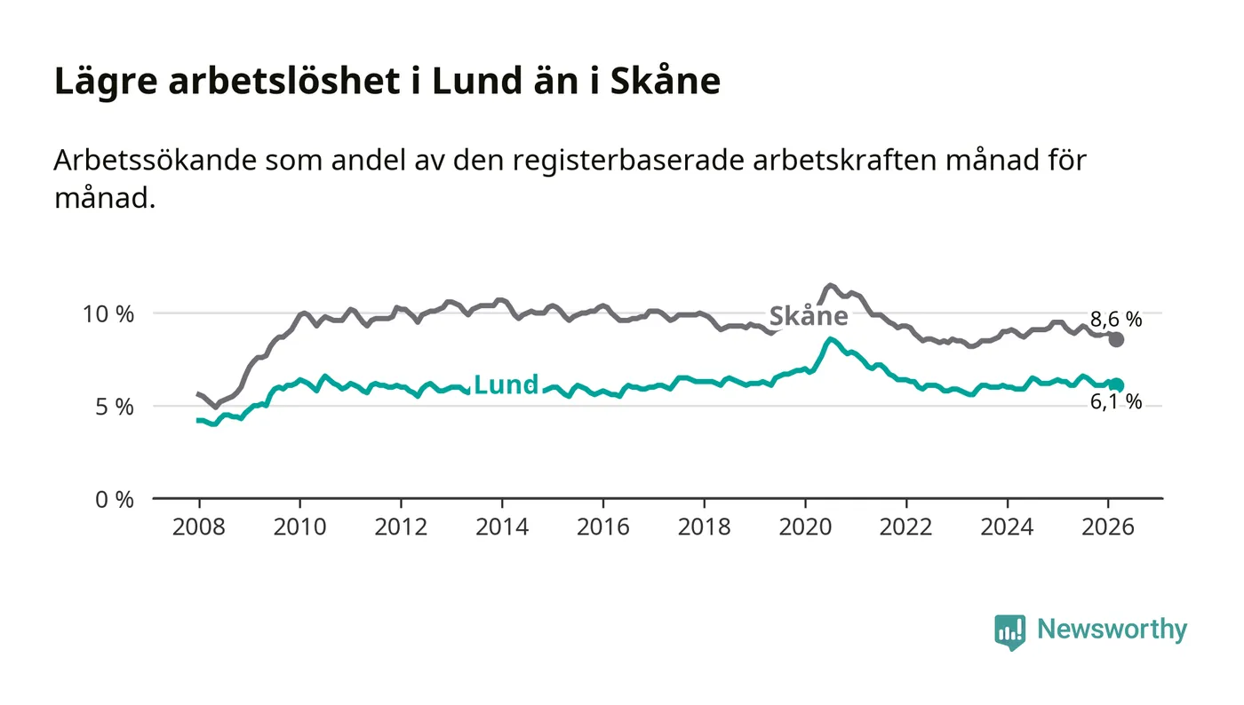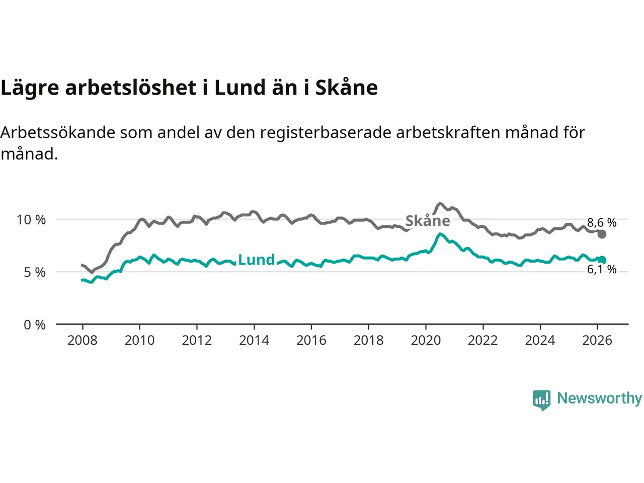 Under mars månad rapporterade Lunds kommun en total arbetslöshet på 6,1 procent. Det är en minskning jämfört med samma tidpunkt i fjol (−0,2 procentenheter). Även i Skåne län sjunker arbetslösheten .