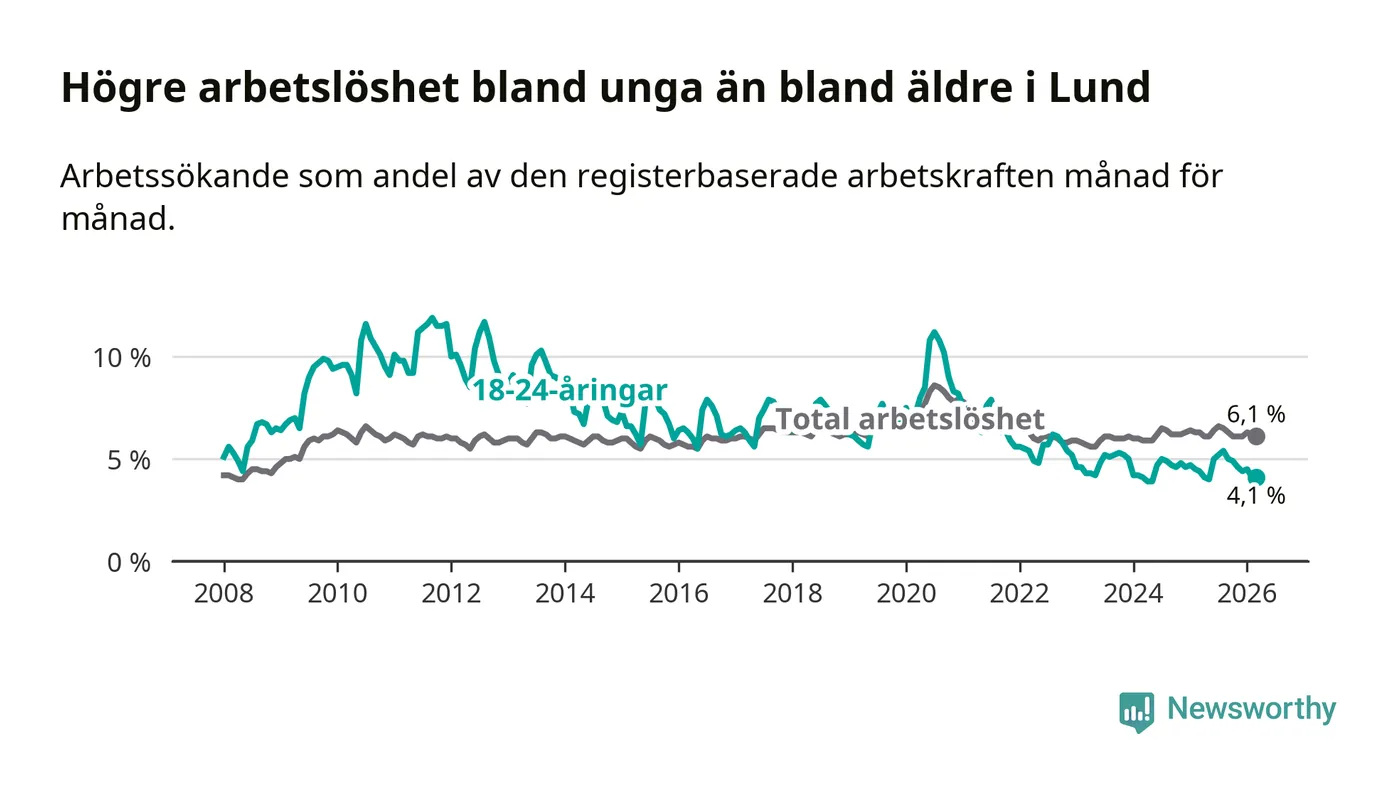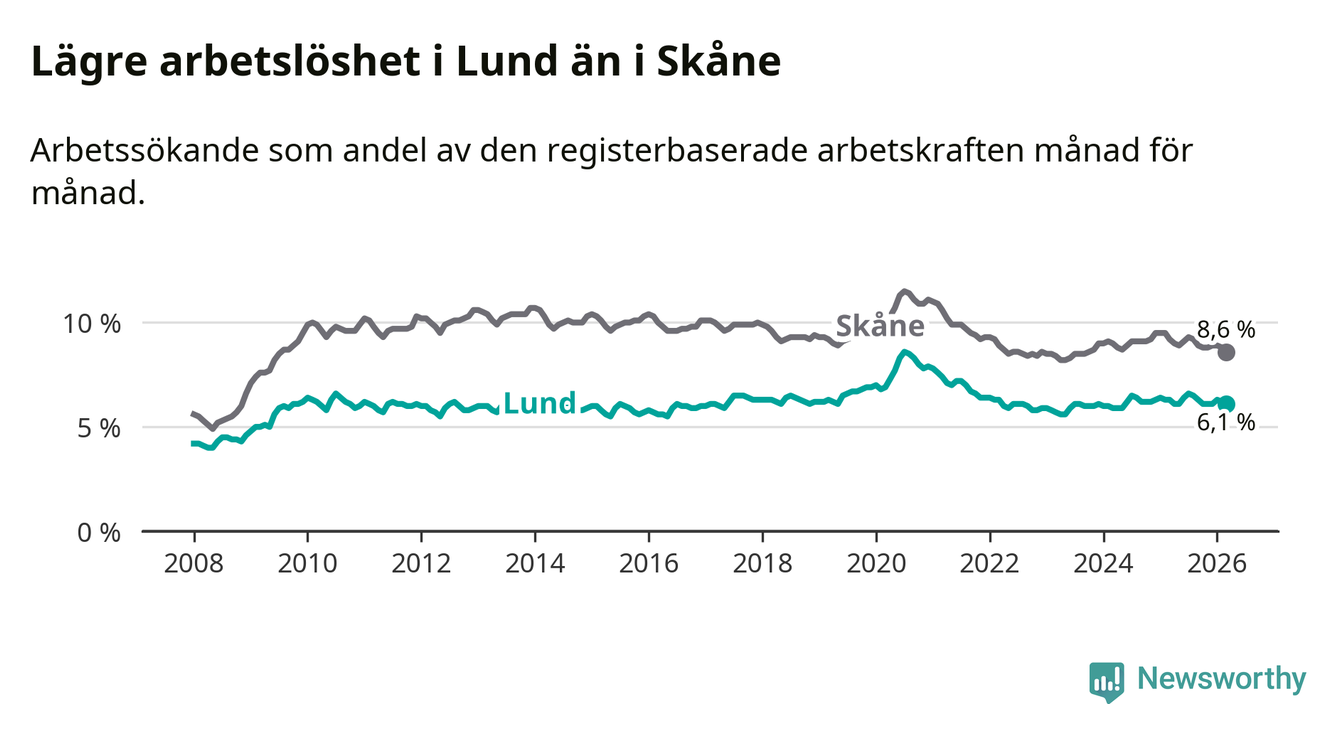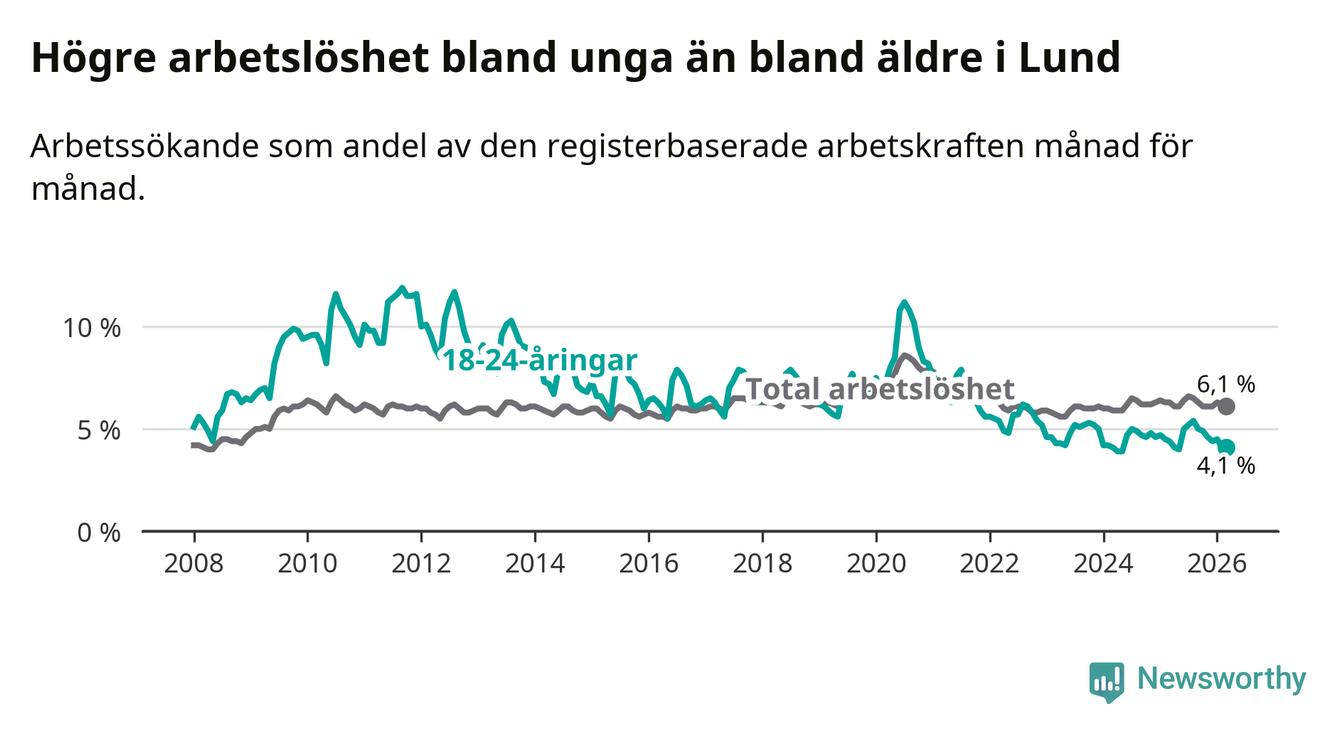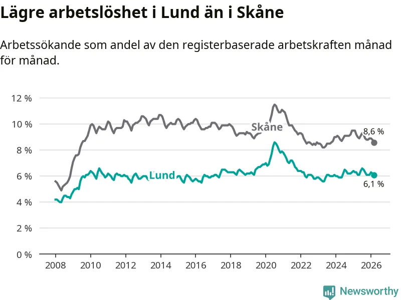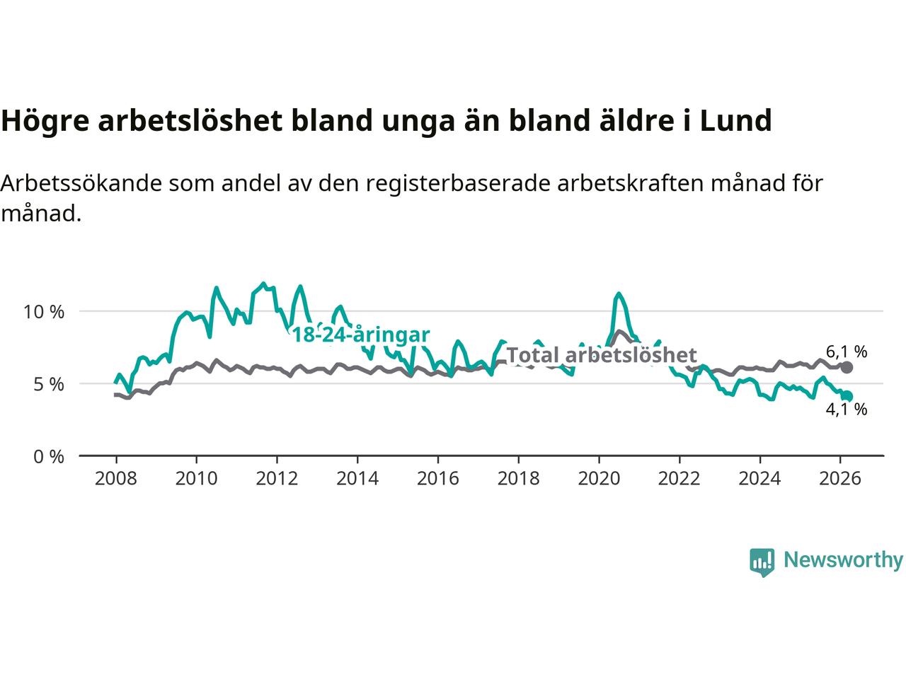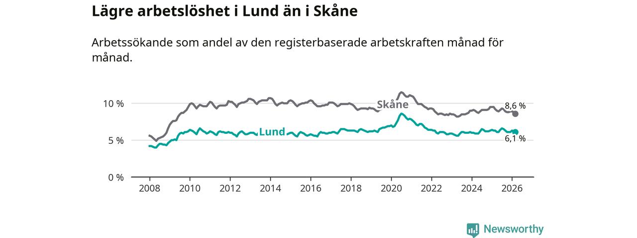 Under mars månad rapporterade Lunds kommun en total arbetslöshet på 6,1 procent. Det är en minskning jämfört med samma tidpunkt i fjol (−0,2 procentenheter). Även i Skåne län sjunker arbetslösheten .