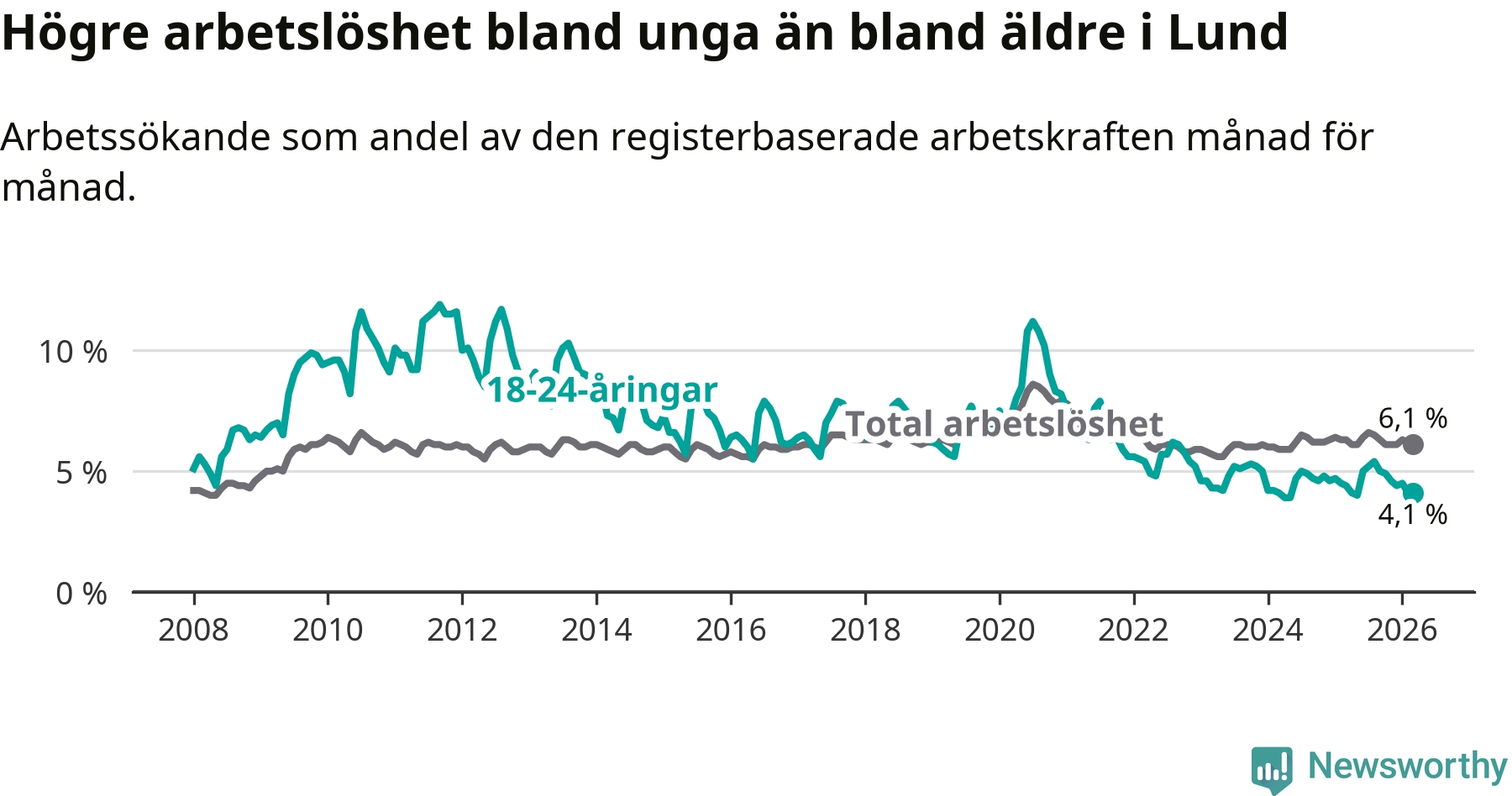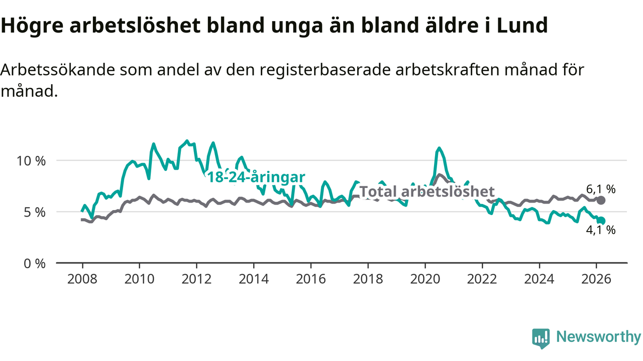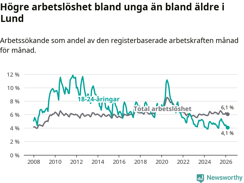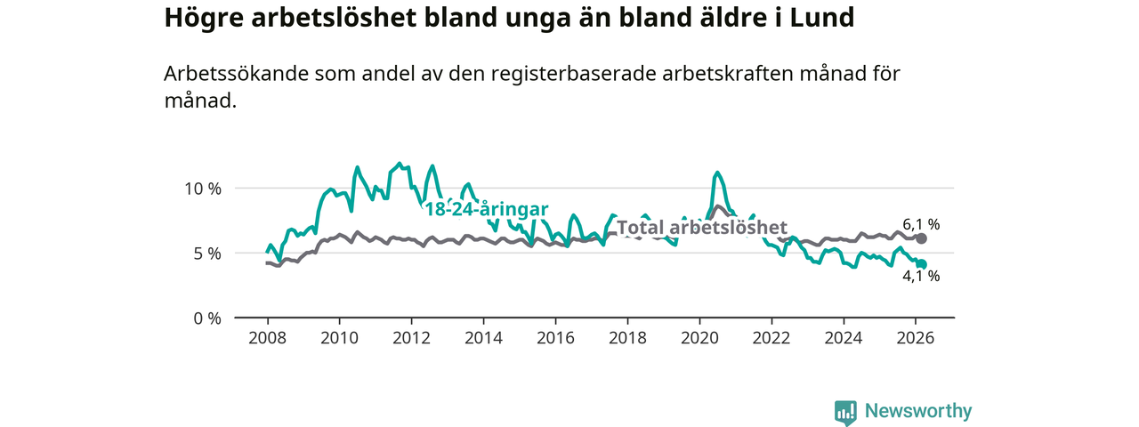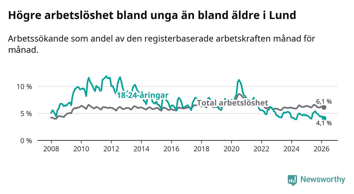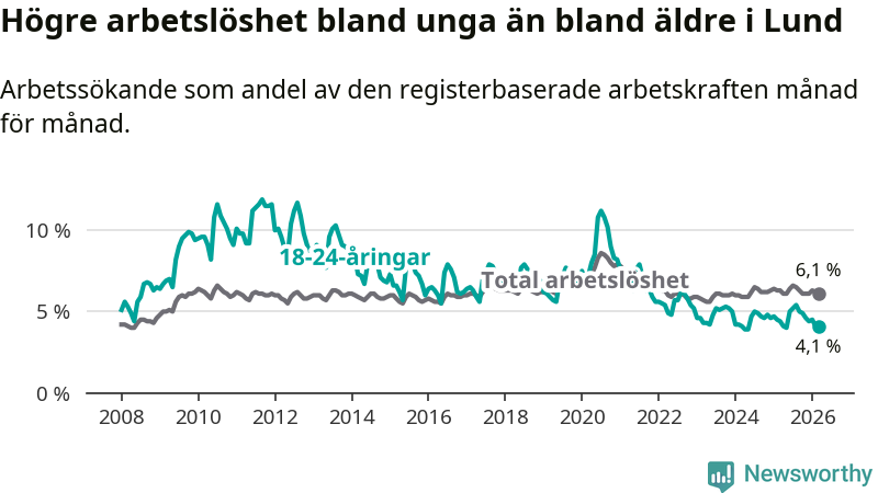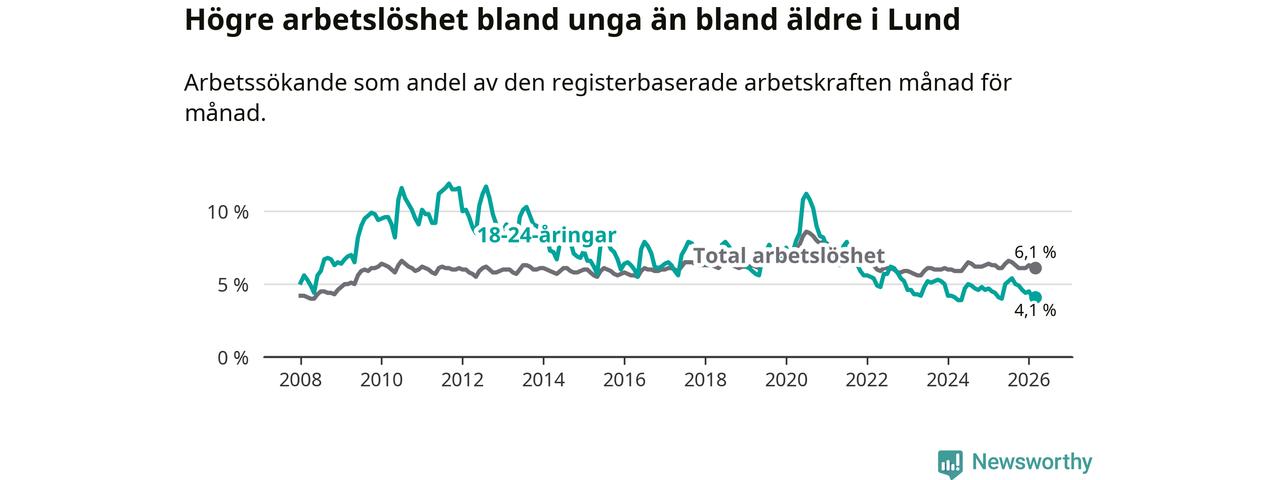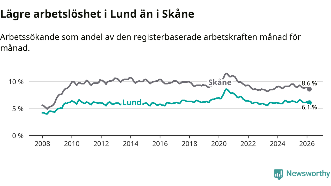 Under mars månad rapporterade Lunds kommun en total arbetslöshet på 6,1 procent. Det är en minskning jämfört med samma tidpunkt i fjol (−0,2 procentenheter). Även i Skåne län sjunker arbetslösheten .