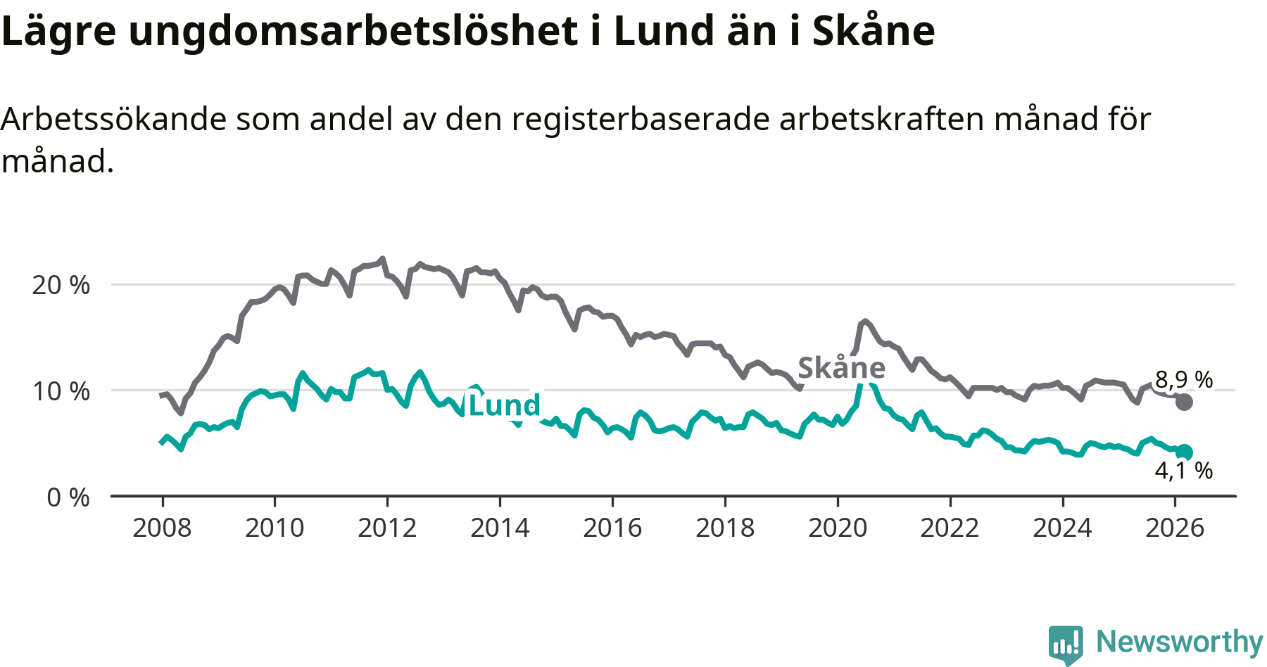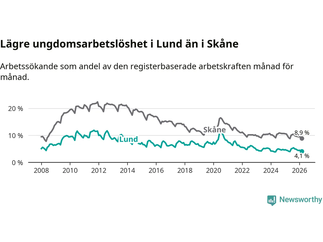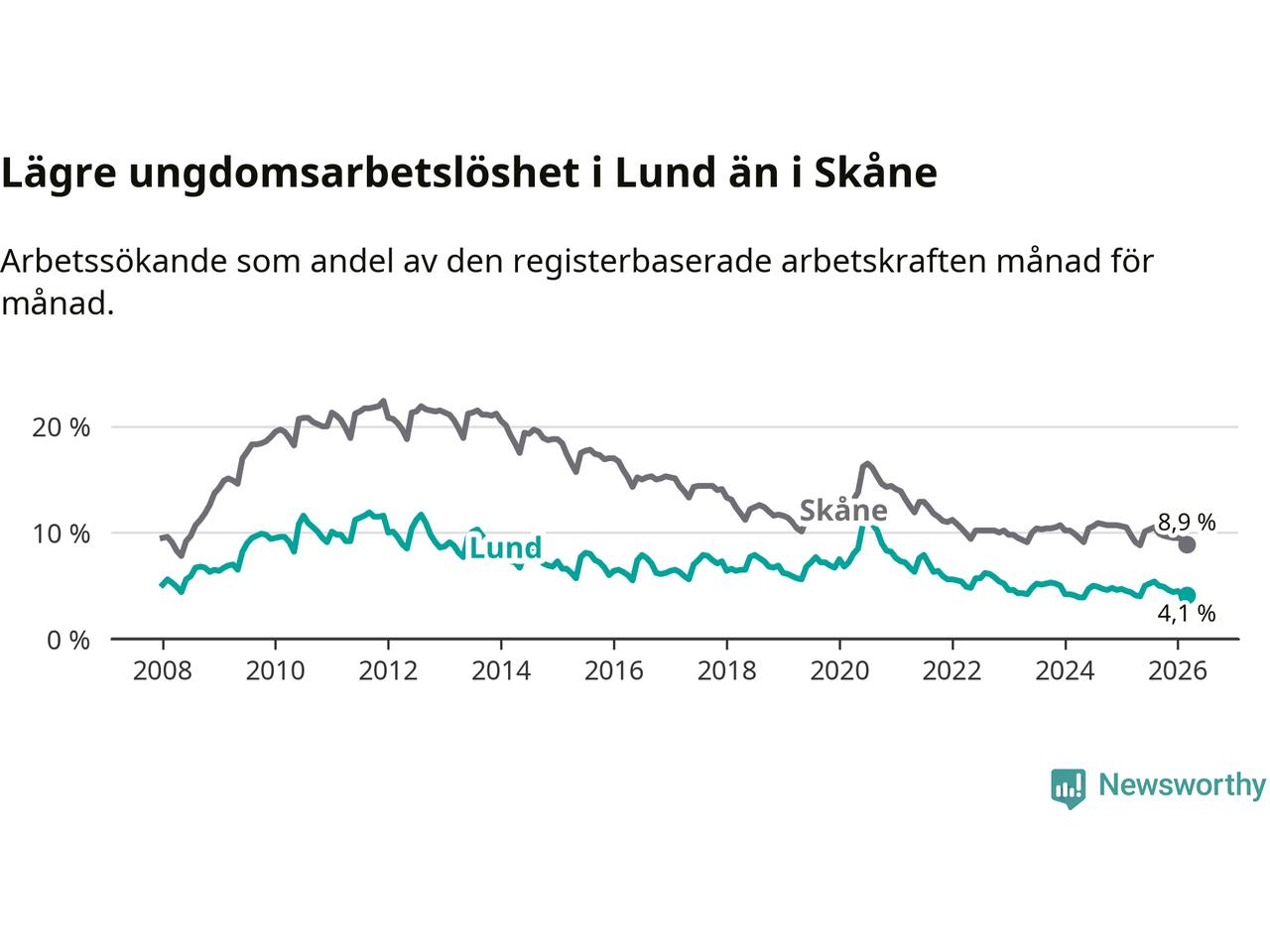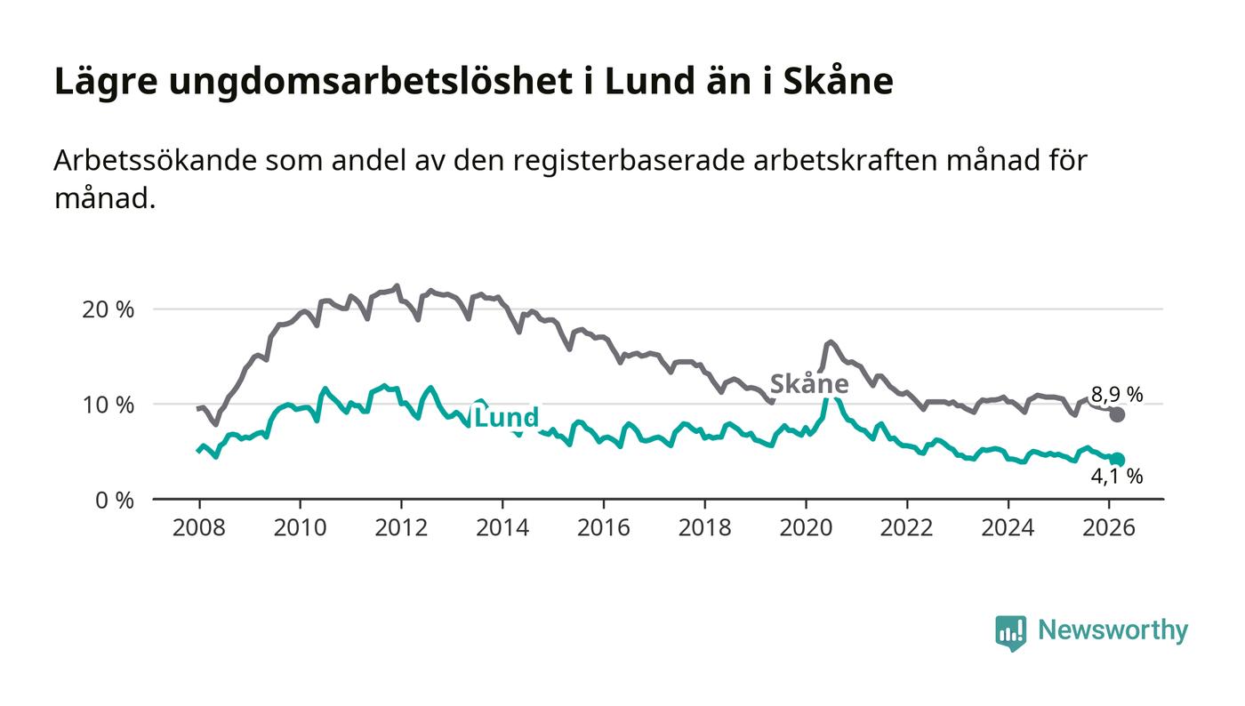 Precis som den totala arbetslösheten ligger ungdomsarbetslösheten i Lund lägre än i Skåne som helhet. Skillnaden mellan kommunen och länet är 4,8 procentenheter.
