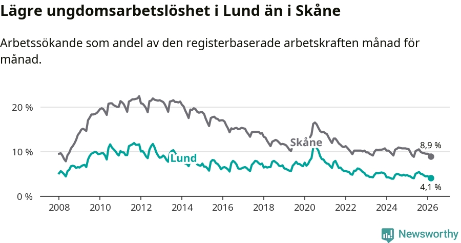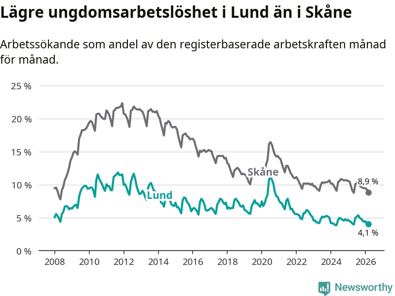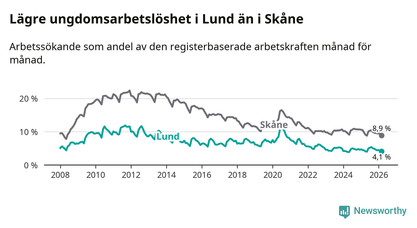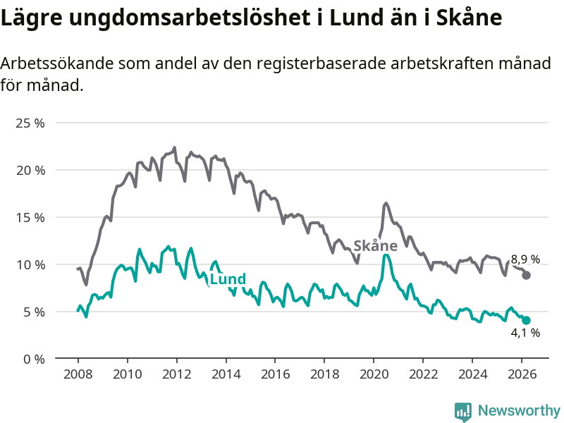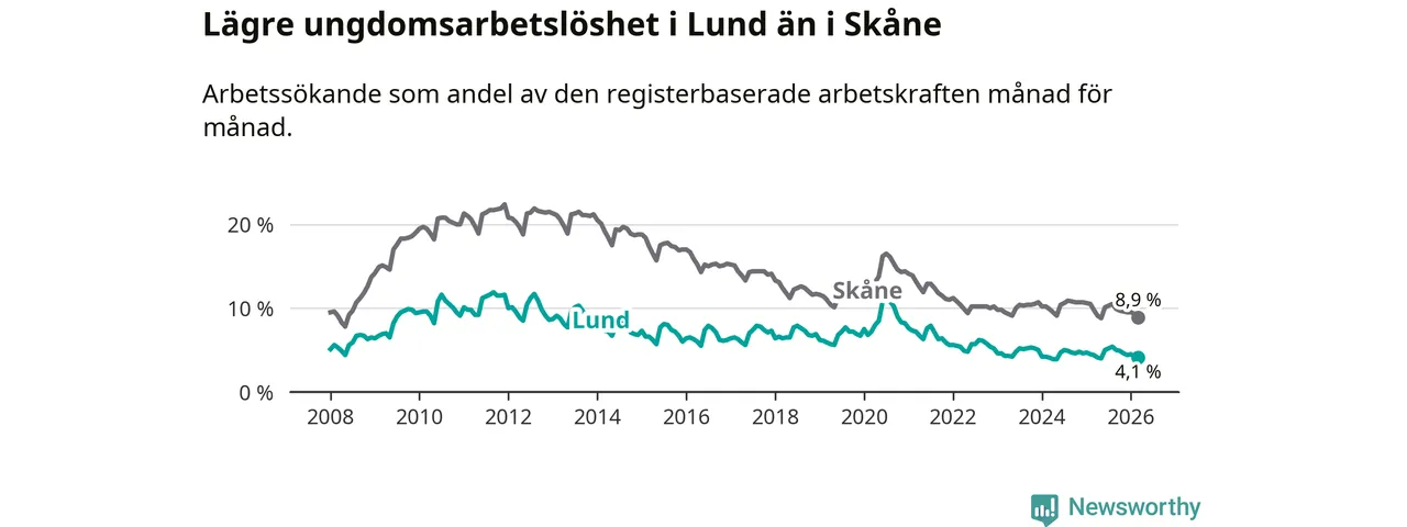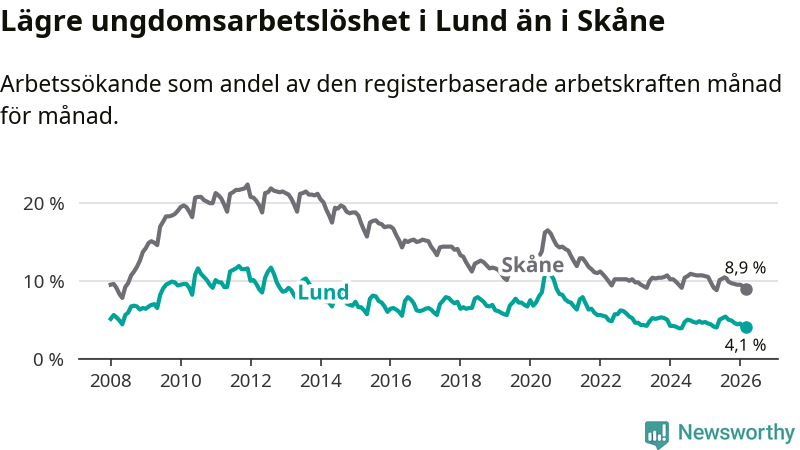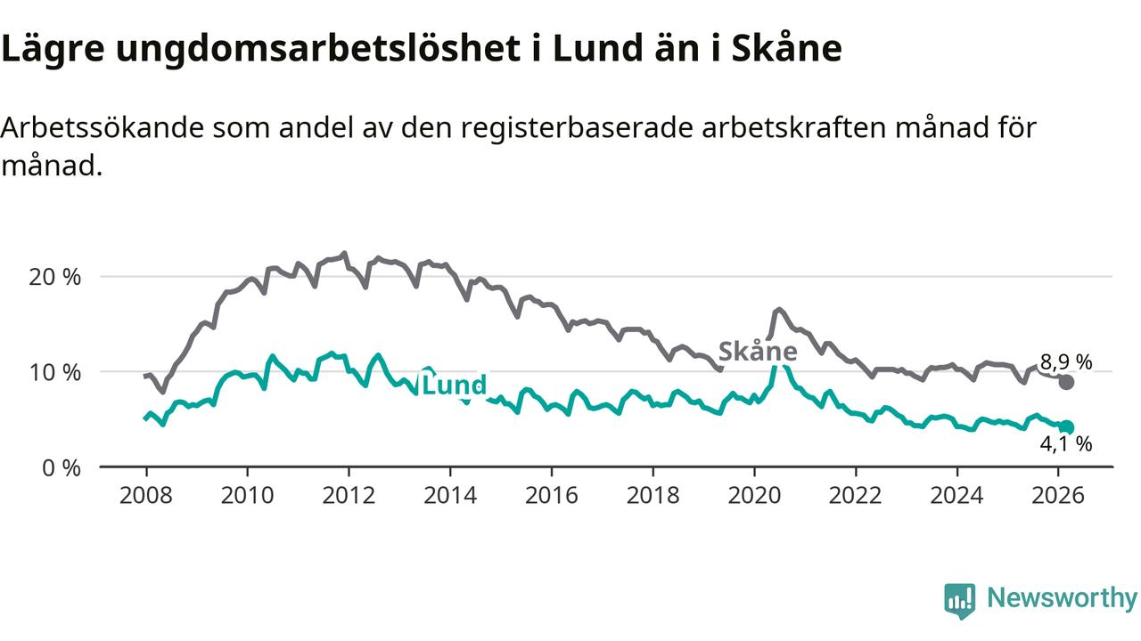 Precis som den totala arbetslösheten ligger ungdomsarbetslösheten i Lund lägre än i Skåne som helhet. Skillnaden mellan kommunen och länet är 4,8 procentenheter.