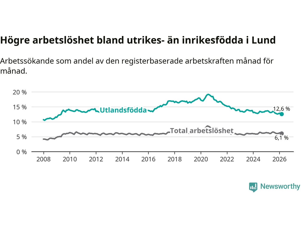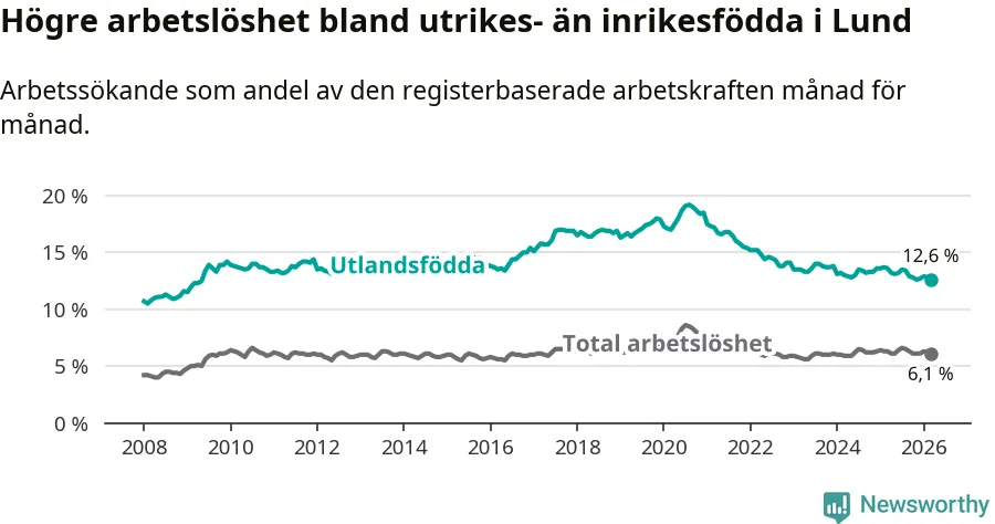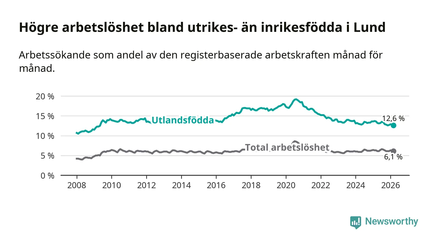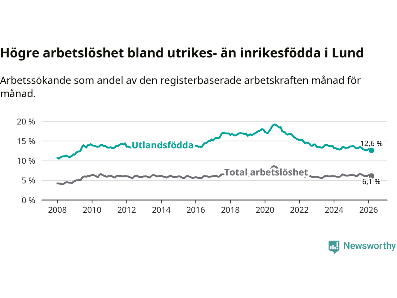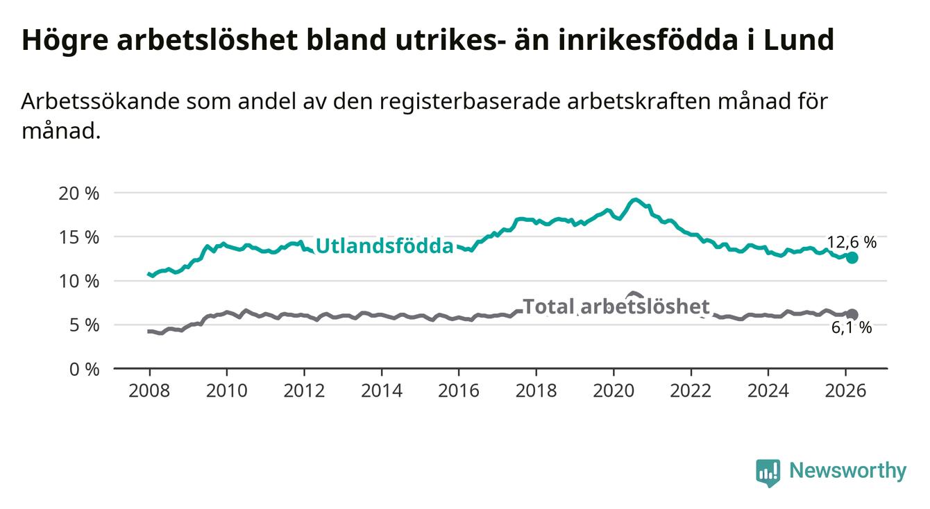 Arbetslösheten bland utlandsfödda var 12,6 procent i Lund under mars månad, motsvarande 2 077 av 16 484 personer. Det är 1,0 procentenheter färre än vid samma tidpunkt i fjol (−126 om man räknar personer). Därmed är de utlandsföddas arbetslöshet lägre än vid samma tidpunkt i fjol för sjunde månaden i följd.