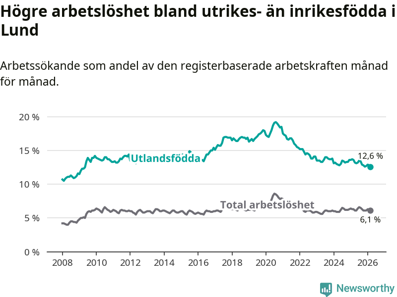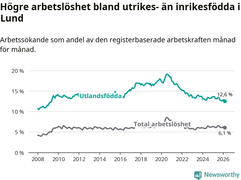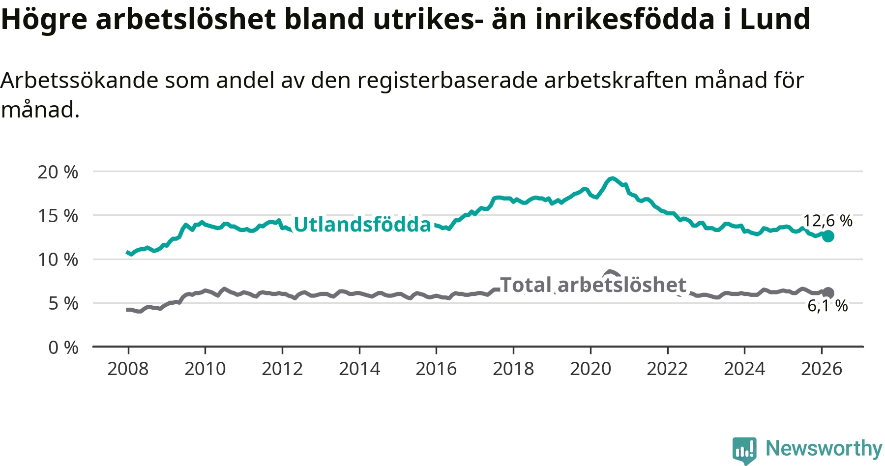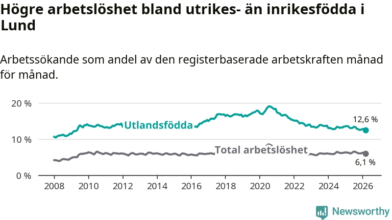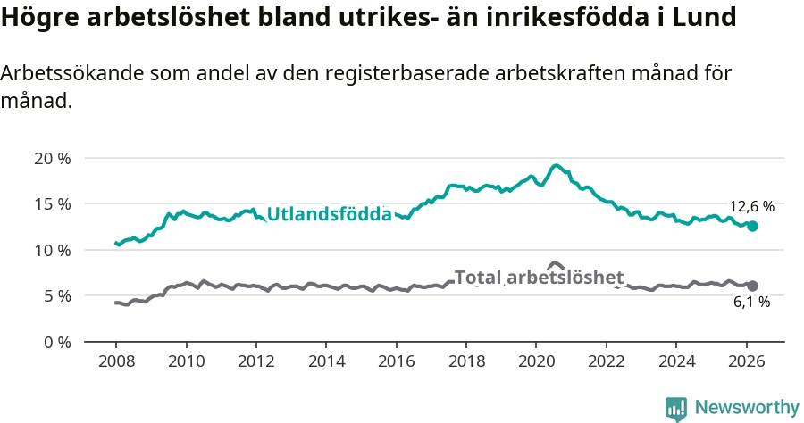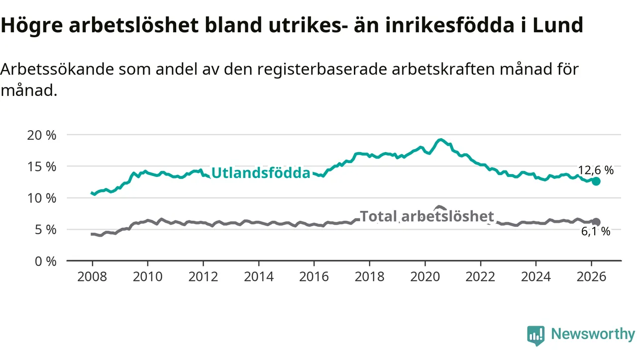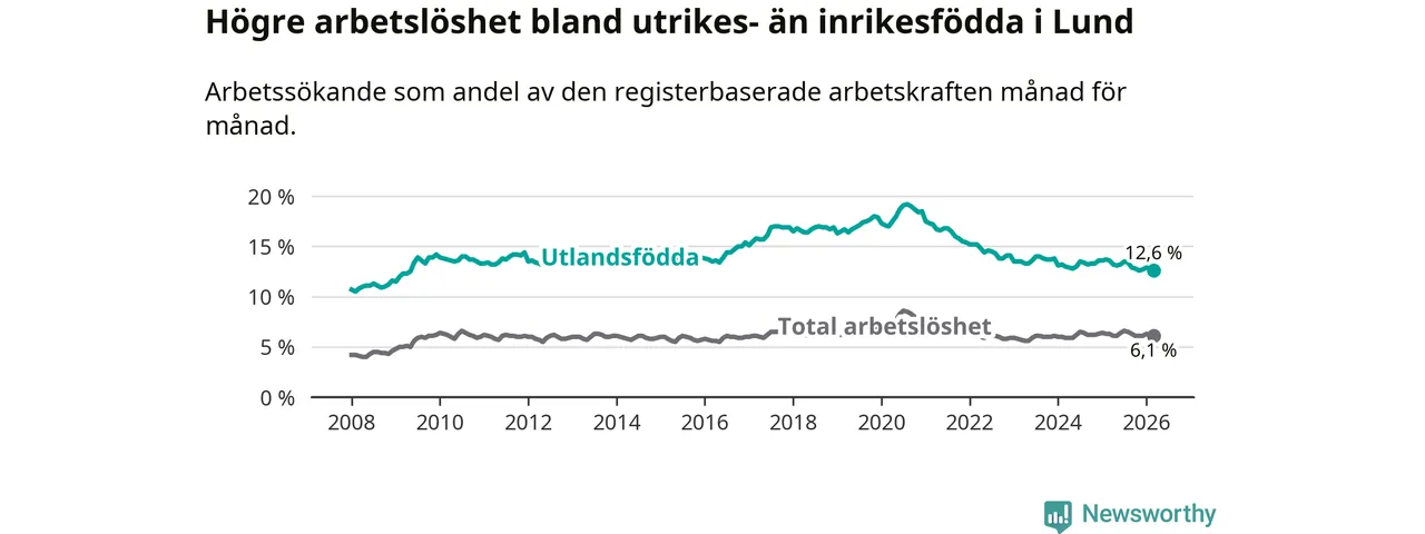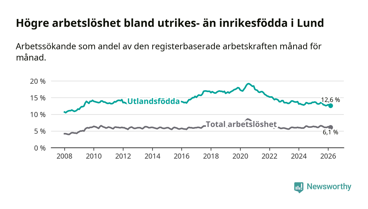 Arbetslösheten bland utlandsfödda var 12,6 procent i Lund under mars månad, motsvarande 2 077 av 16 484 personer. Det är 1,0 procentenheter färre än vid samma tidpunkt i fjol (−126 om man räknar personer). Därmed är de utlandsföddas arbetslöshet lägre än vid samma tidpunkt i fjol för sjunde månaden i följd.