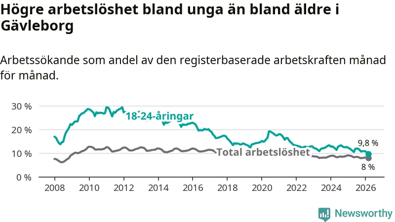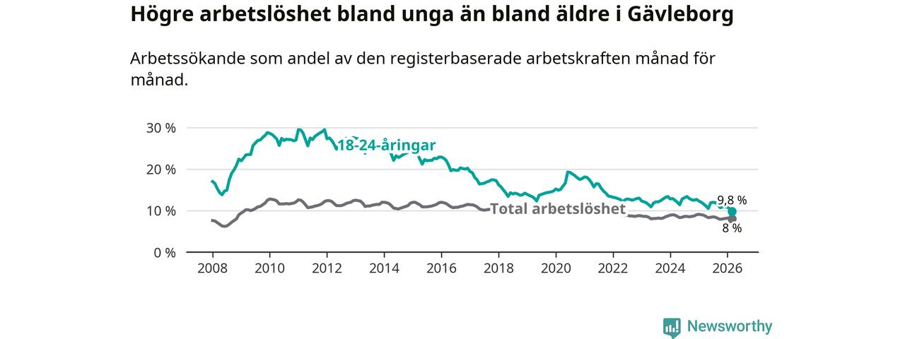 I och med den senaste månadens nedgång har de ungas arbetslöshet i Gävleborg sjunkit 18 månader i följd (ner från 12,9 procent i september 2024 till 9,8 procent nu). Den nuvarande arbetslöshetsnivån är den lägsta sedan januari 2008.