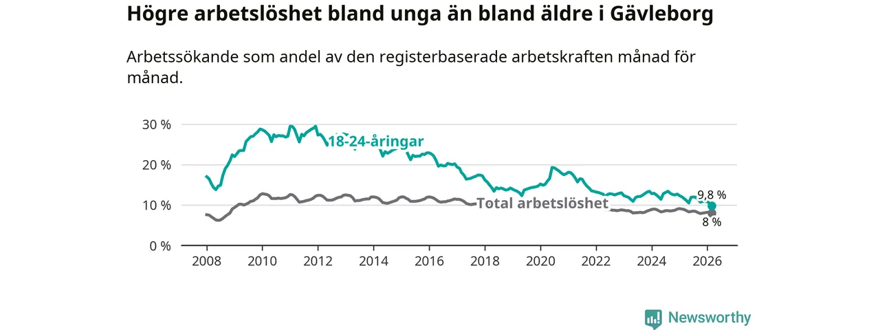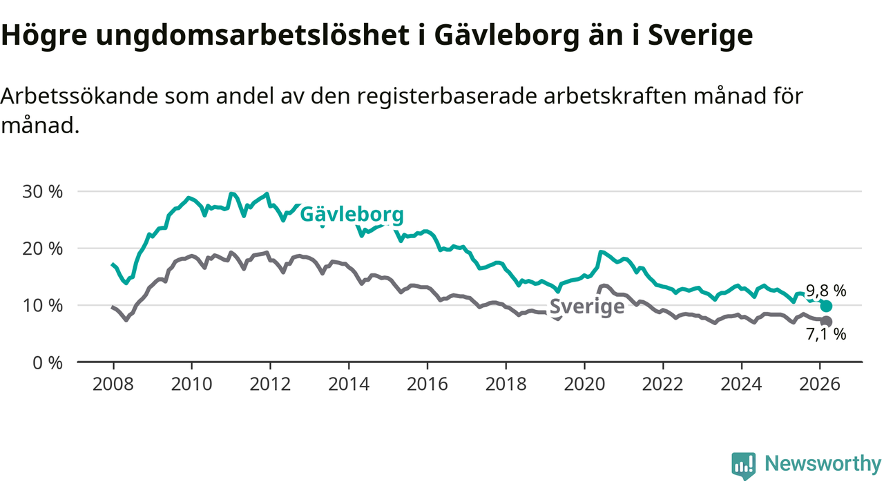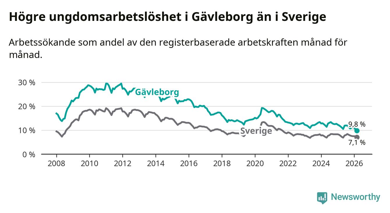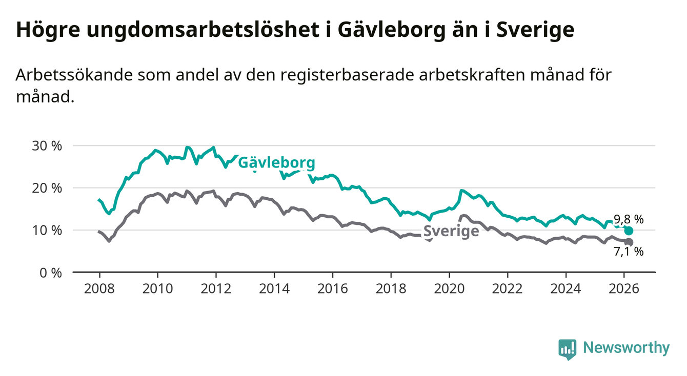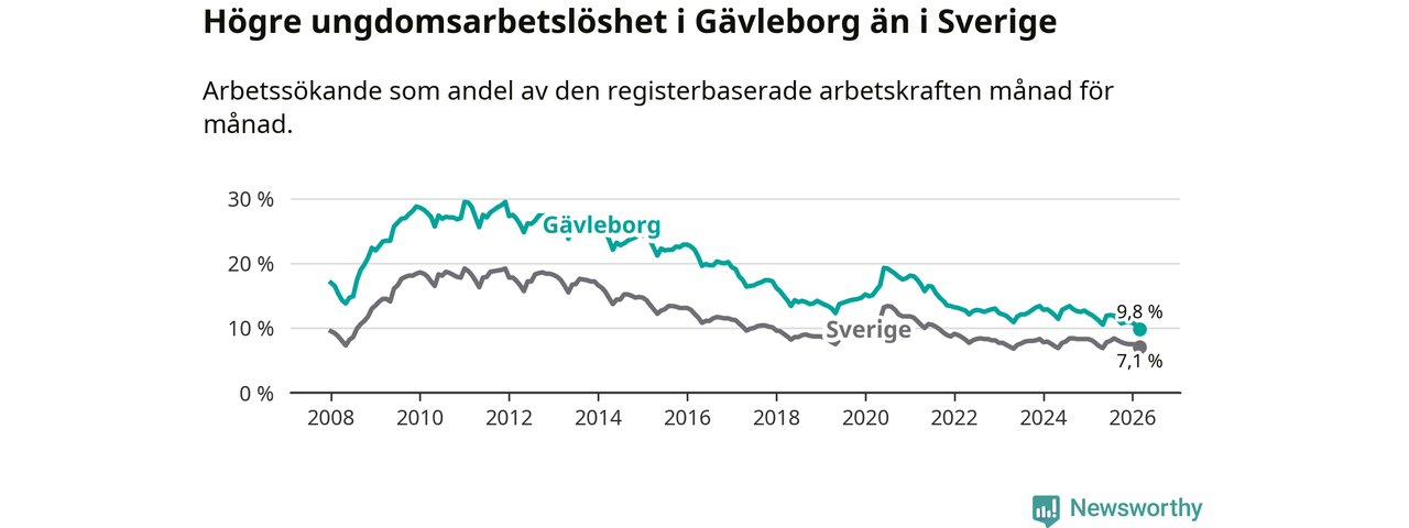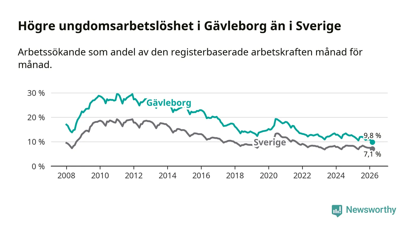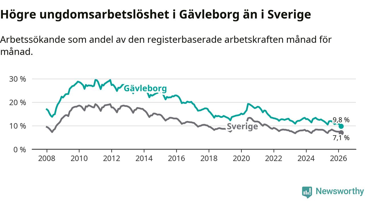 Graf: Arbetslöshet bland unga i Gävleborgs län och Sverige
