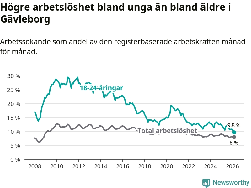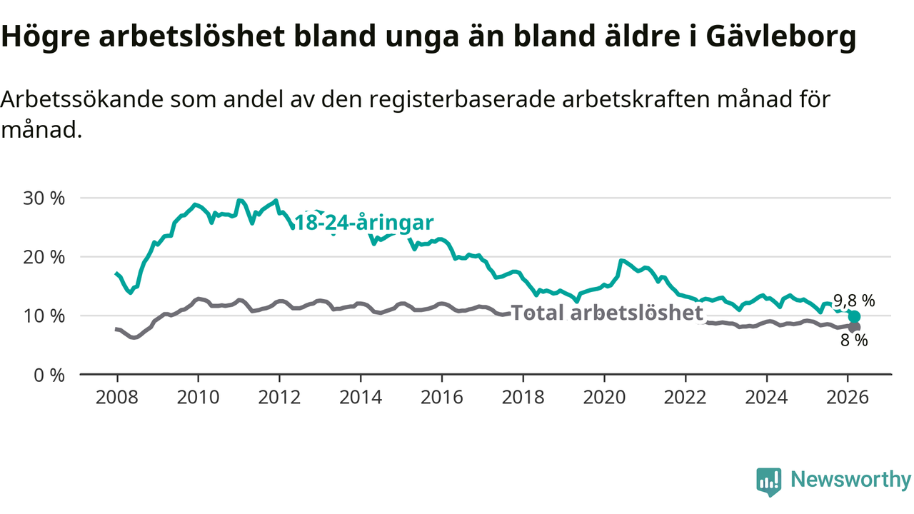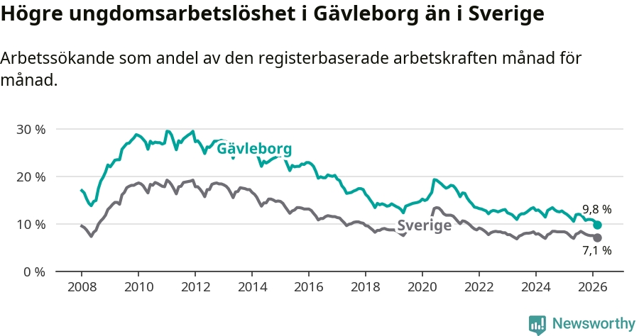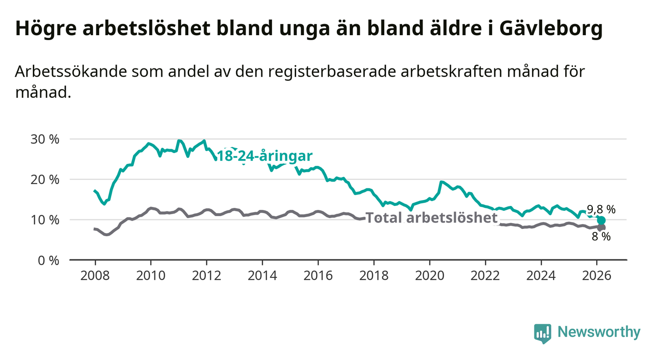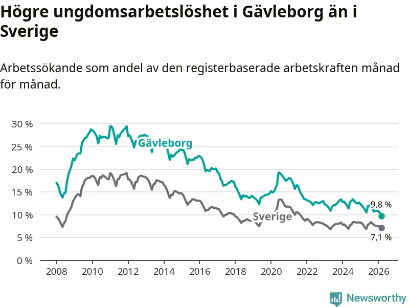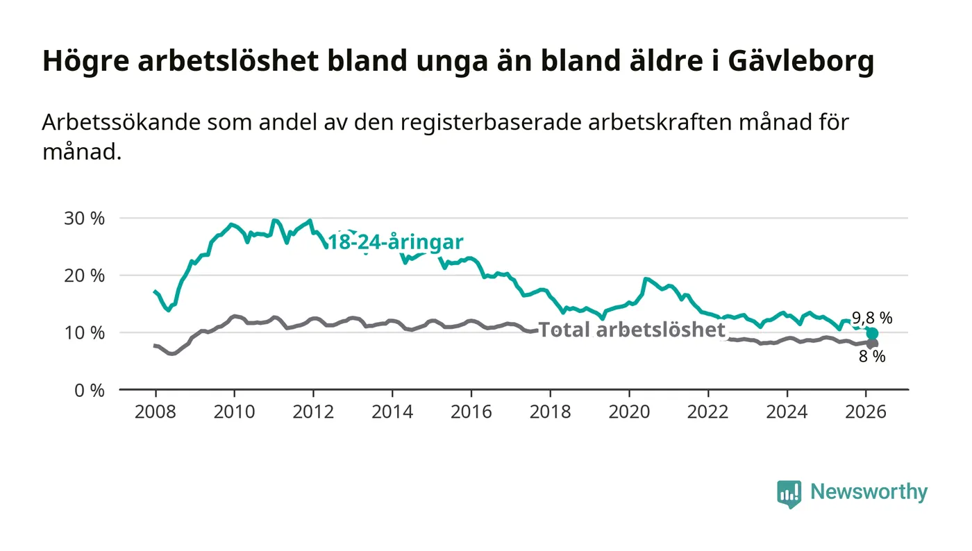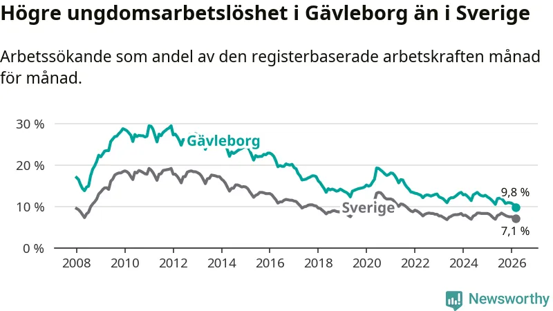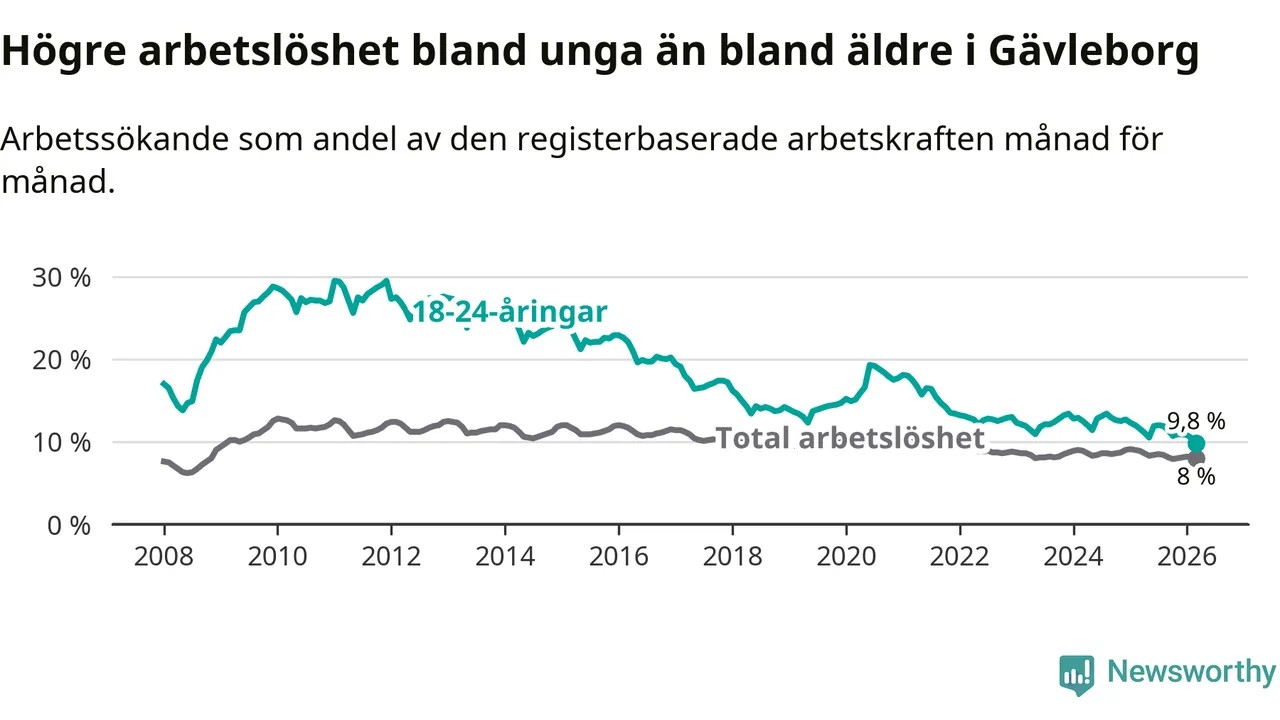 Graf: Arbetslöshet bland unga i Gävleborgs län och Sverige