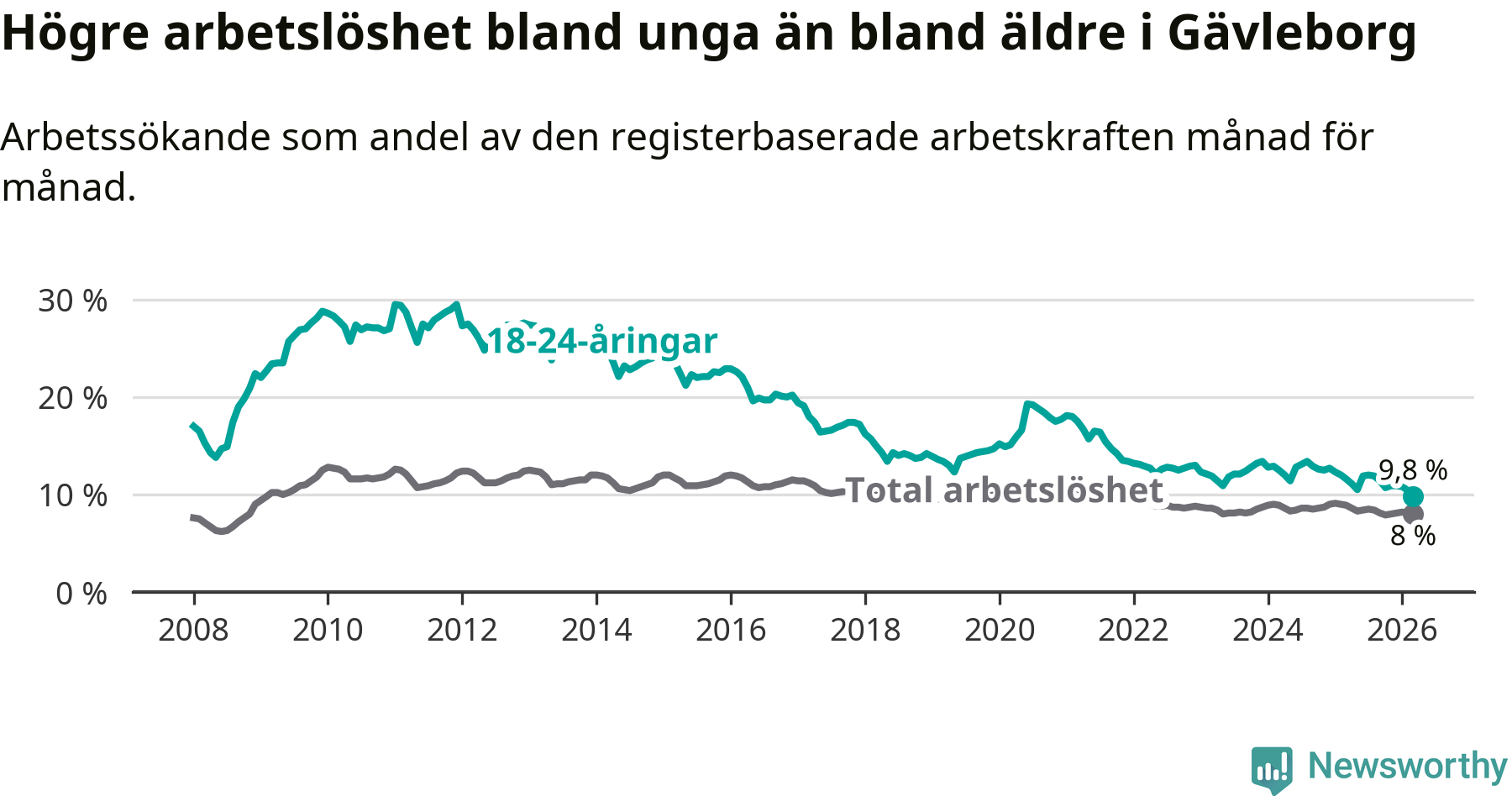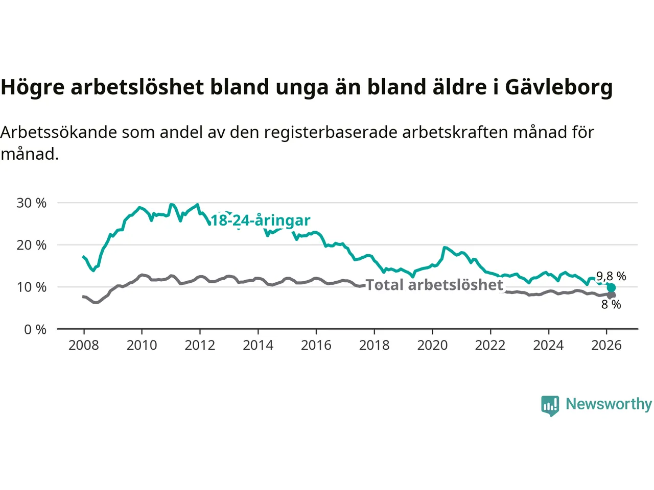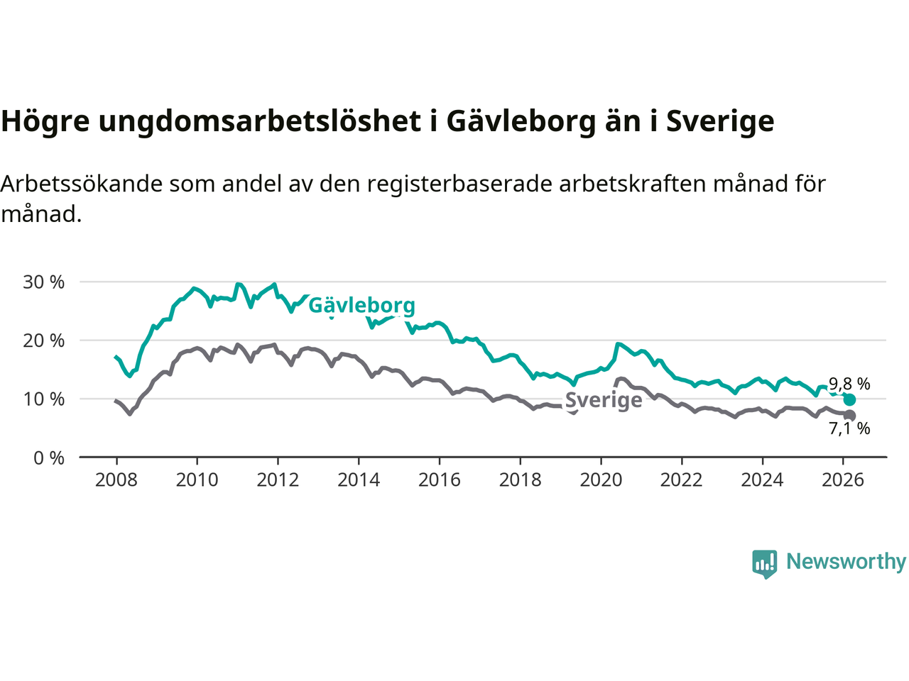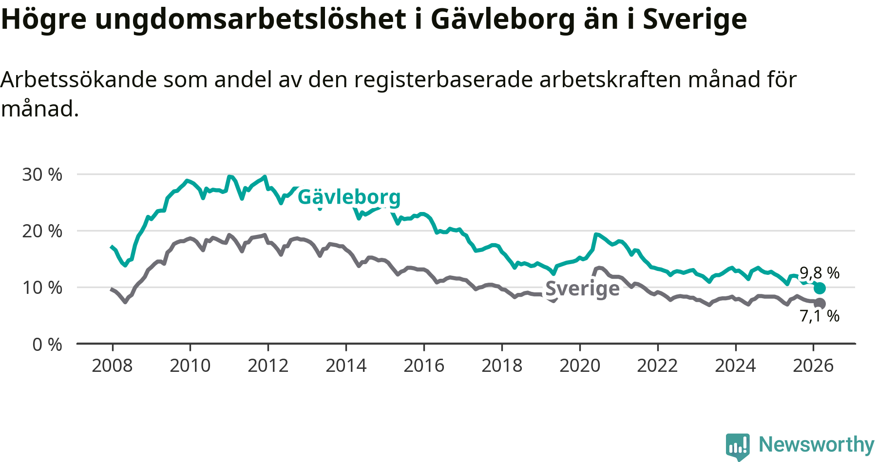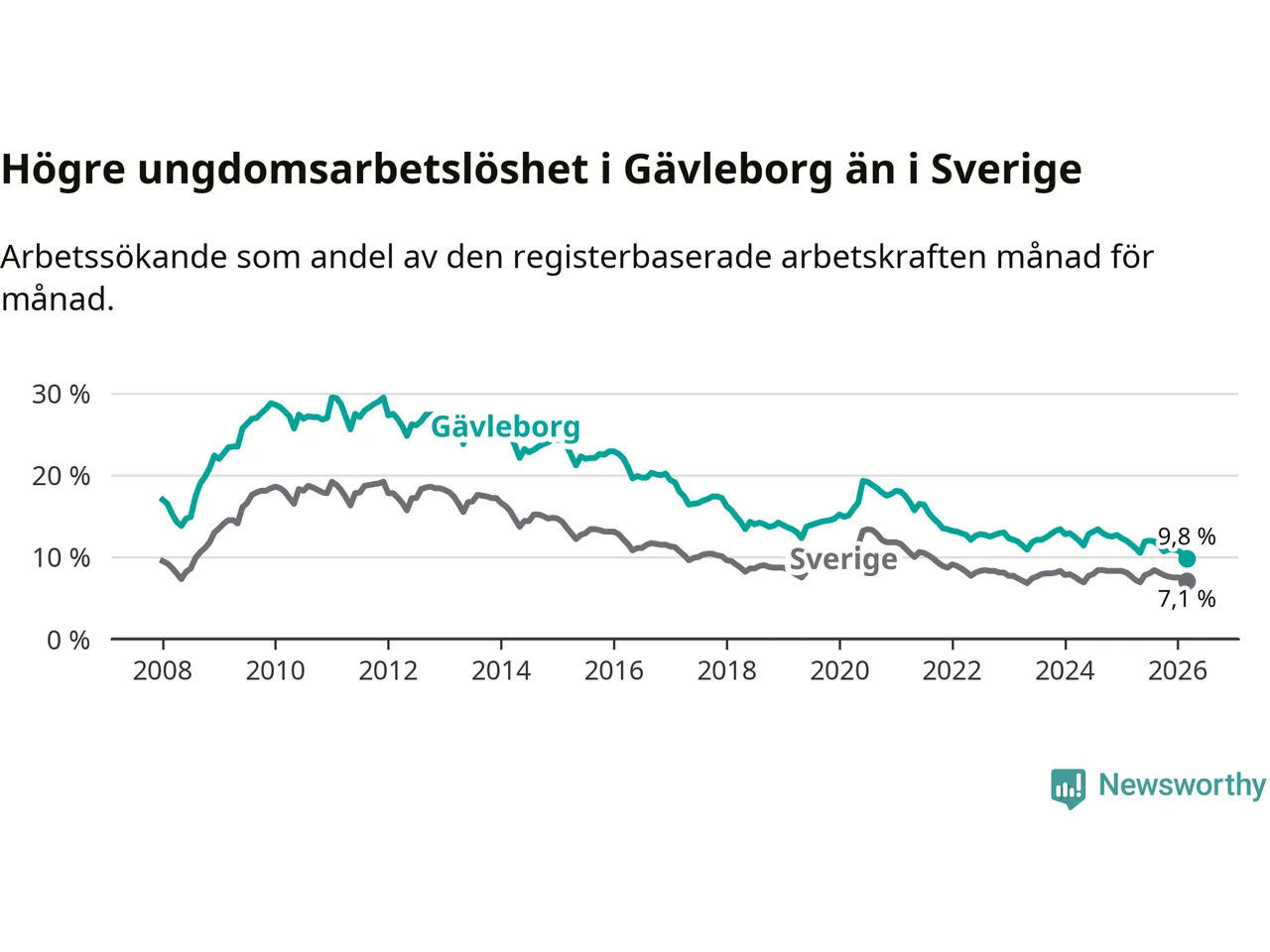 Graf: Arbetslöshet bland unga i Gävleborgs län och Sverige