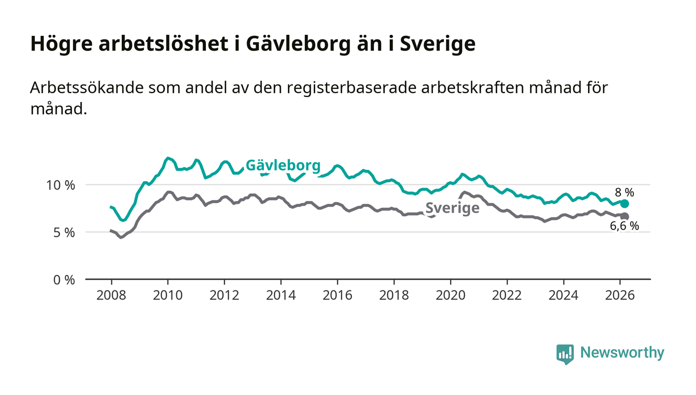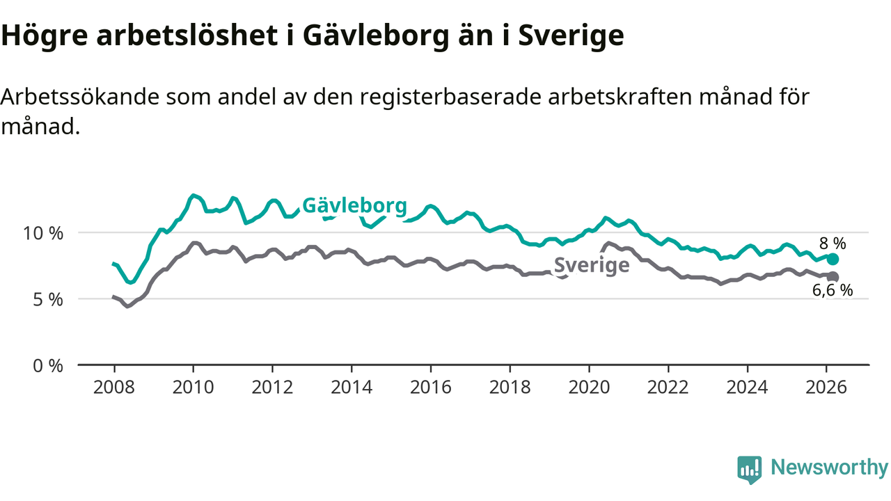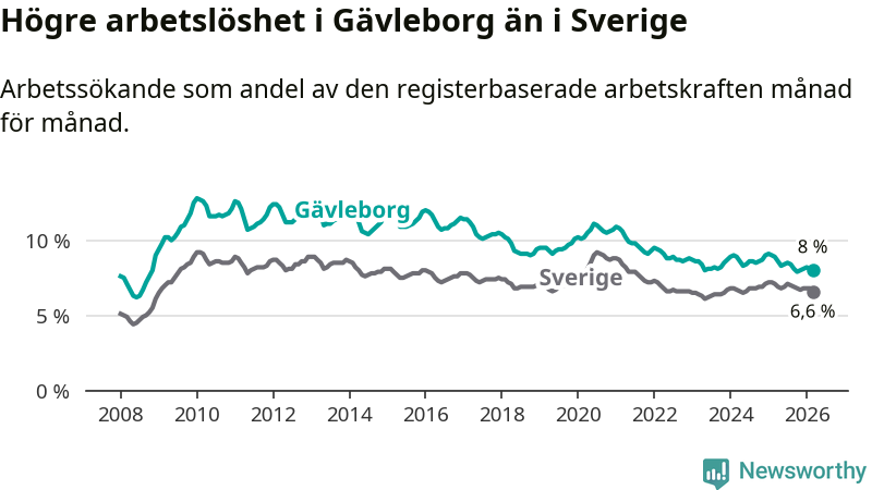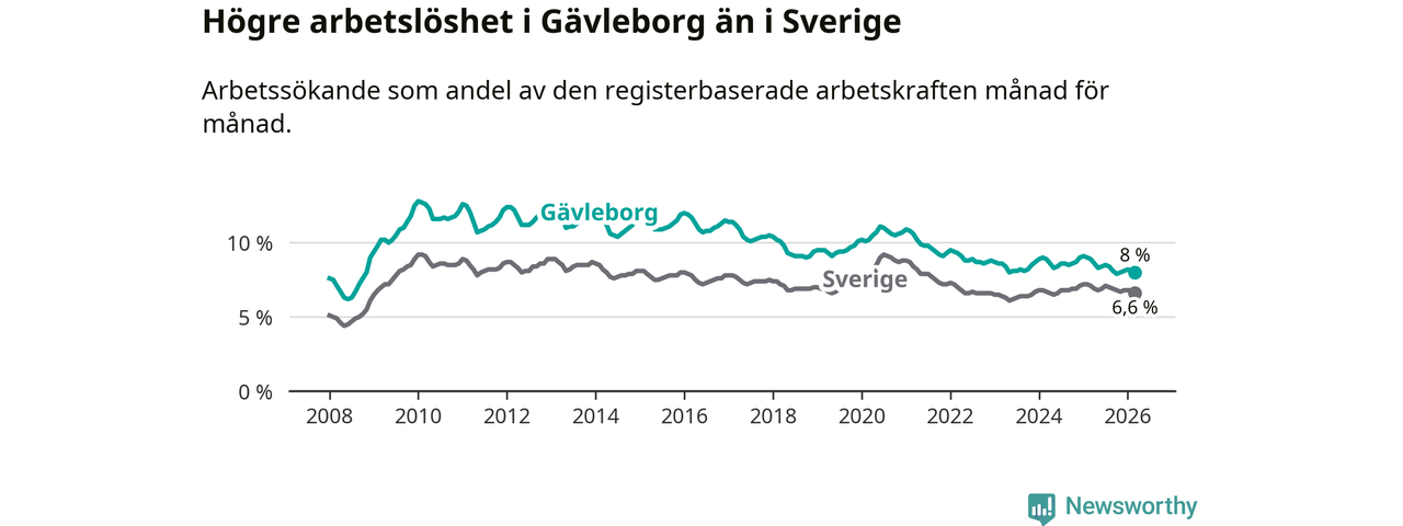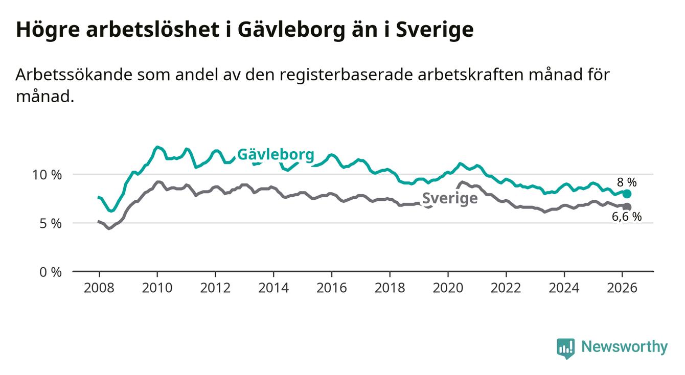 Även om arbetslösheten i Gävleborg alltså minskar, så ligger den fortfarande över snittet i hela Sverige (8,0 procent i länet, jämfört med 6,6 procent i hela riket). Norrbotten har den lägsta arbetslösheten i riket (3,8 procent), medan Skåne har den högsta (8,6 procent). För att Gävleborg skulle komma ner i samma arbetslöshetsnivå som Norrbotten skulle 5 764 personer behöva sysselsättas.