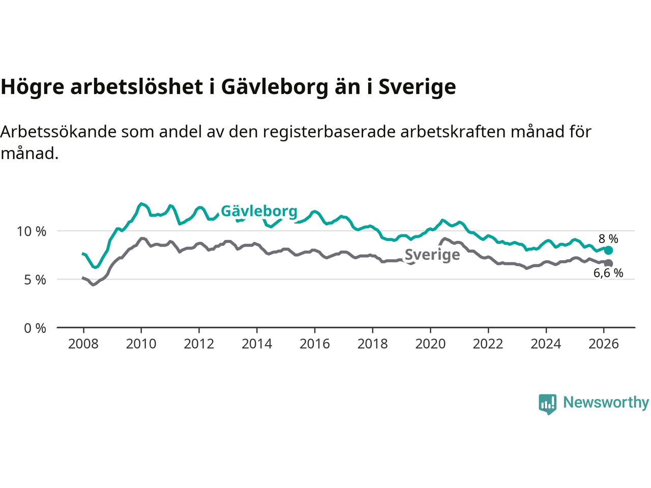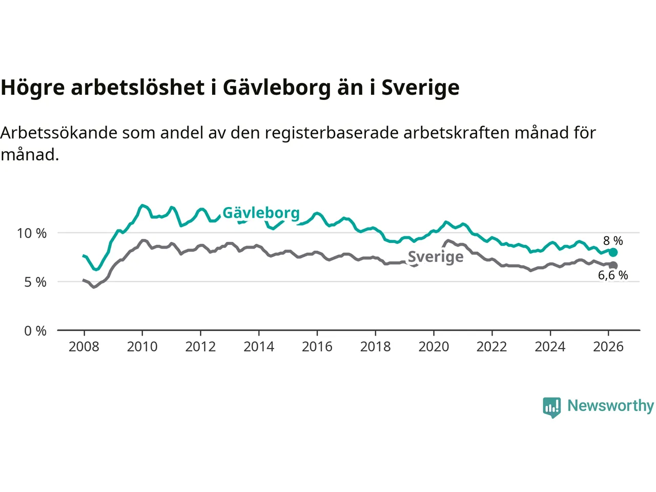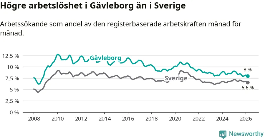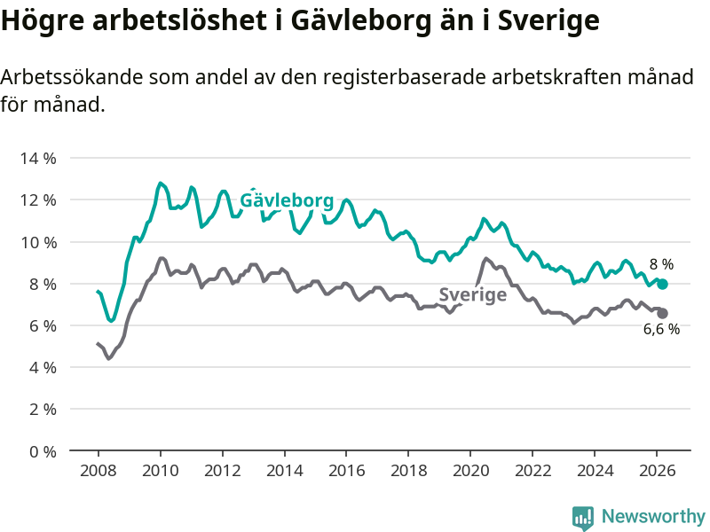 Även om arbetslösheten i Gävleborg alltså minskar, så ligger den fortfarande över snittet i hela Sverige (8,0 procent i länet, jämfört med 6,6 procent i hela riket). Norrbotten har den lägsta arbetslösheten i riket (3,8 procent), medan Skåne har den högsta (8,6 procent). För att Gävleborg skulle komma ner i samma arbetslöshetsnivå som Norrbotten skulle 5 764 personer behöva sysselsättas.