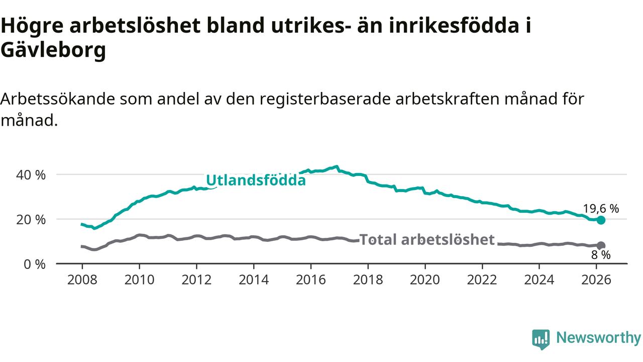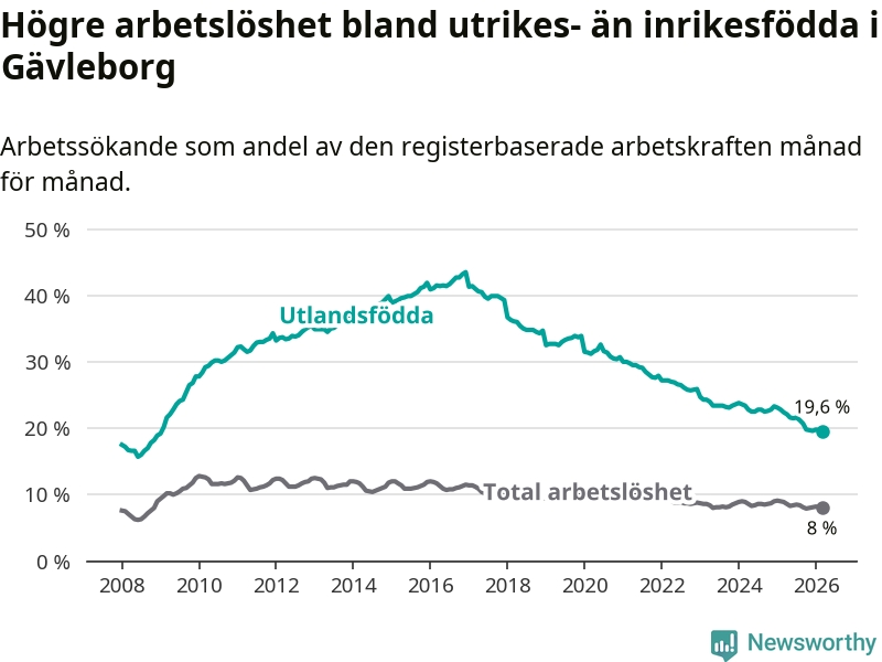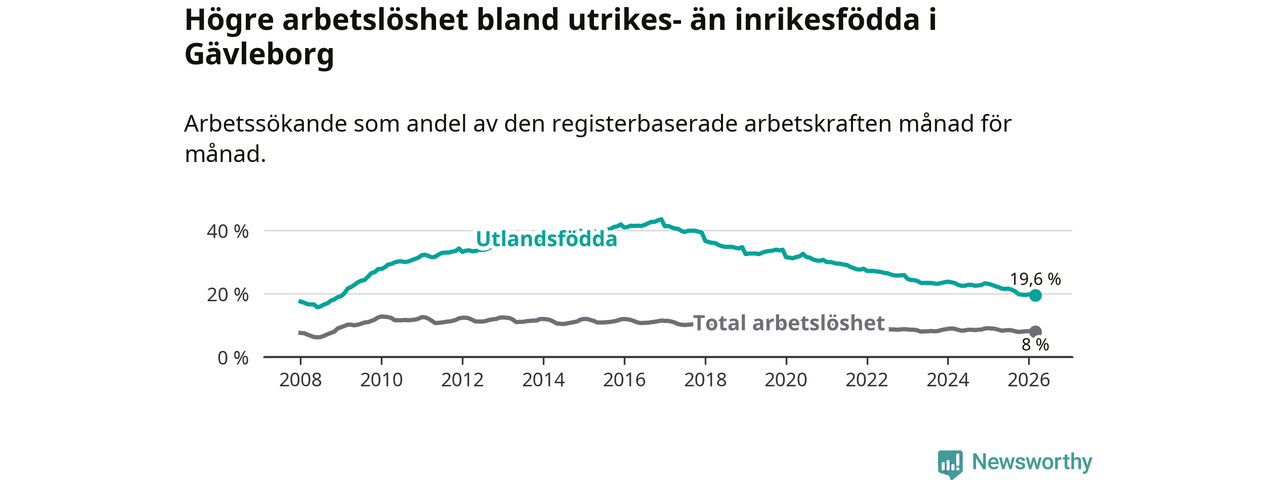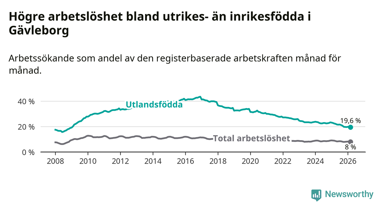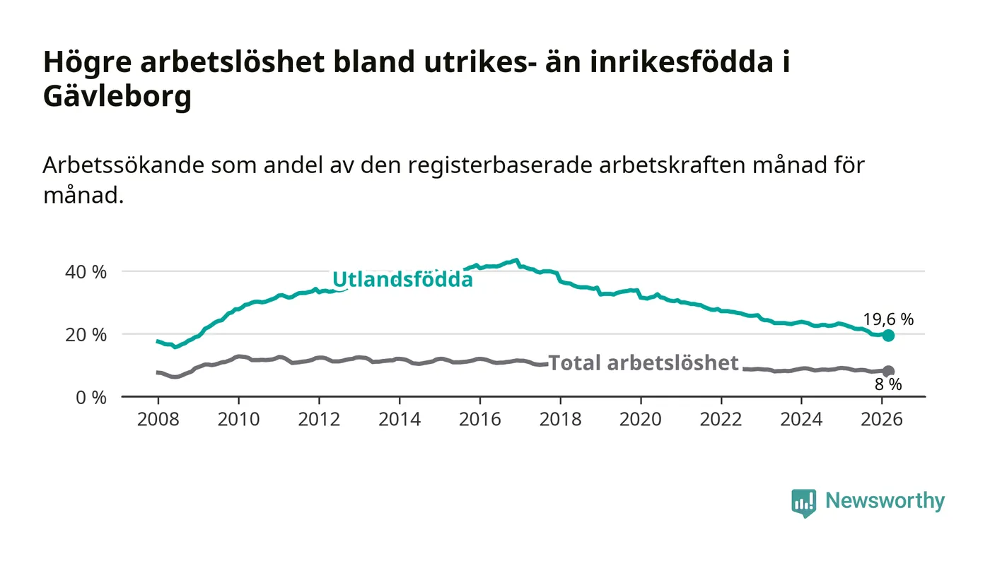 Arbetslösheten bland utlandsfödda var 19,6 procent i Gävleborg under mars månad, motsvarande 4 744 av 24 204 personer. Det är 2,8 procentenheter färre än vid samma tidpunkt i fjol (−615 om man räknar personer). Därmed har de utlandsföddas arbetslöshet varit lägre än vid samma tidpunkt i fjol i över nio år i sträck. Sedan februari 2017 har arbetslösheten bland utlandsfödda minskat från 41,4 till 19,6 procent.