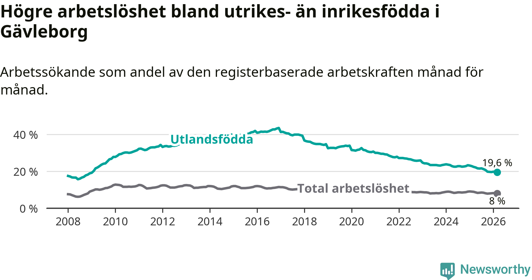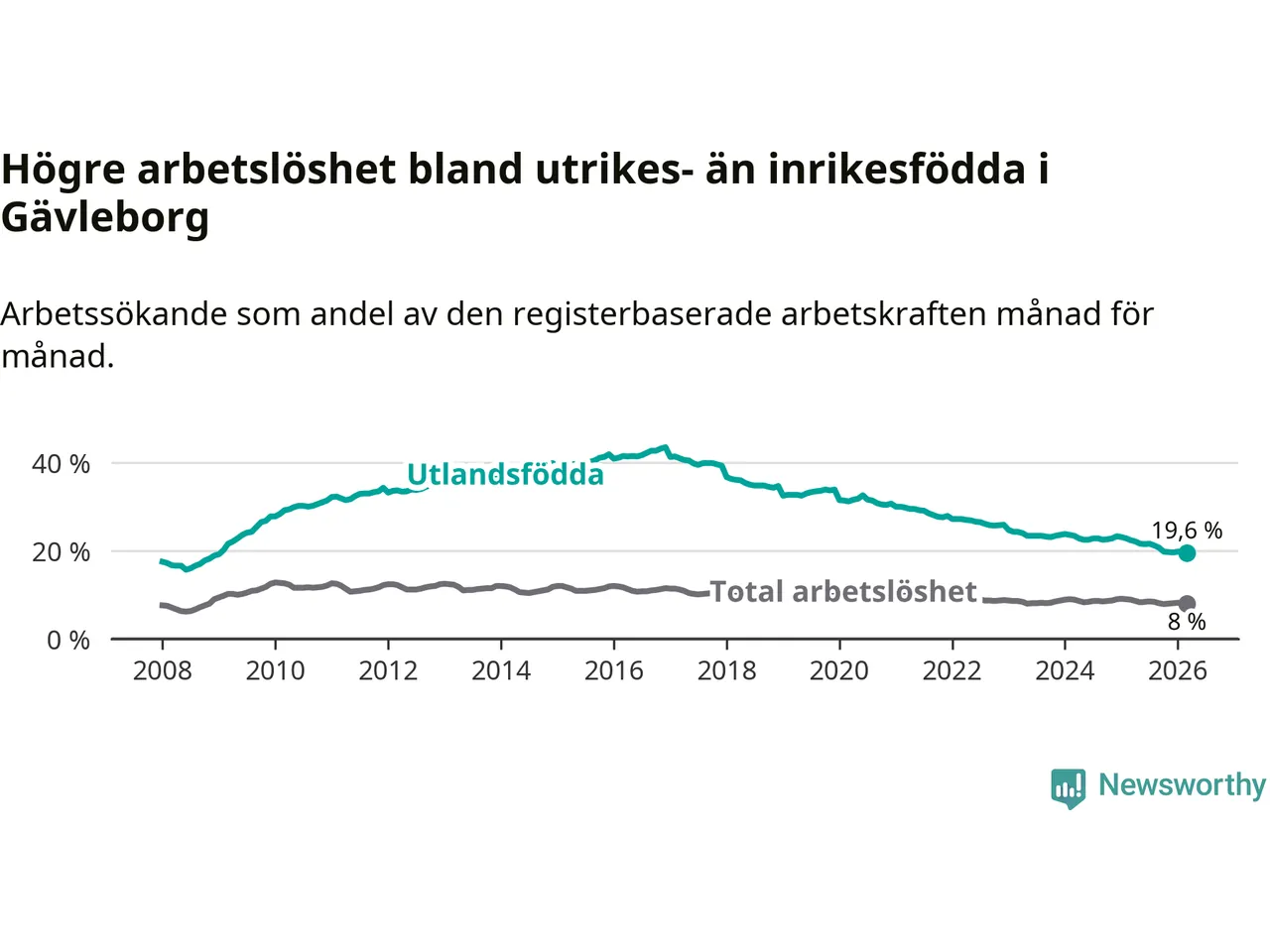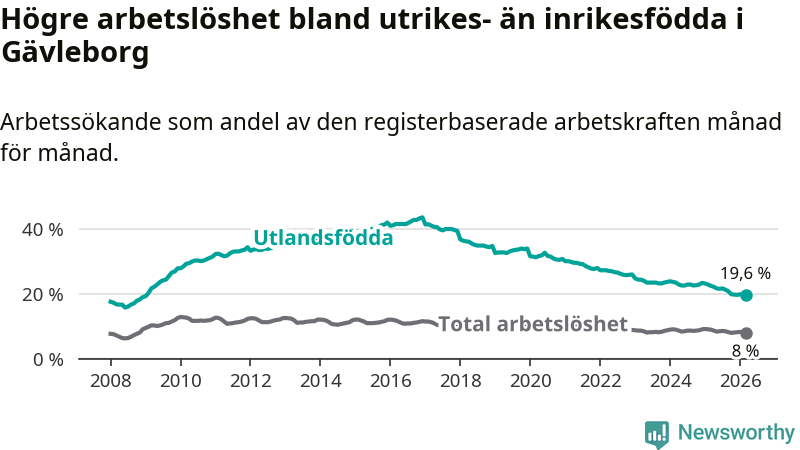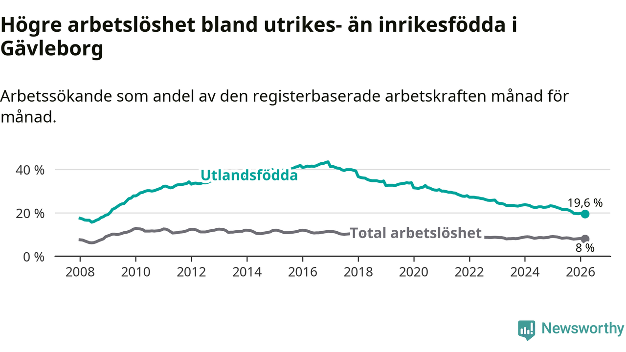 Arbetslösheten bland utlandsfödda var 19,6 procent i Gävleborg under mars månad, motsvarande 4 744 av 24 204 personer. Det är 2,8 procentenheter färre än vid samma tidpunkt i fjol (−615 om man räknar personer). Därmed har de utlandsföddas arbetslöshet varit lägre än vid samma tidpunkt i fjol i över nio år i sträck. Sedan februari 2017 har arbetslösheten bland utlandsfödda minskat från 41,4 till 19,6 procent.