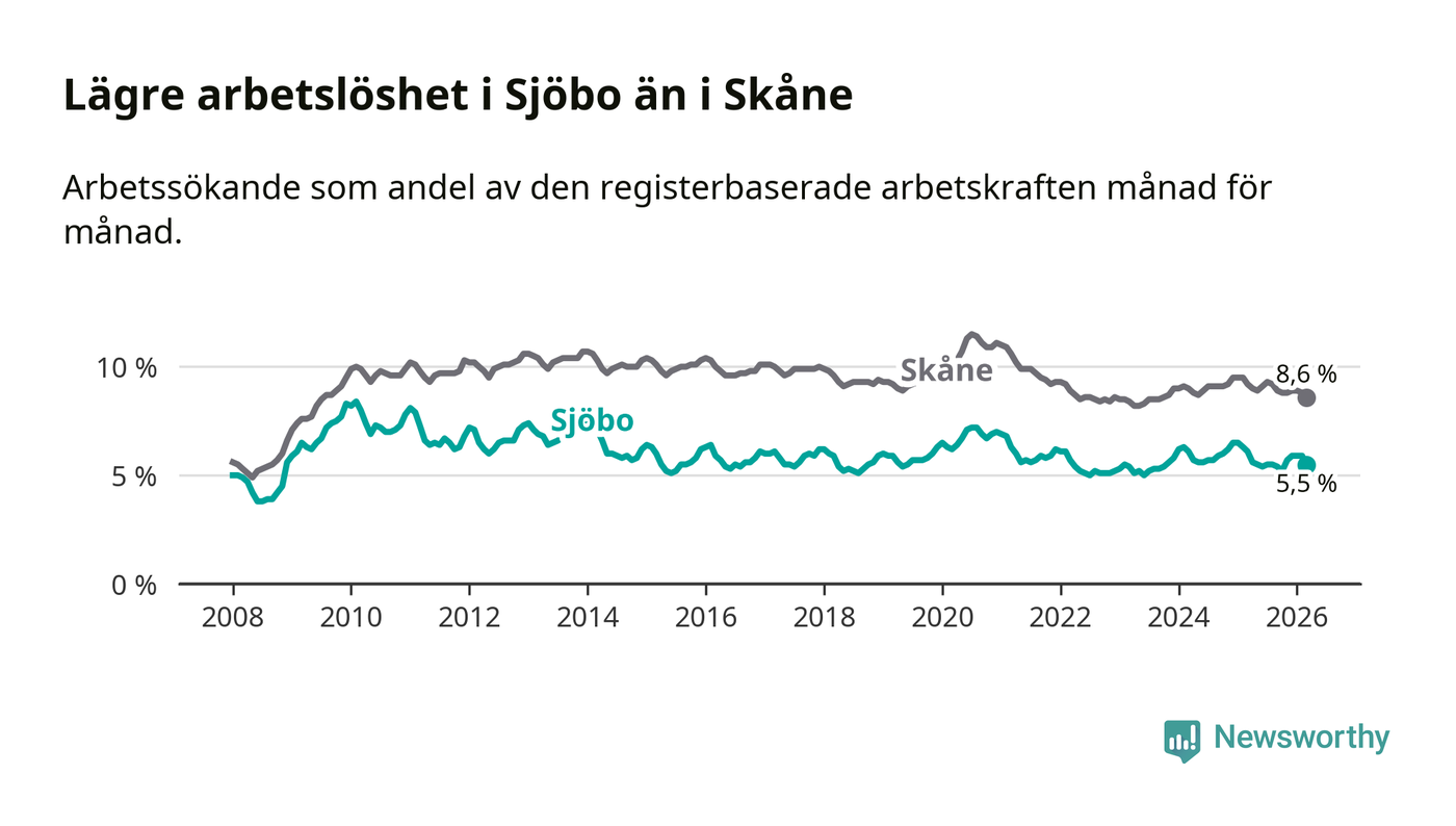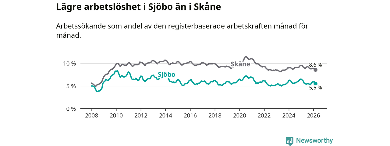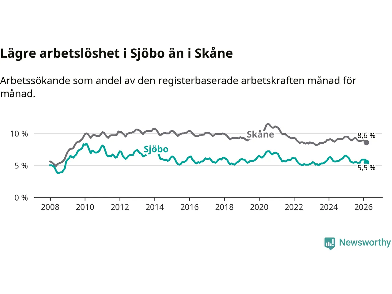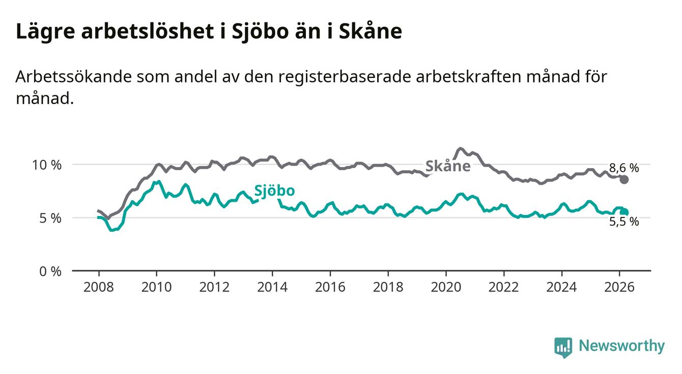 Under mars månad rapporterade Sjöbo kommun en total arbetslöshet på 5,5 procent. Det är en minskning jämfört med samma tidpunkt i fjol (−0,6 procentenheter). Även i Skåne län sjunker arbetslösheten .