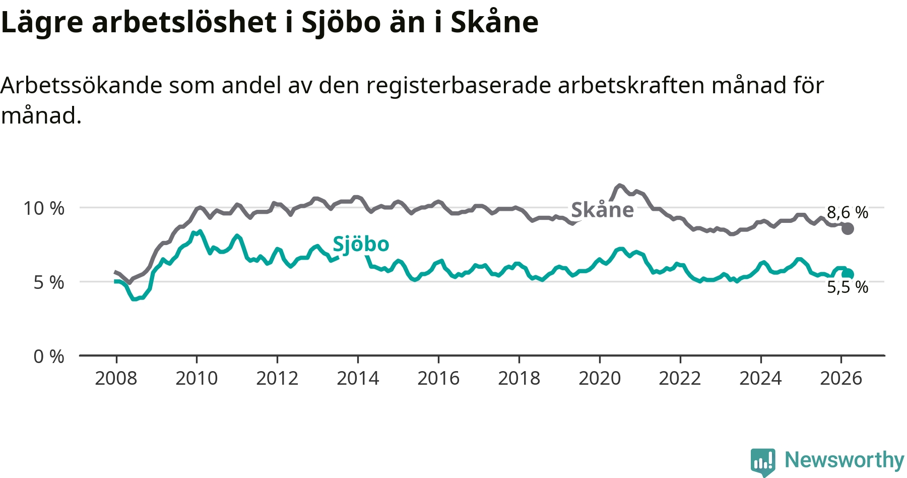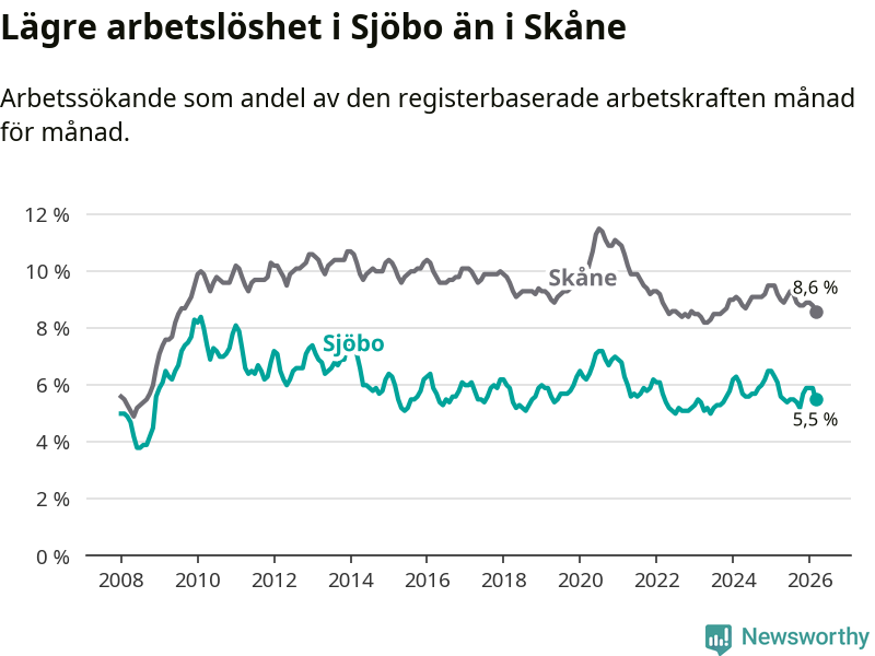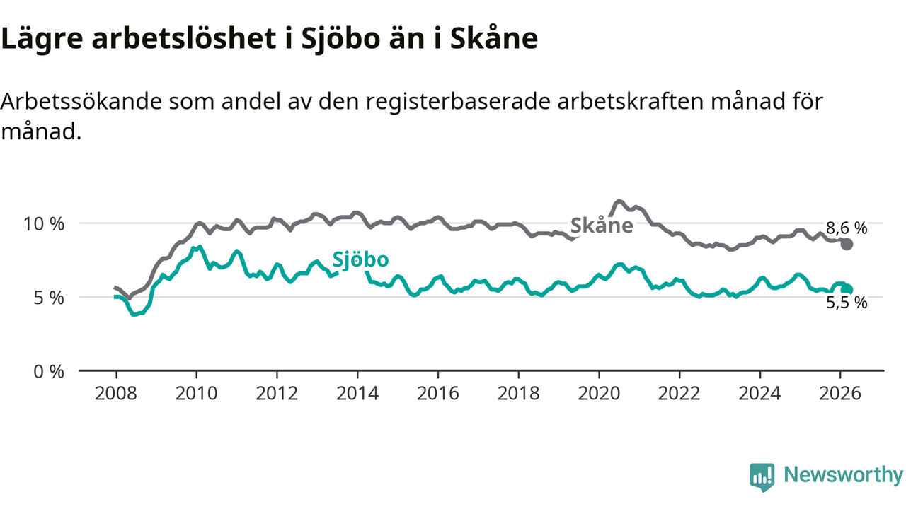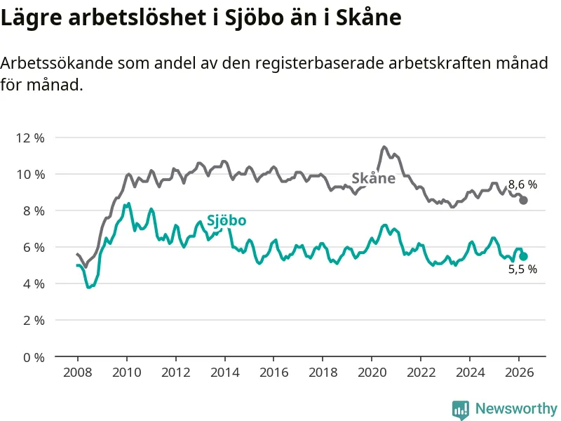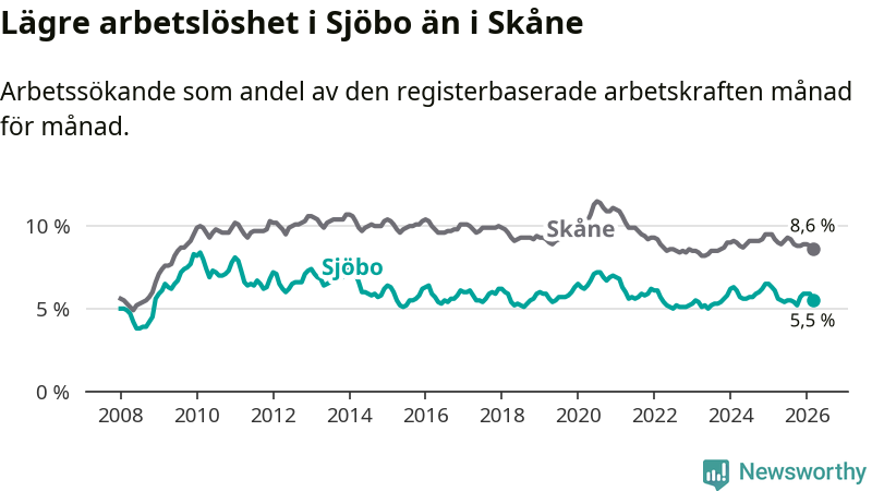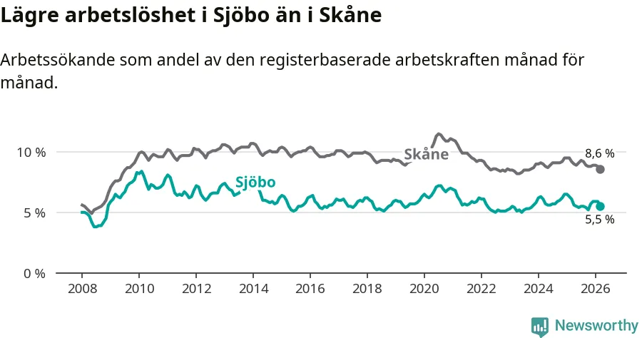 Under mars månad rapporterade Sjöbo kommun en total arbetslöshet på 5,5 procent. Det är en minskning jämfört med samma tidpunkt i fjol (−0,6 procentenheter). Även i Skåne län sjunker arbetslösheten .