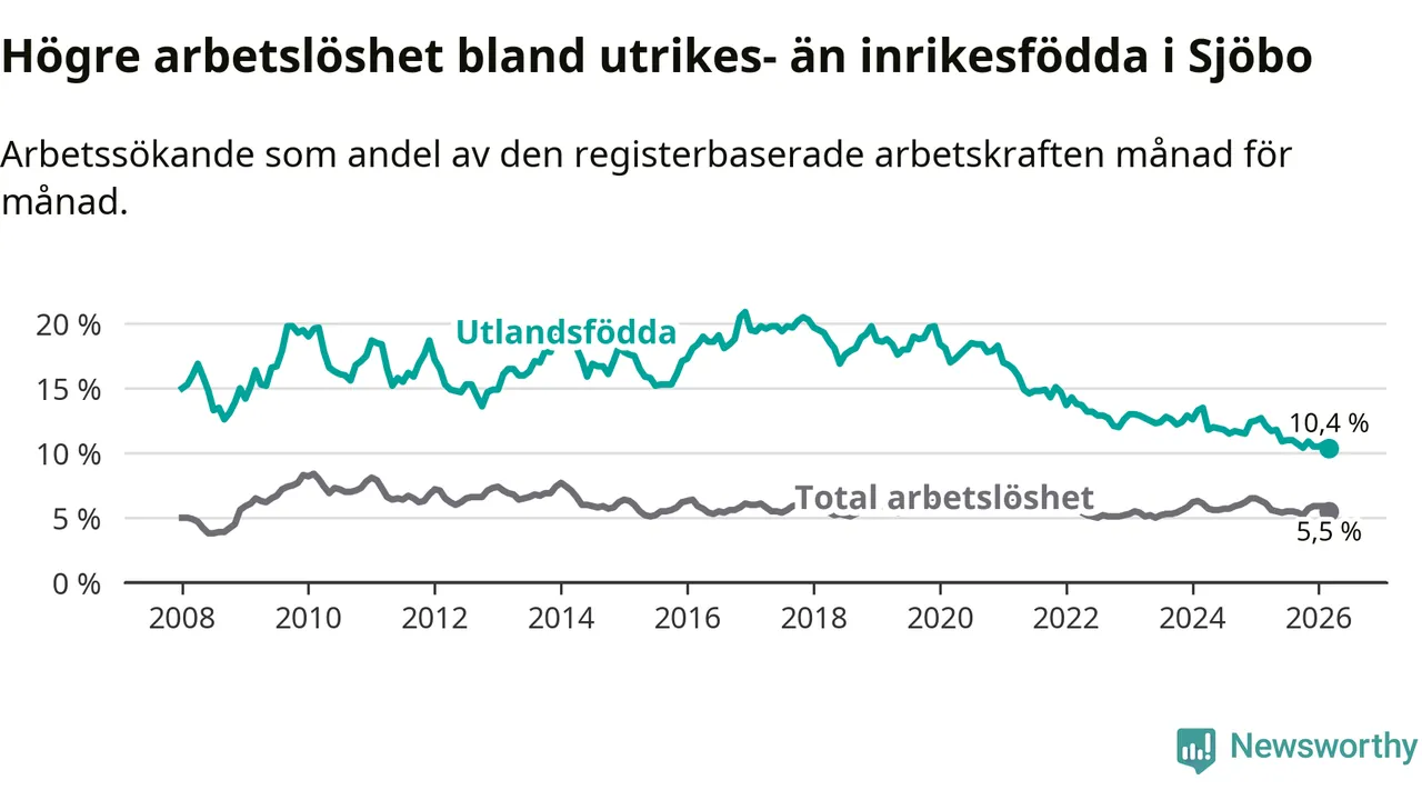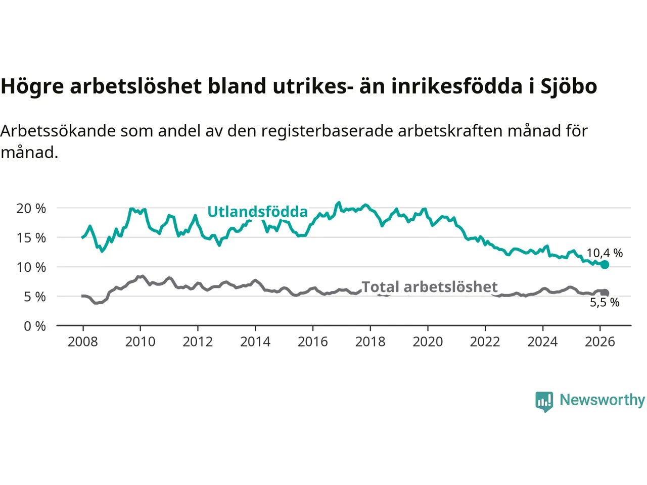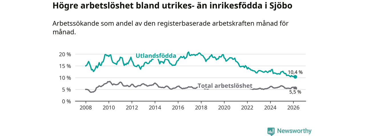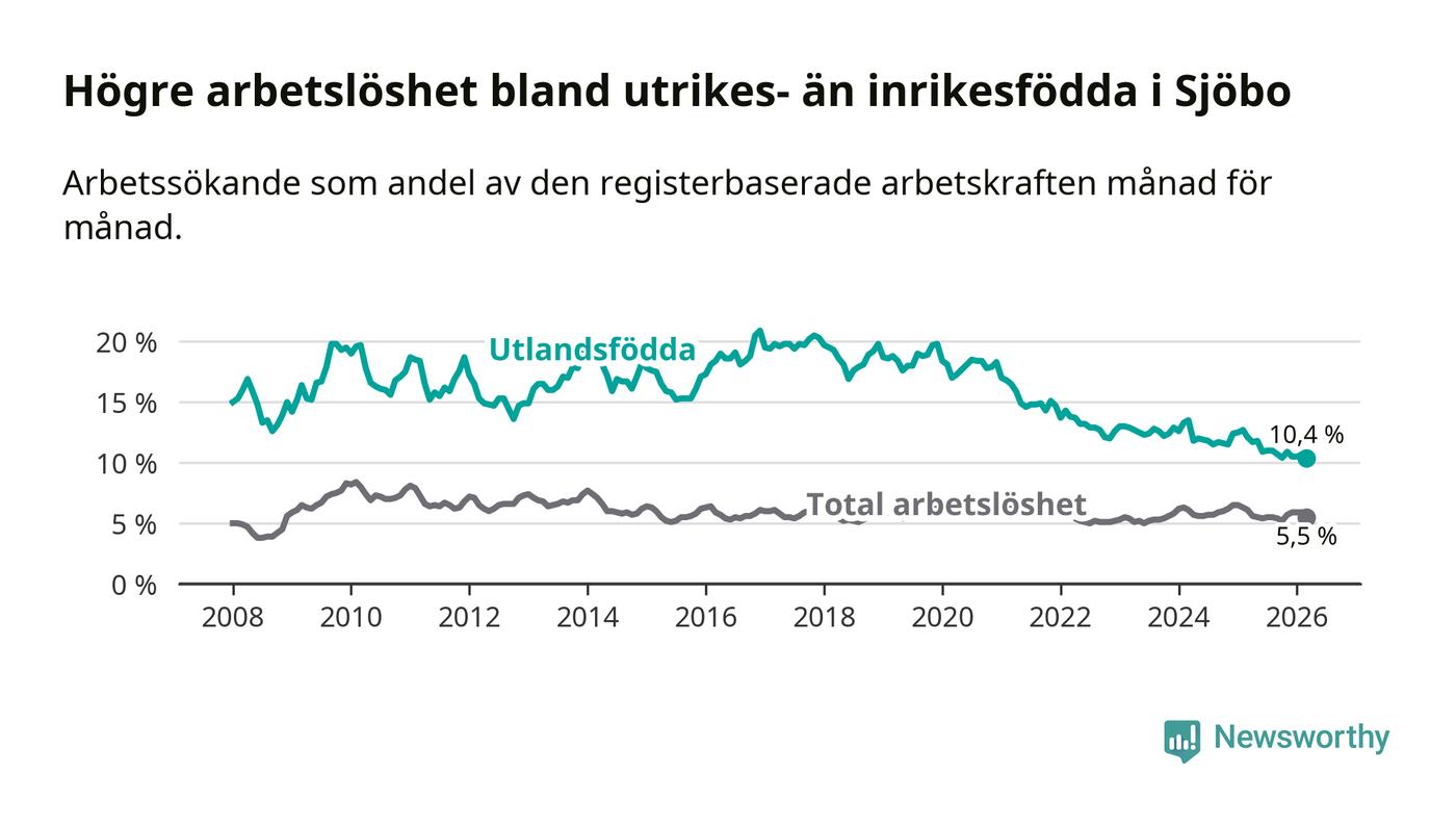 Arbetslösheten bland utlandsfödda var 10,4 procent i Sjöbo under mars månad, motsvarande 132 av 1 269 personer. Det är 1,7 procentenheter färre än vid samma tidpunkt i fjol (−19 om man räknar personer). Därmed är de utlandsföddas arbetslöshet lägre än vid samma tidpunkt i fjol för 24:e månaden i följd. Sedan mars 2024 har arbetslösheten bland utlandsfödda minskat från 13,5 till 10,4 procent.