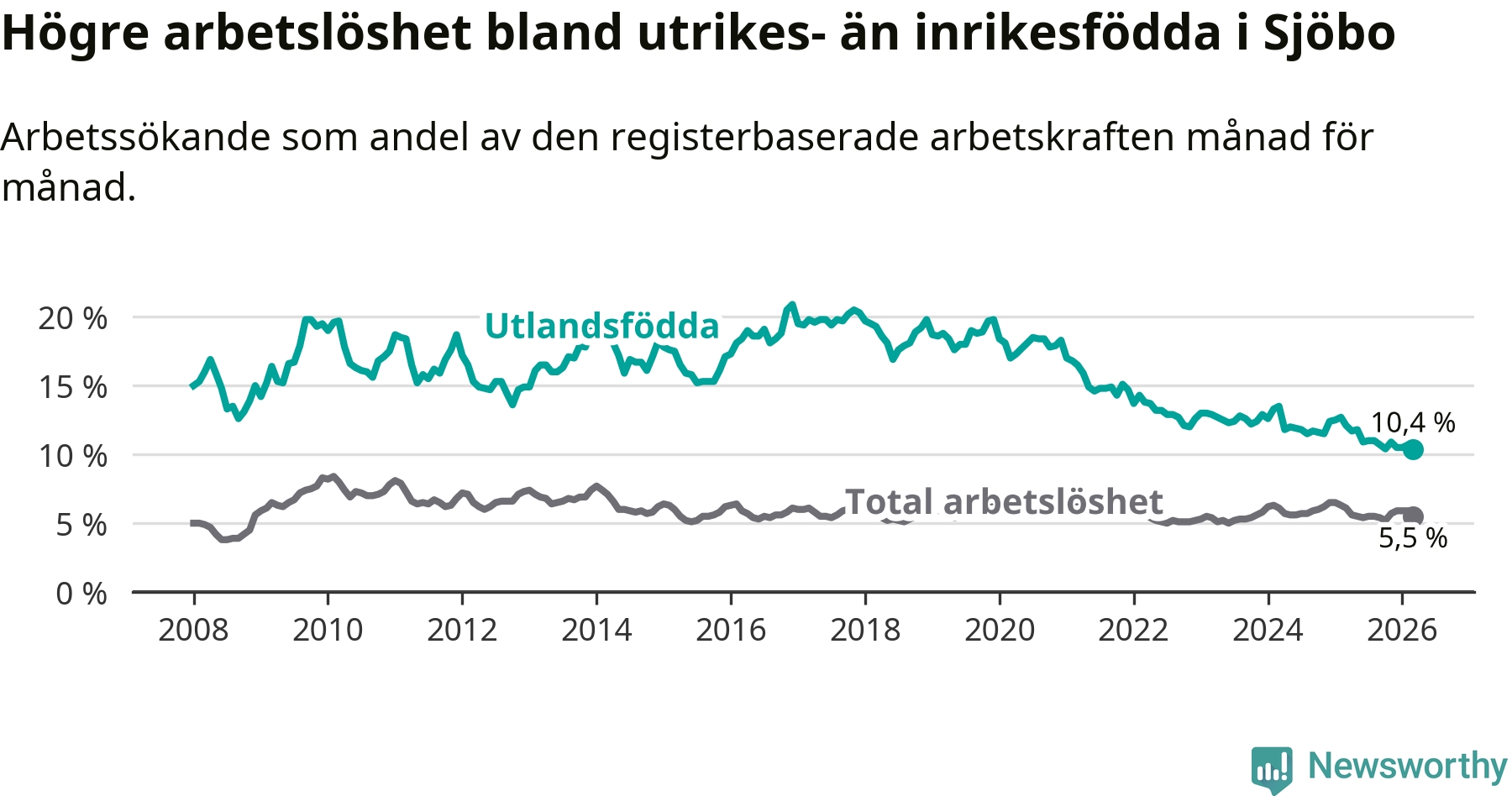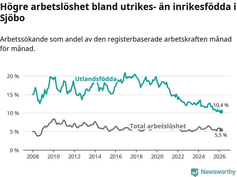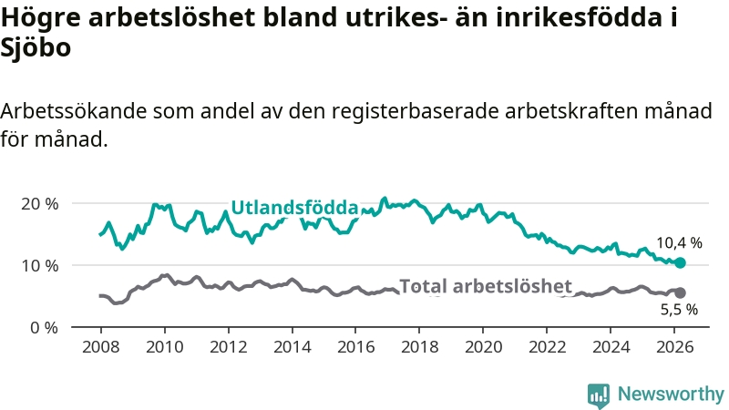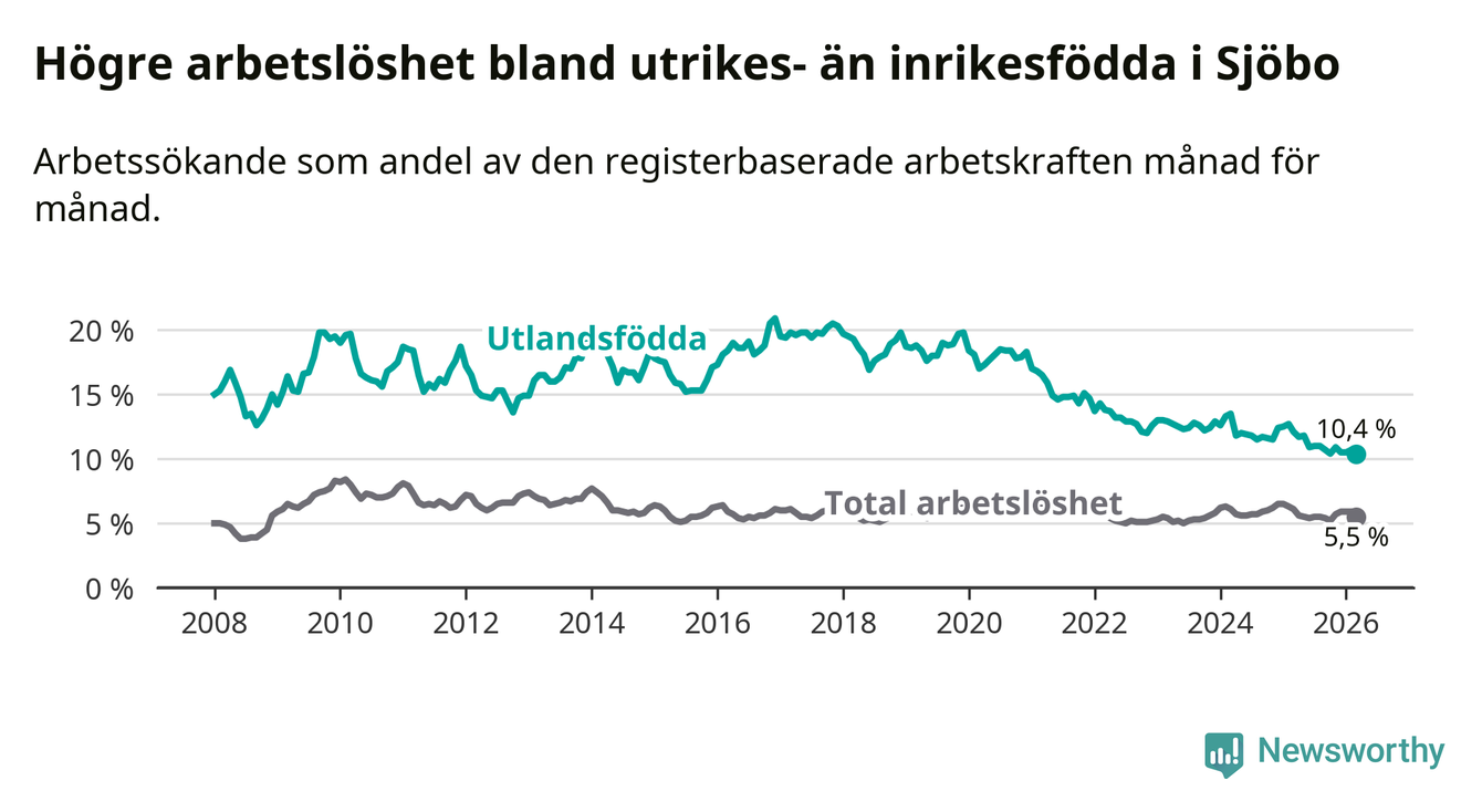 Arbetslösheten bland utlandsfödda var 10,4 procent i Sjöbo under mars månad, motsvarande 132 av 1 269 personer. Det är 1,7 procentenheter färre än vid samma tidpunkt i fjol (−19 om man räknar personer). Därmed är de utlandsföddas arbetslöshet lägre än vid samma tidpunkt i fjol för 24:e månaden i följd. Sedan mars 2024 har arbetslösheten bland utlandsfödda minskat från 13,5 till 10,4 procent.