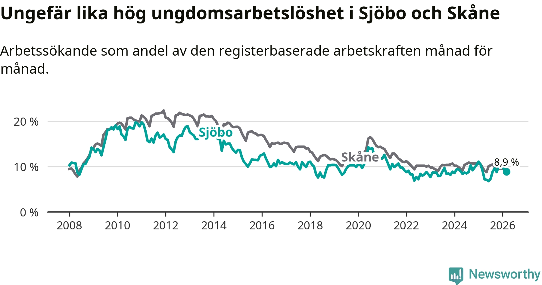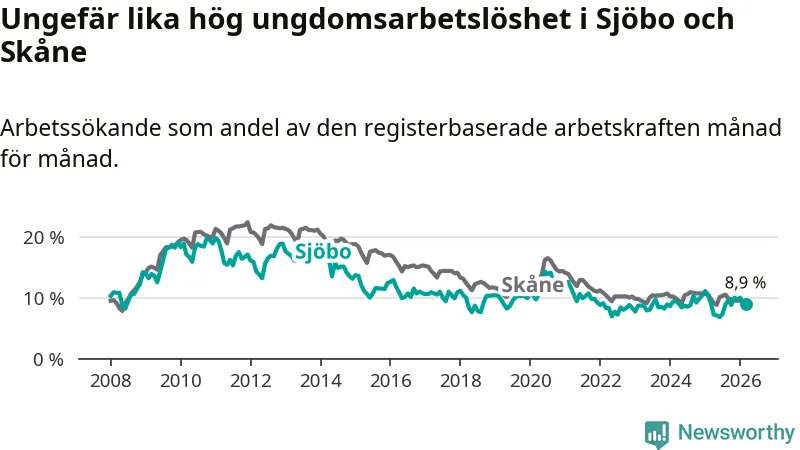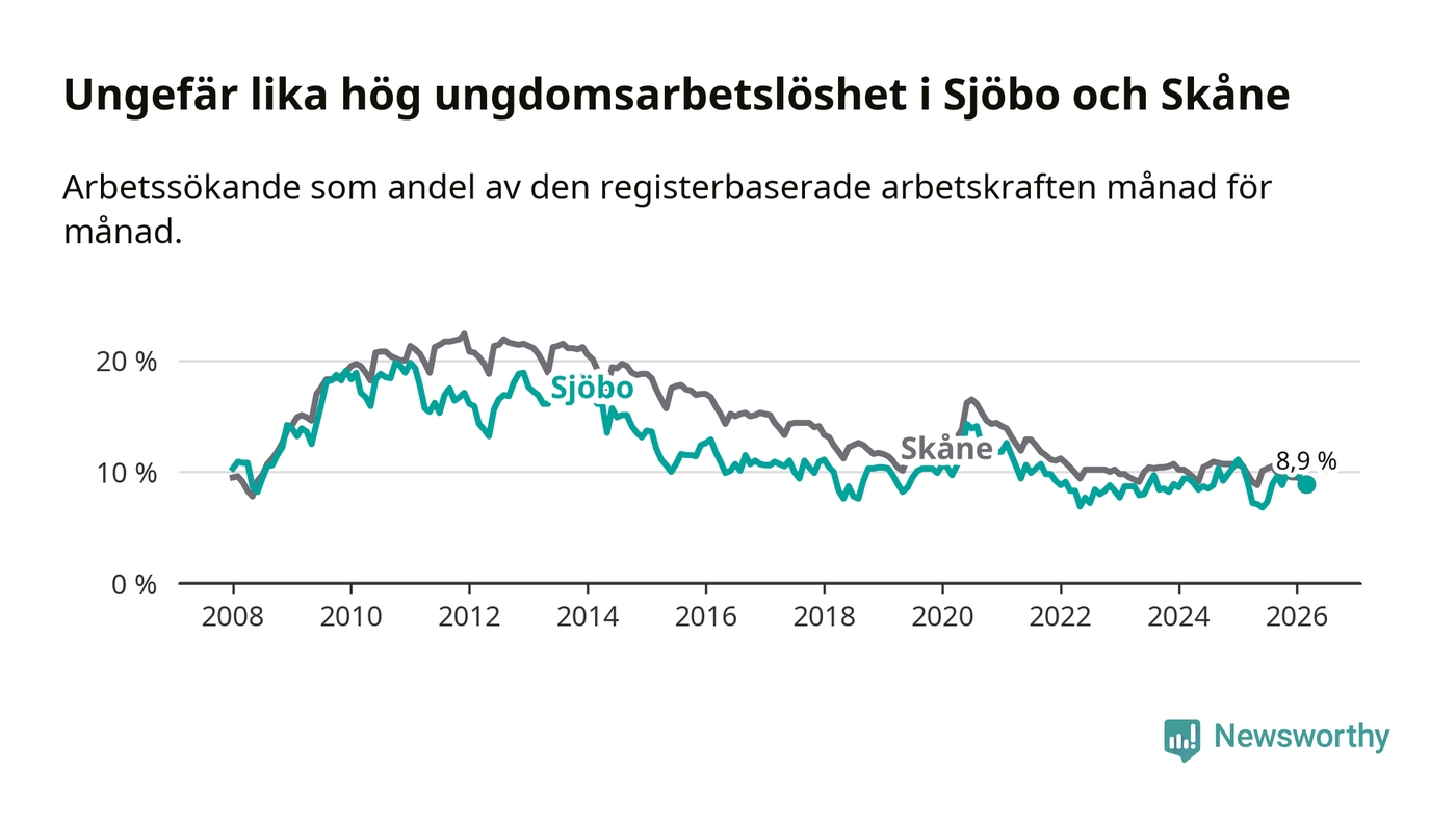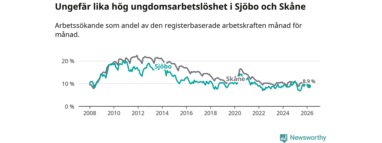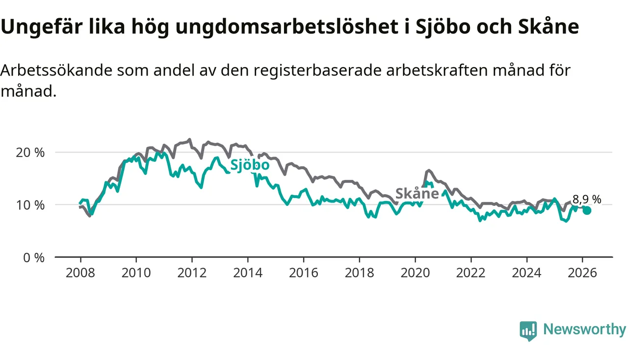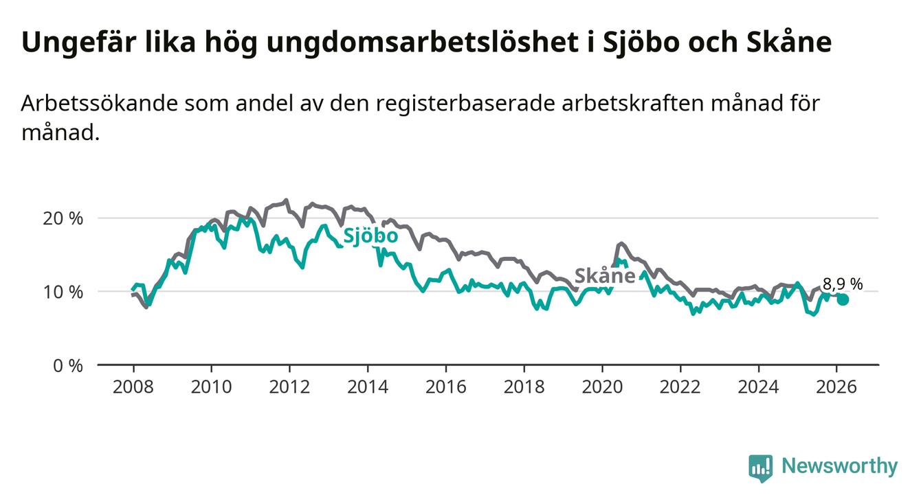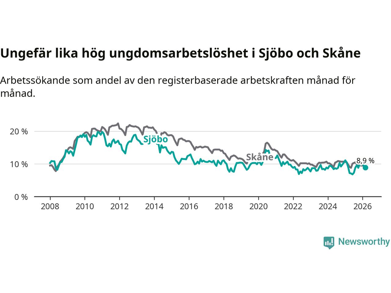 Medan Sjöbo har lägre total arbetslöshet än Skåne, ligger ungdomsarbetslösheten på i stort sett samma nivå.