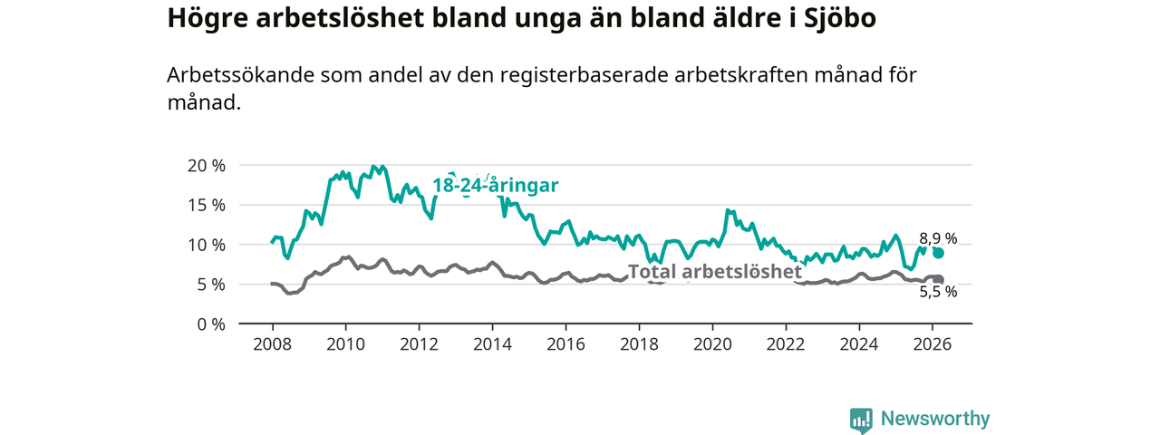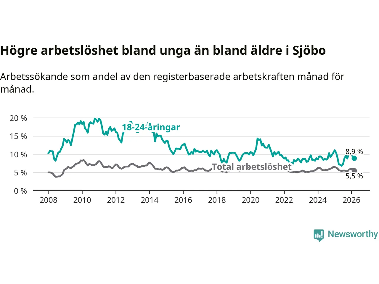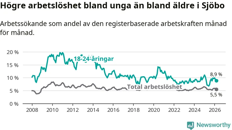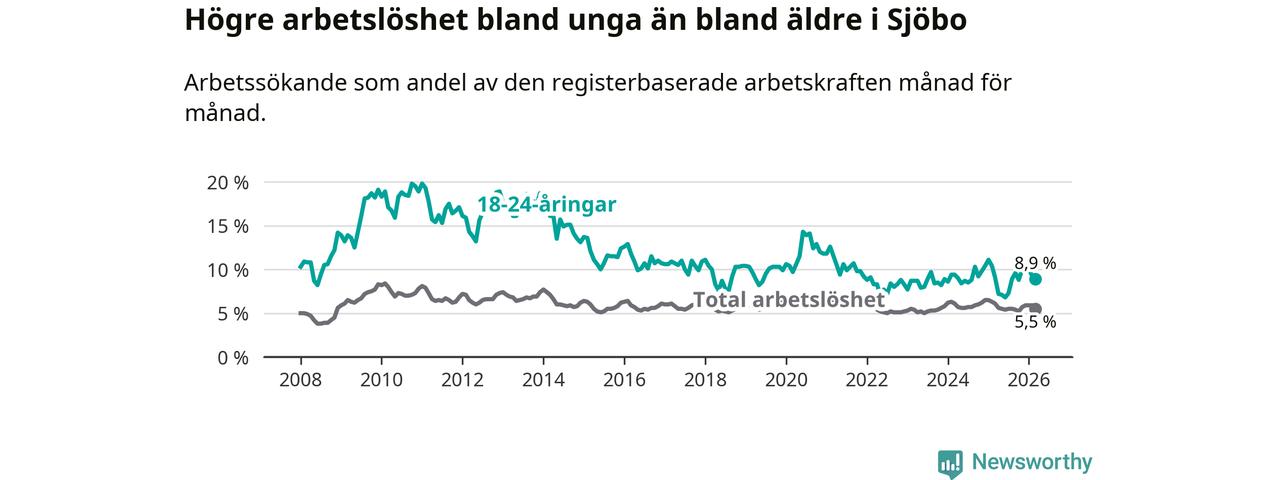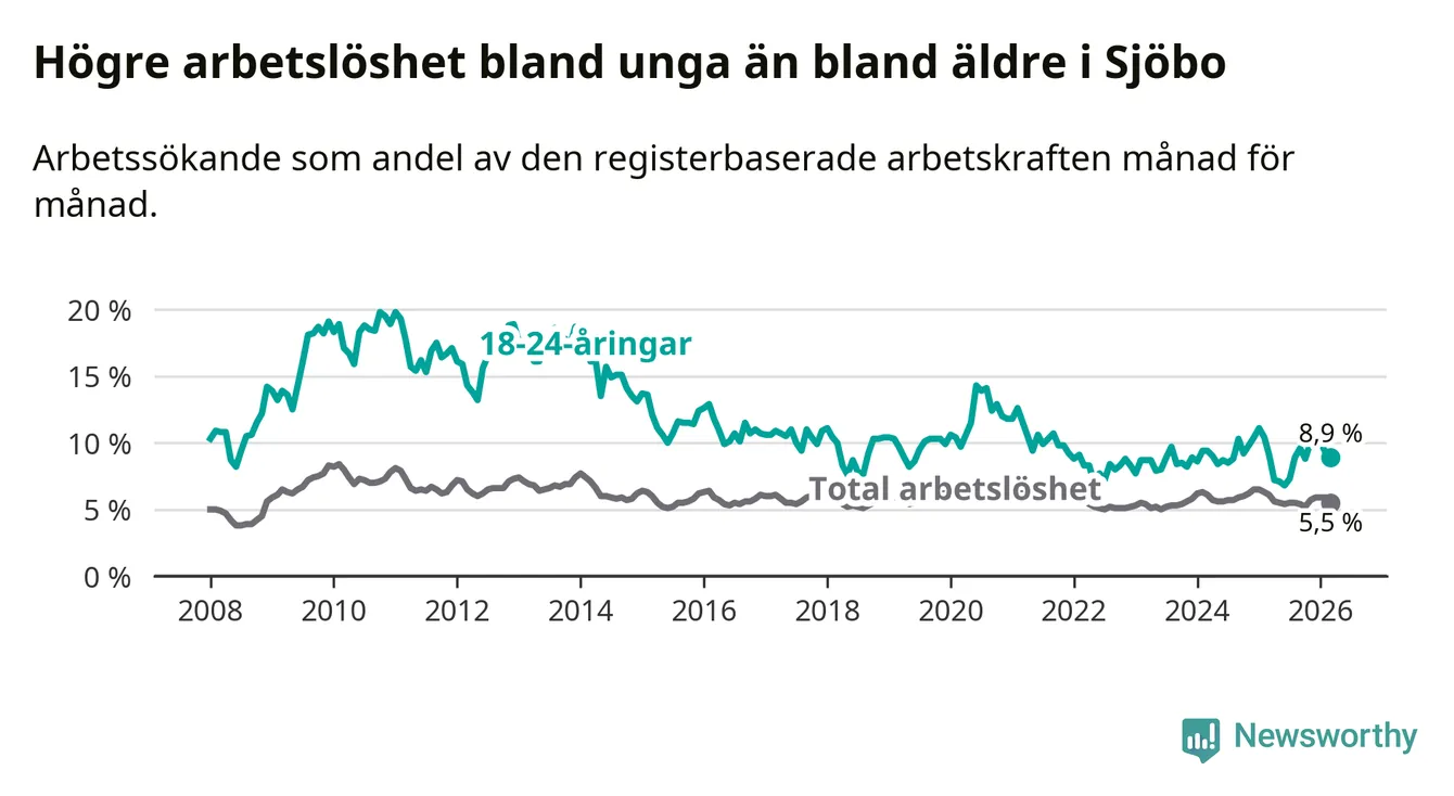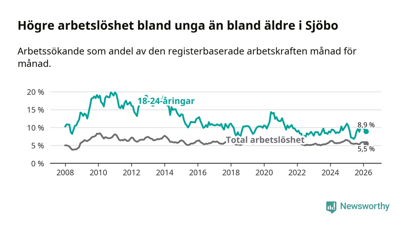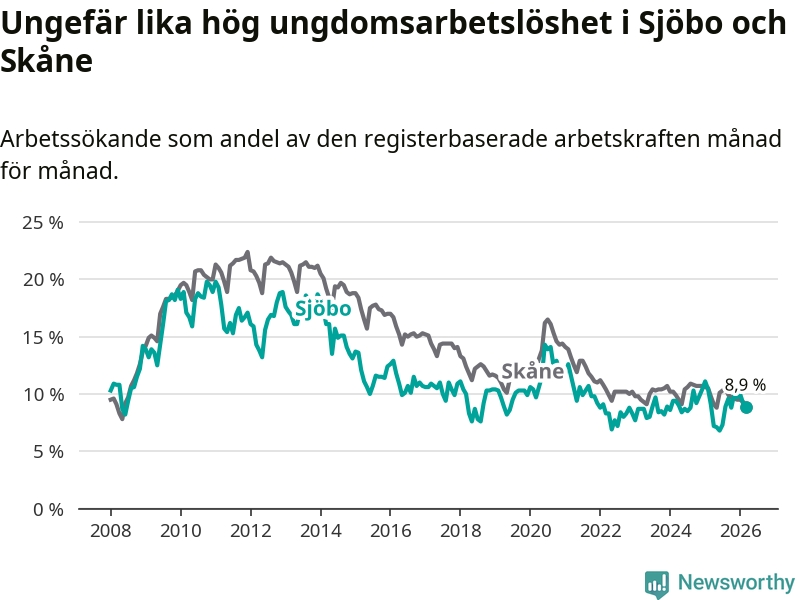 Medan Sjöbo har lägre total arbetslöshet än Skåne, ligger ungdomsarbetslösheten på i stort sett samma nivå.