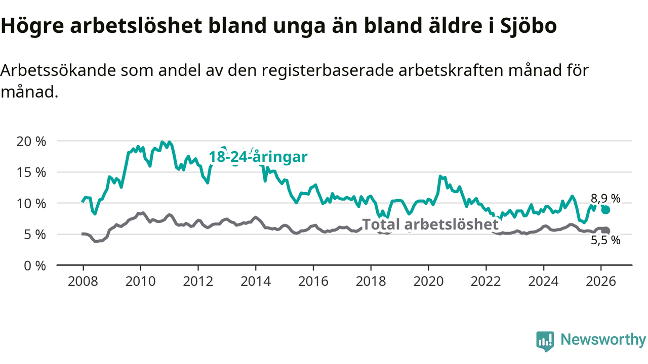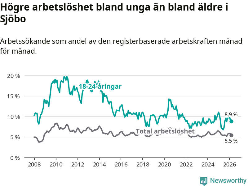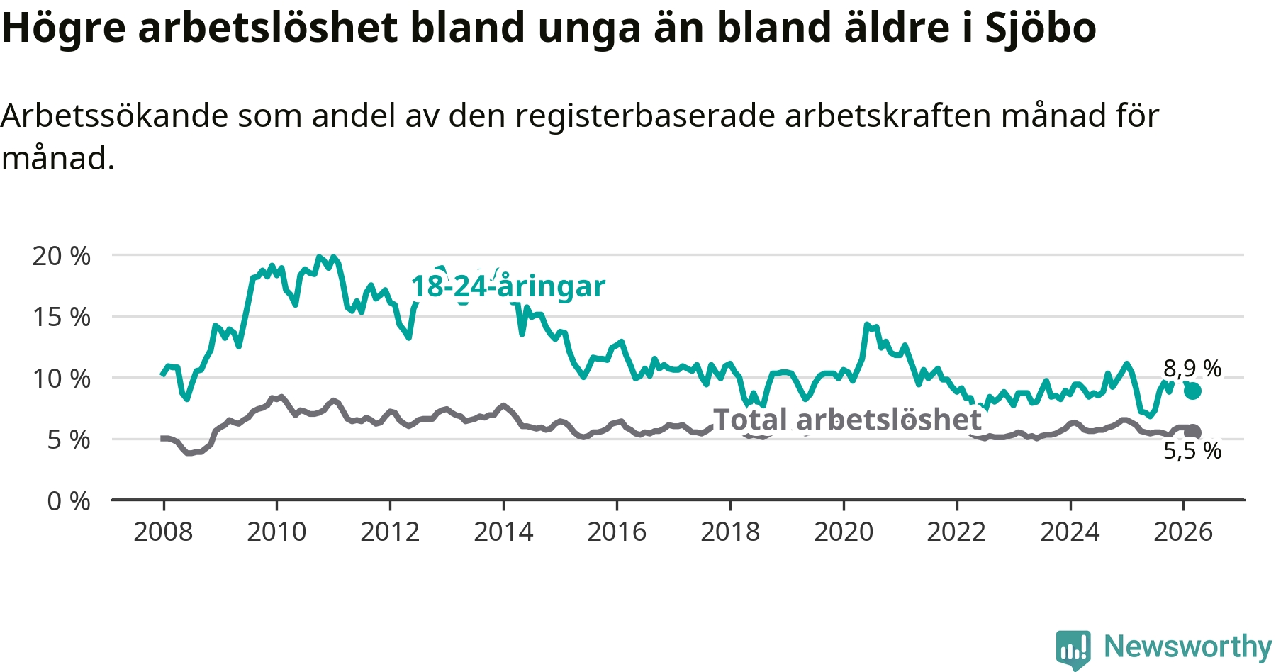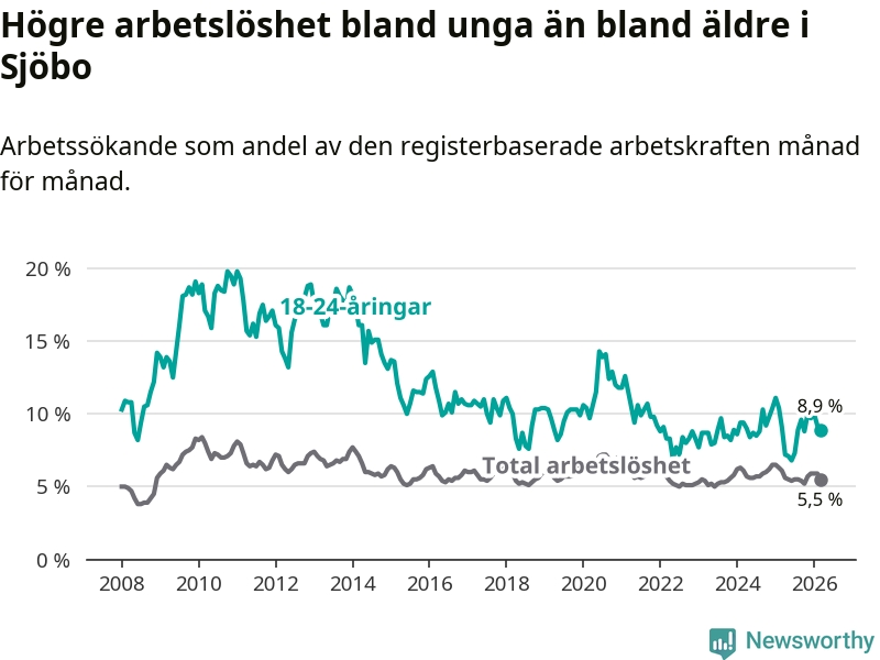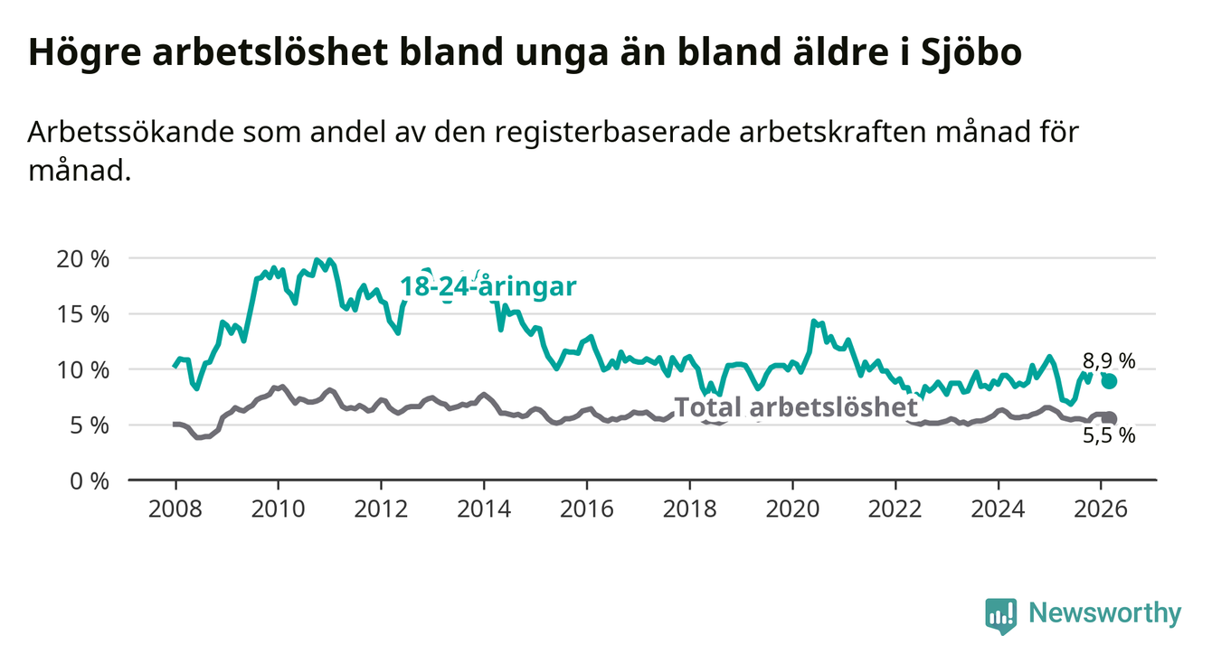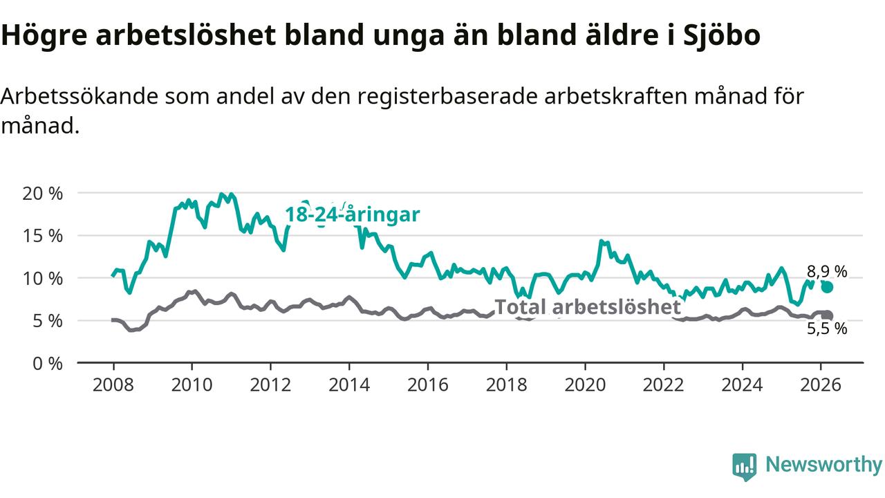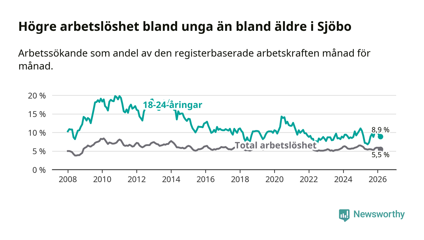 Medan Sjöbo har lägre total arbetslöshet än Skåne, ligger ungdomsarbetslösheten på i stort sett samma nivå.