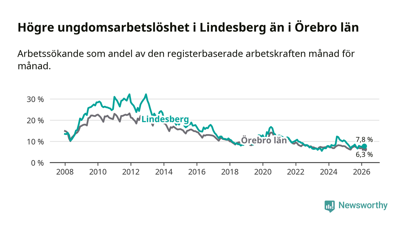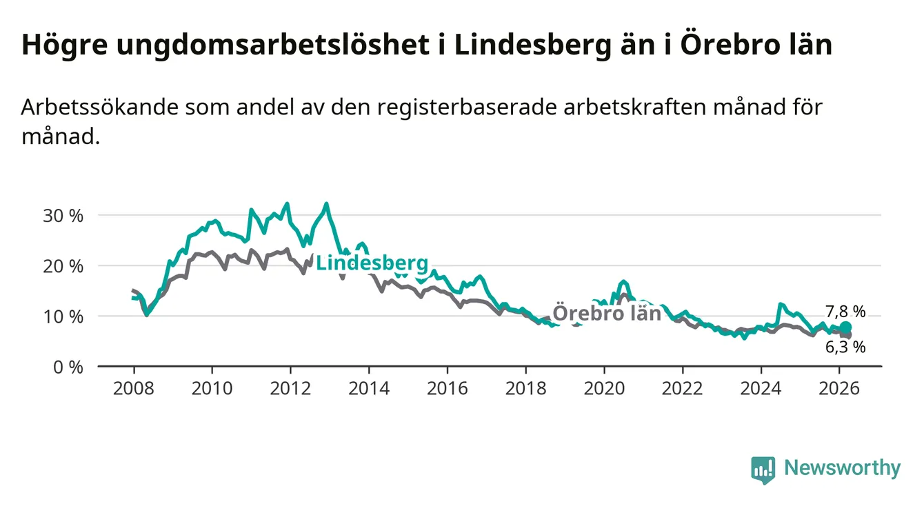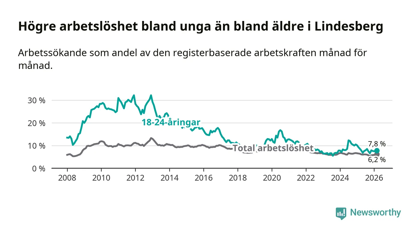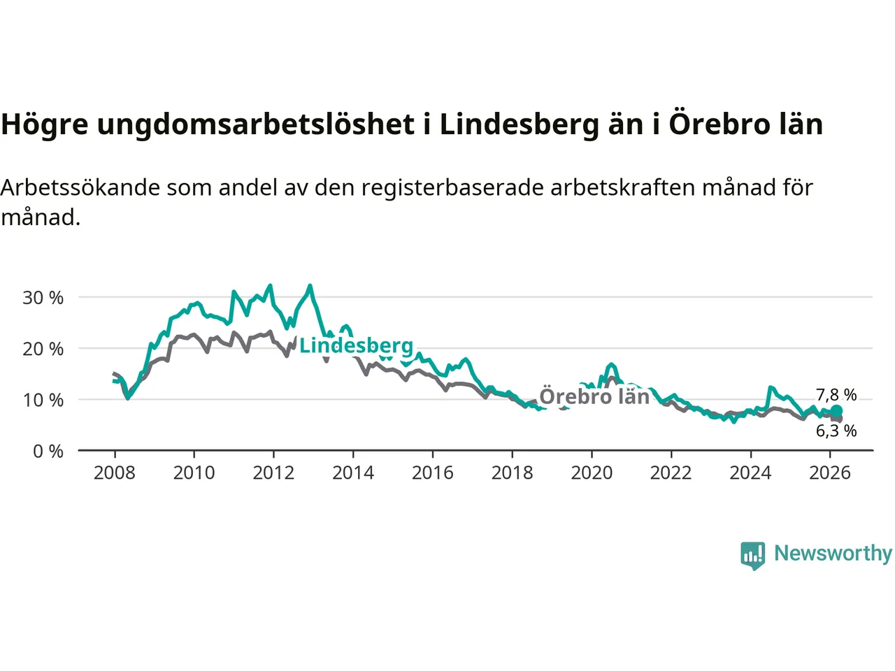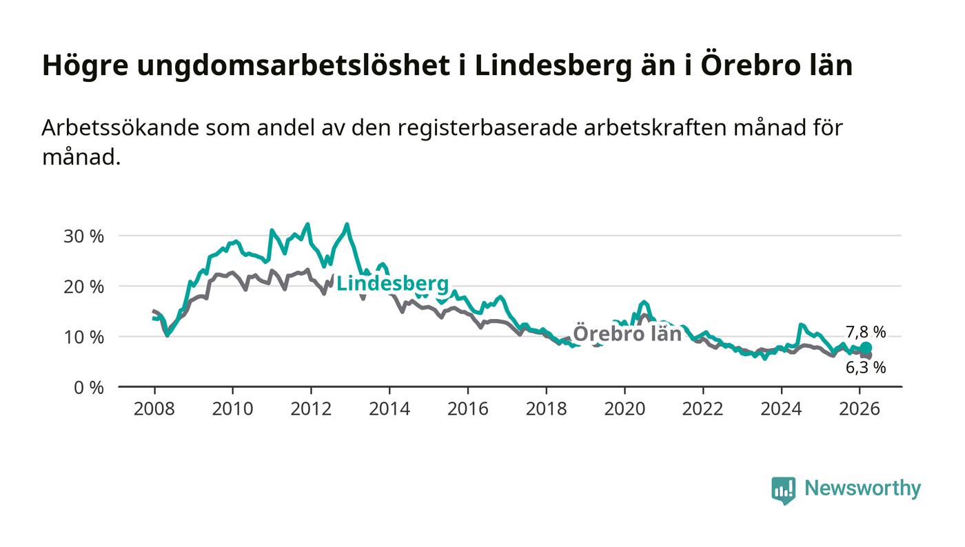 I och med den senaste månadens nedgång har de ungas arbetslöshet i Lindesberg sjunkit tolv månader i följd (ner från 8,6 procent i mars 2025 till 7,8 procent nu).