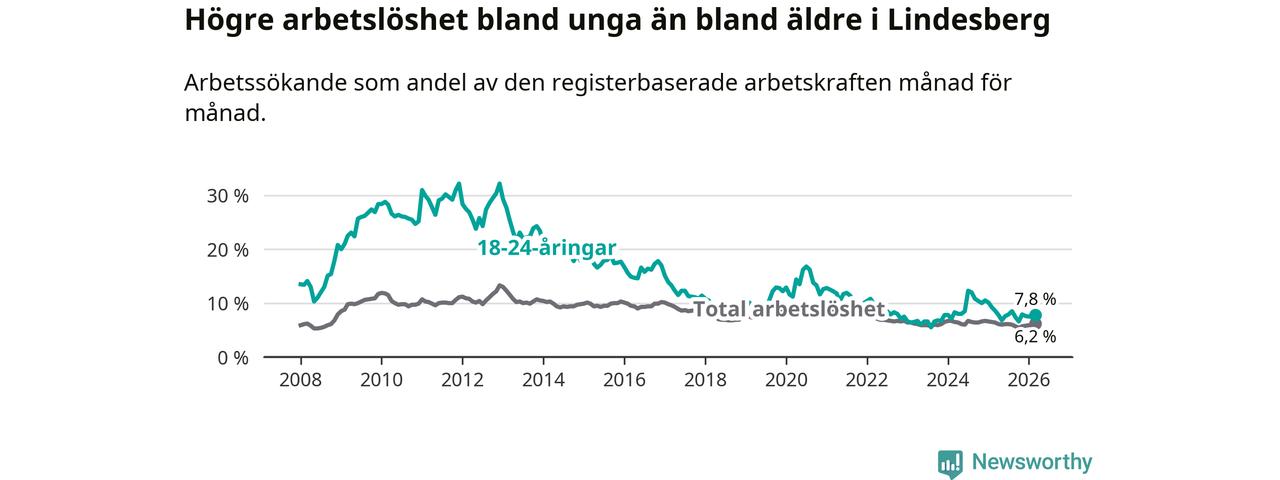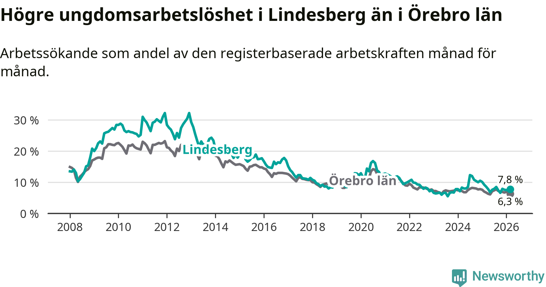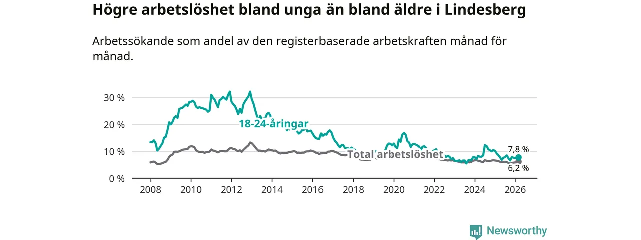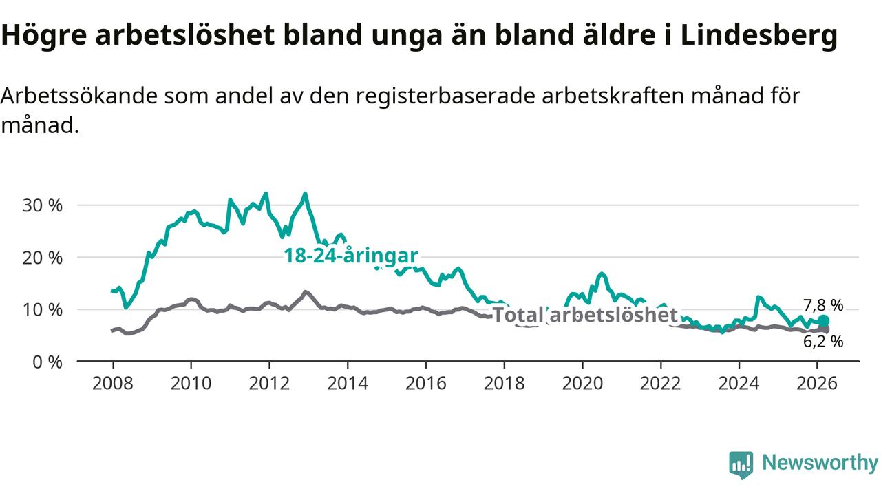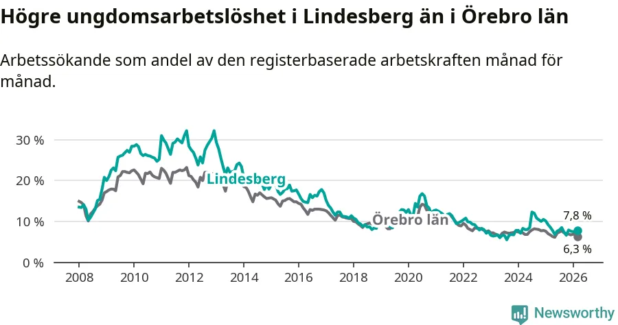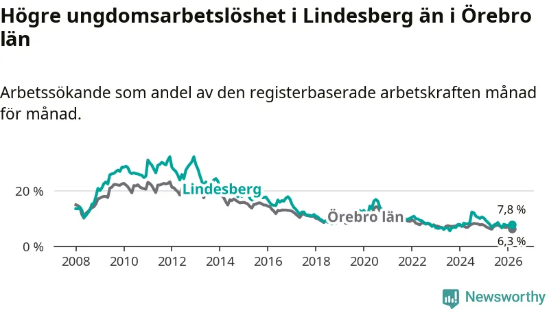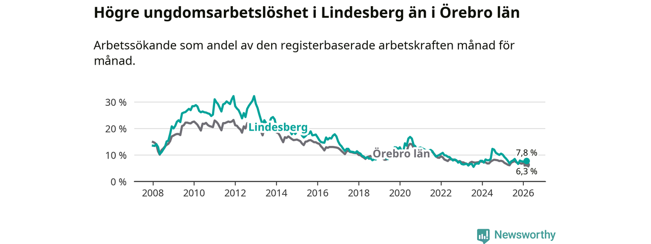 I och med den senaste månadens nedgång har de ungas arbetslöshet i Lindesberg sjunkit tolv månader i följd (ner från 8,6 procent i mars 2025 till 7,8 procent nu).