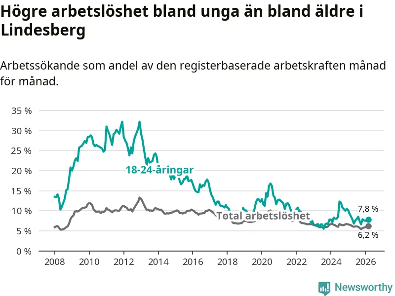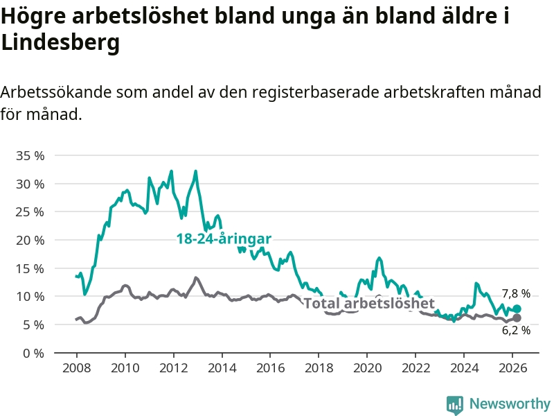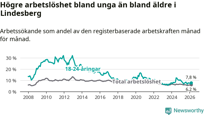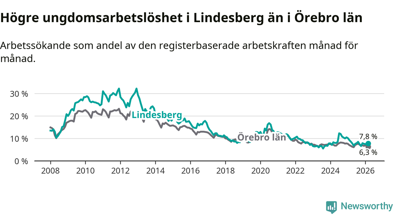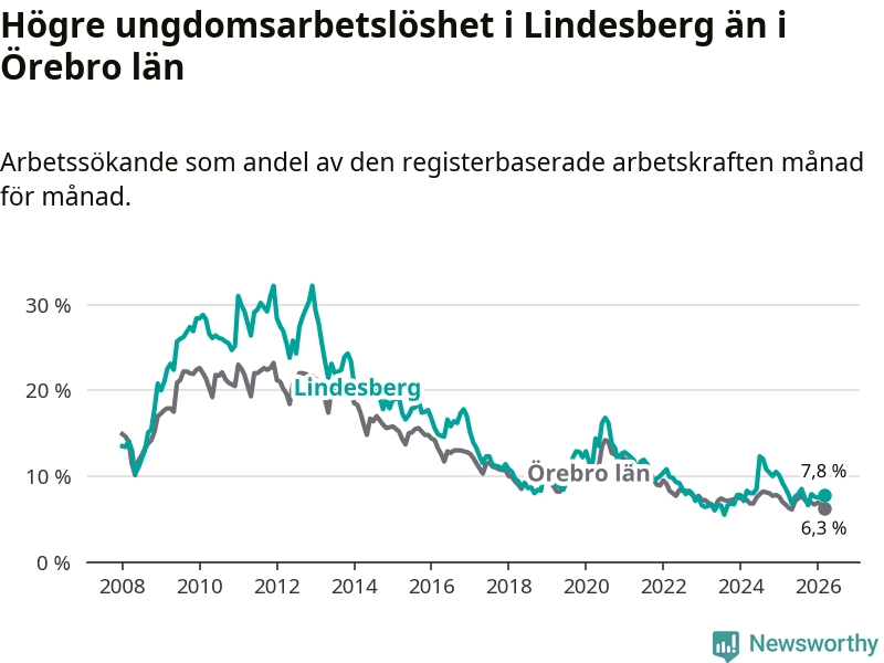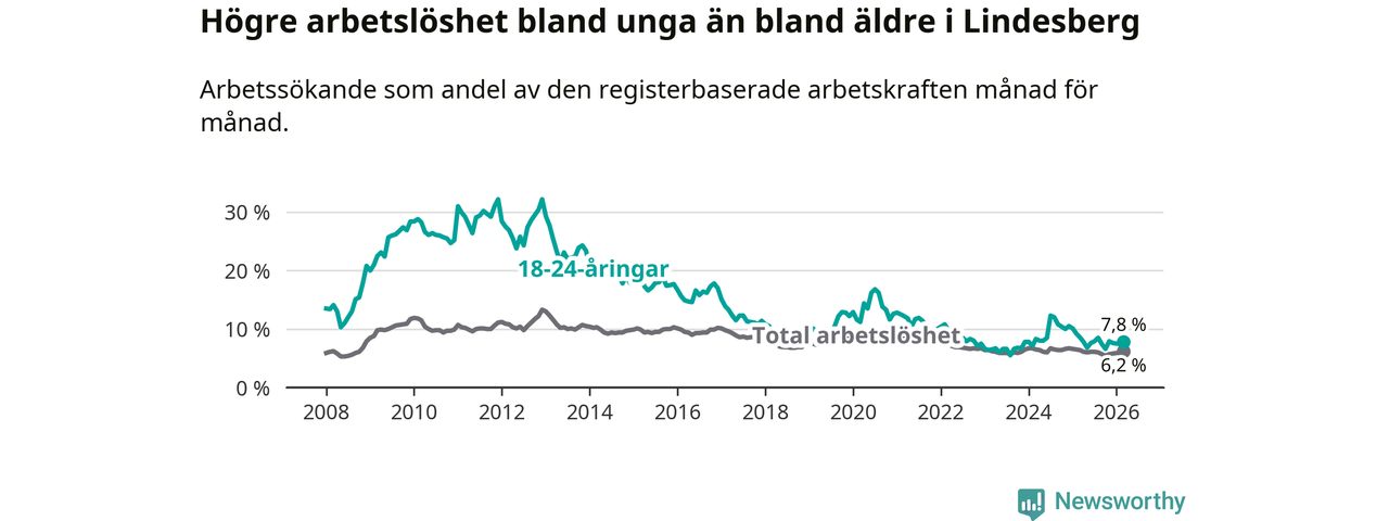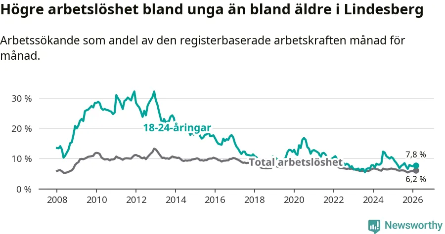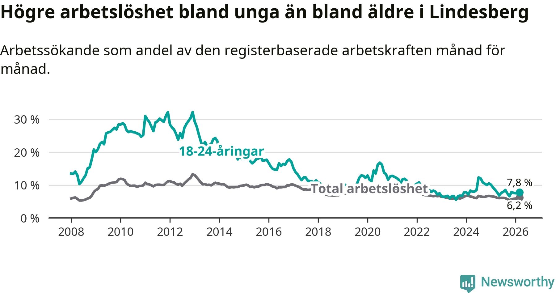 I och med den senaste månadens nedgång har de ungas arbetslöshet i Lindesberg sjunkit tolv månader i följd (ner från 8,6 procent i mars 2025 till 7,8 procent nu).
