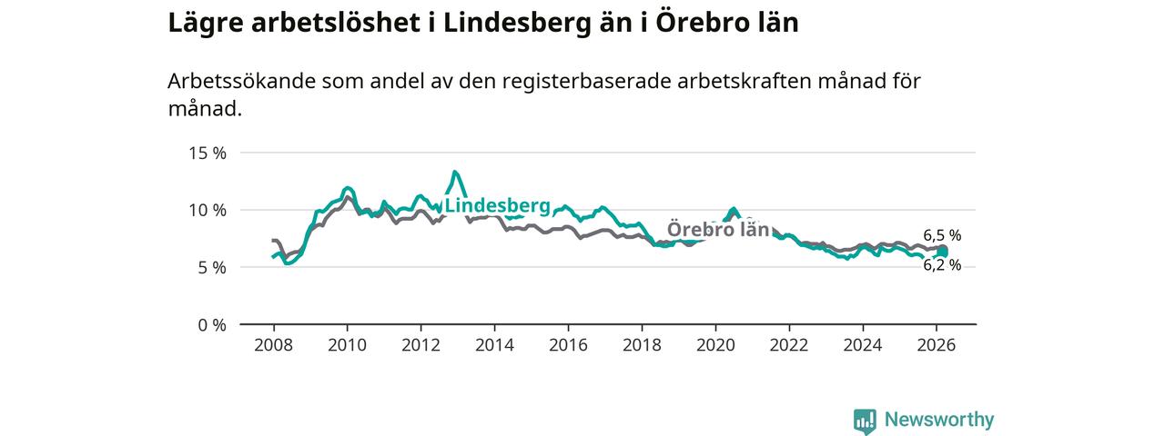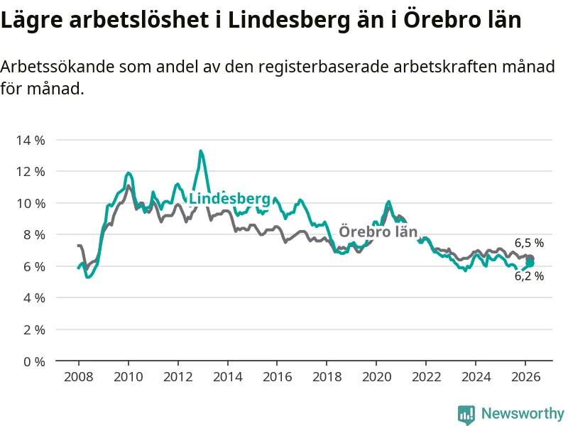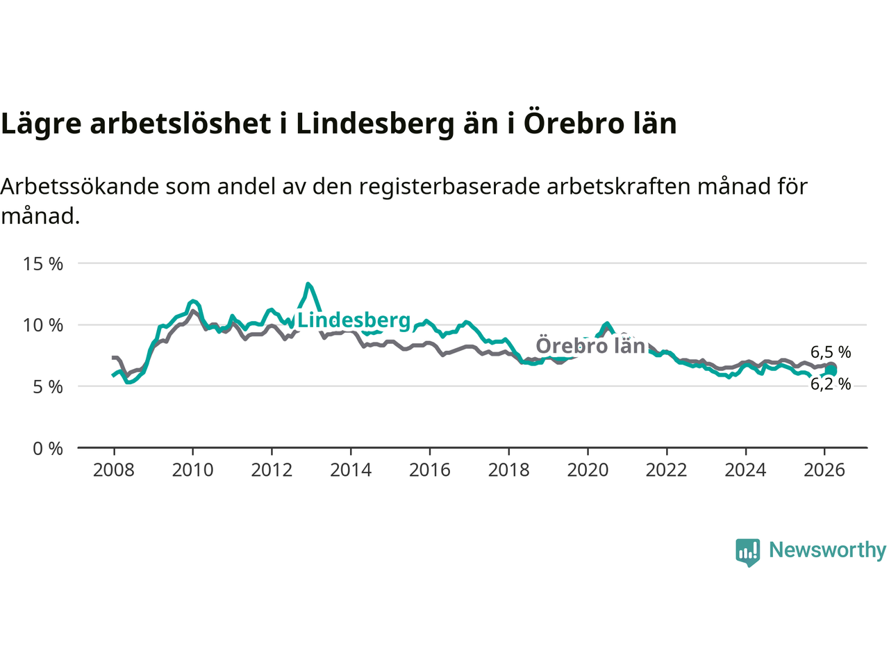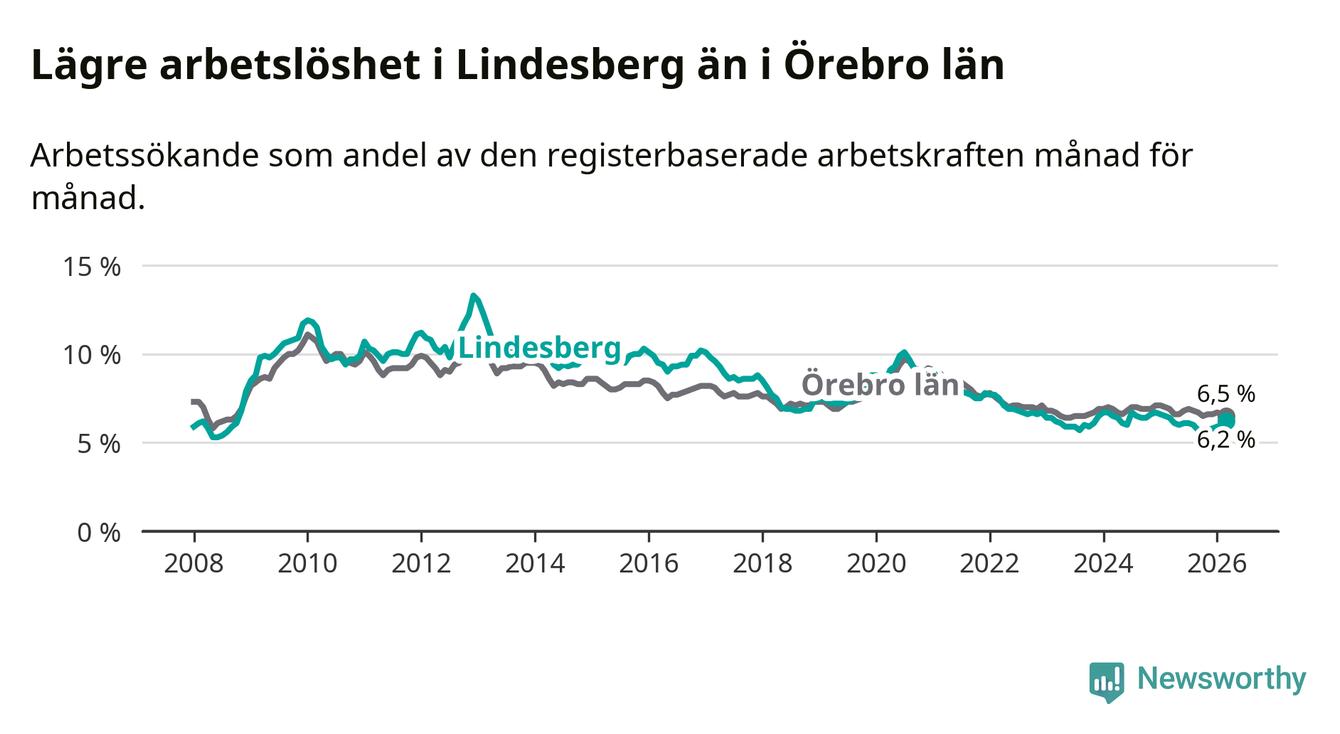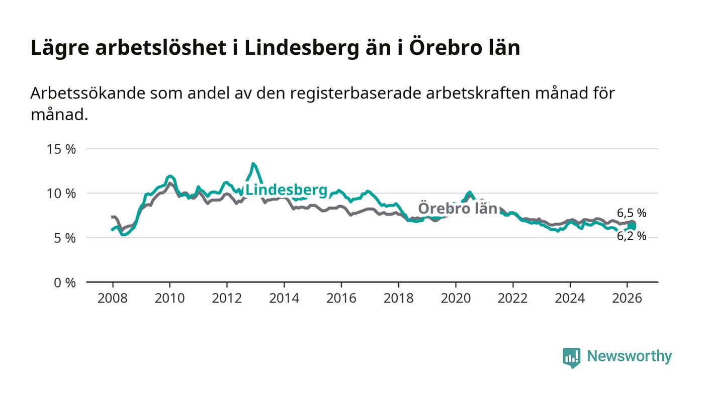 Under mars månad rapporterade Lindesbergs kommun en total arbetslöshet på 6,2 procent. Det är en minskning jämfört med samma tidpunkt i fjol (−0,2 procentenheter). Även i Örebro län sjunker arbetslösheten .