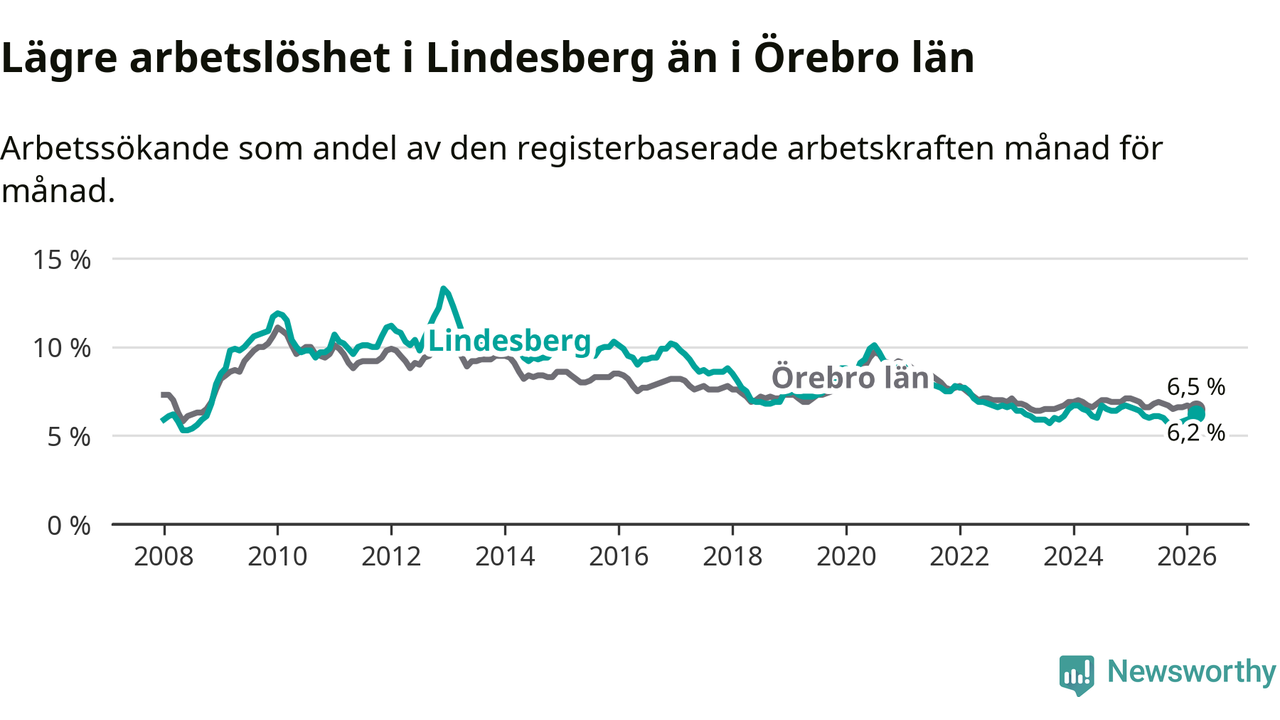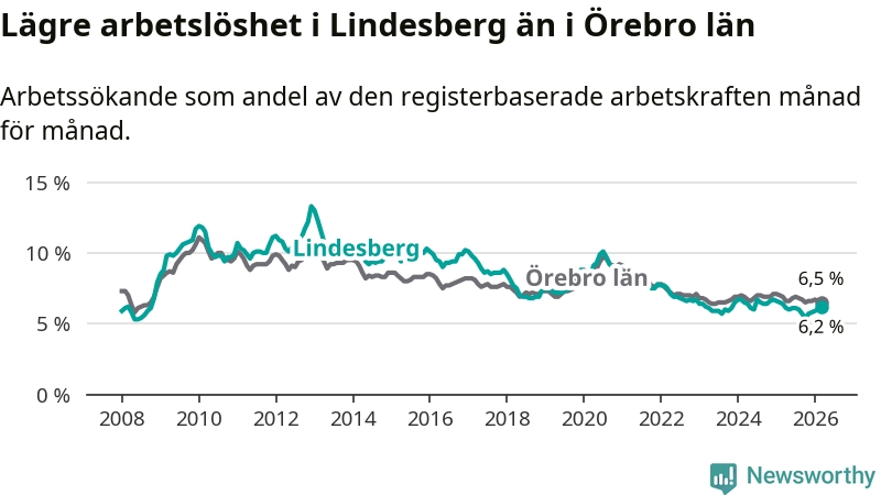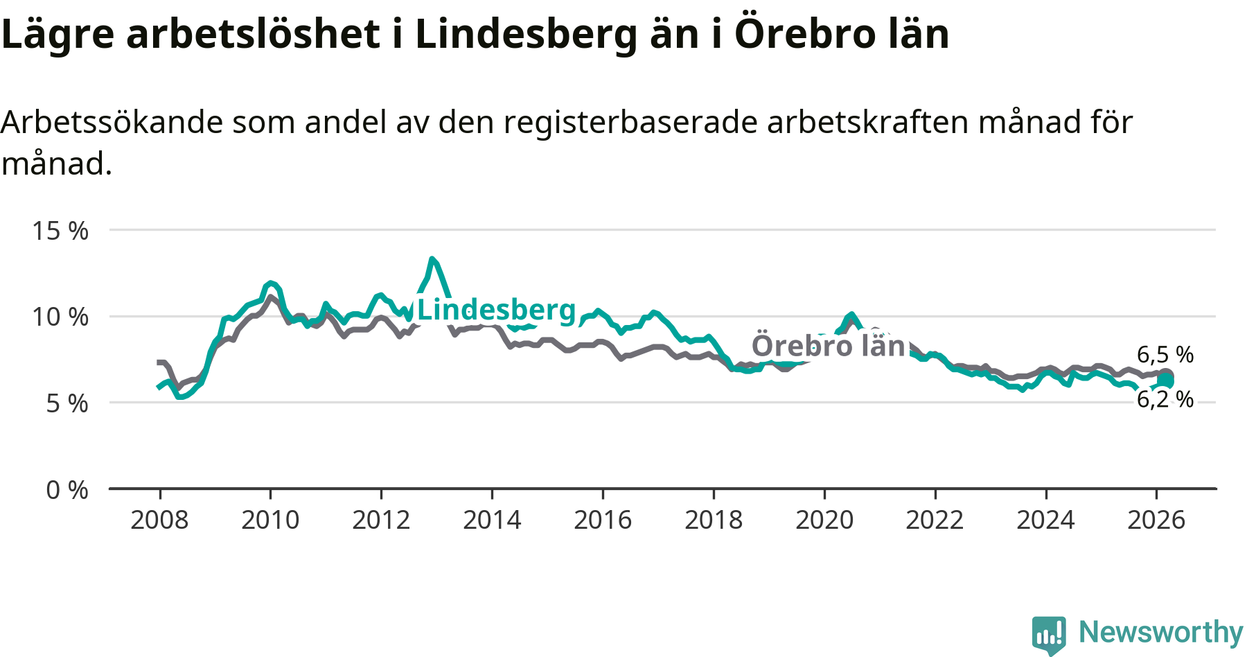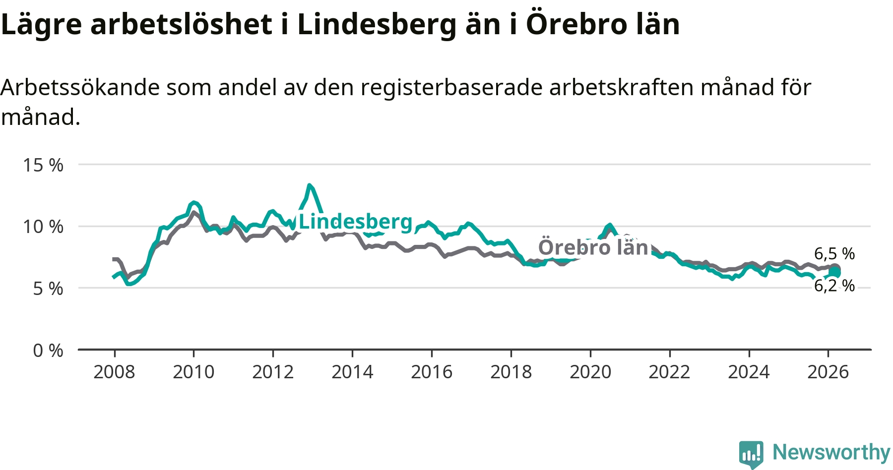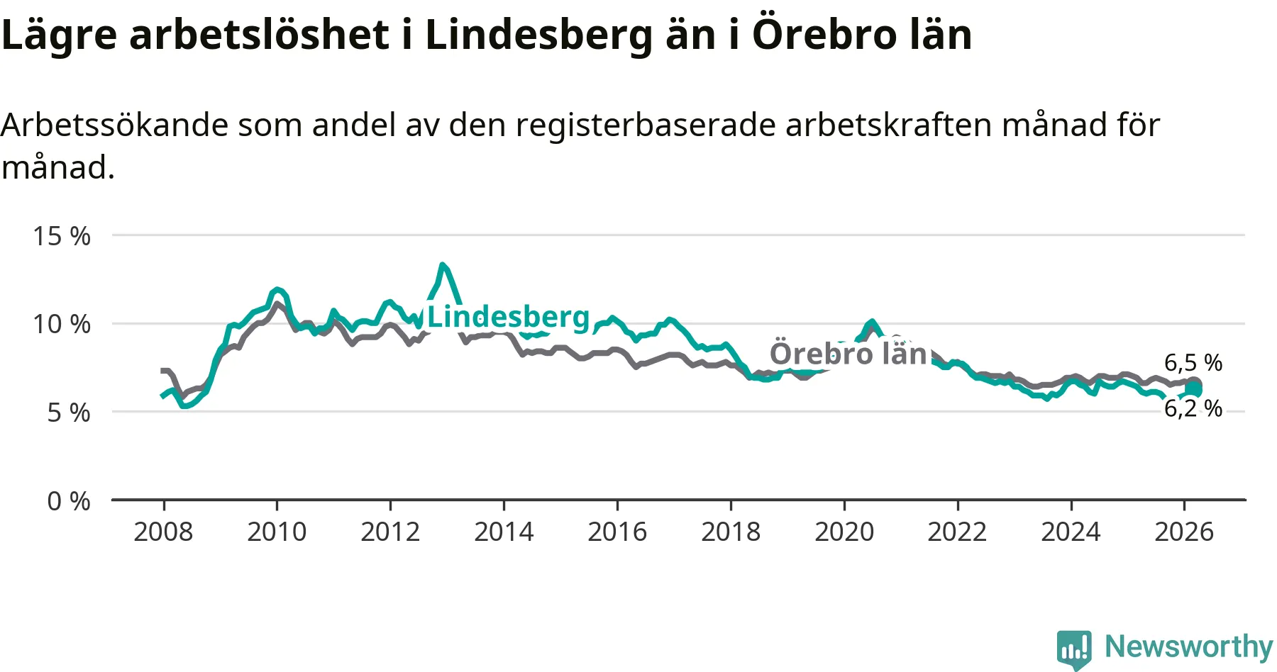 Under mars månad rapporterade Lindesbergs kommun en total arbetslöshet på 6,2 procent. Det är en minskning jämfört med samma tidpunkt i fjol (−0,2 procentenheter). Även i Örebro län sjunker arbetslösheten .