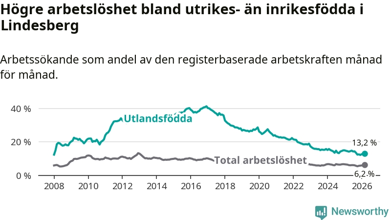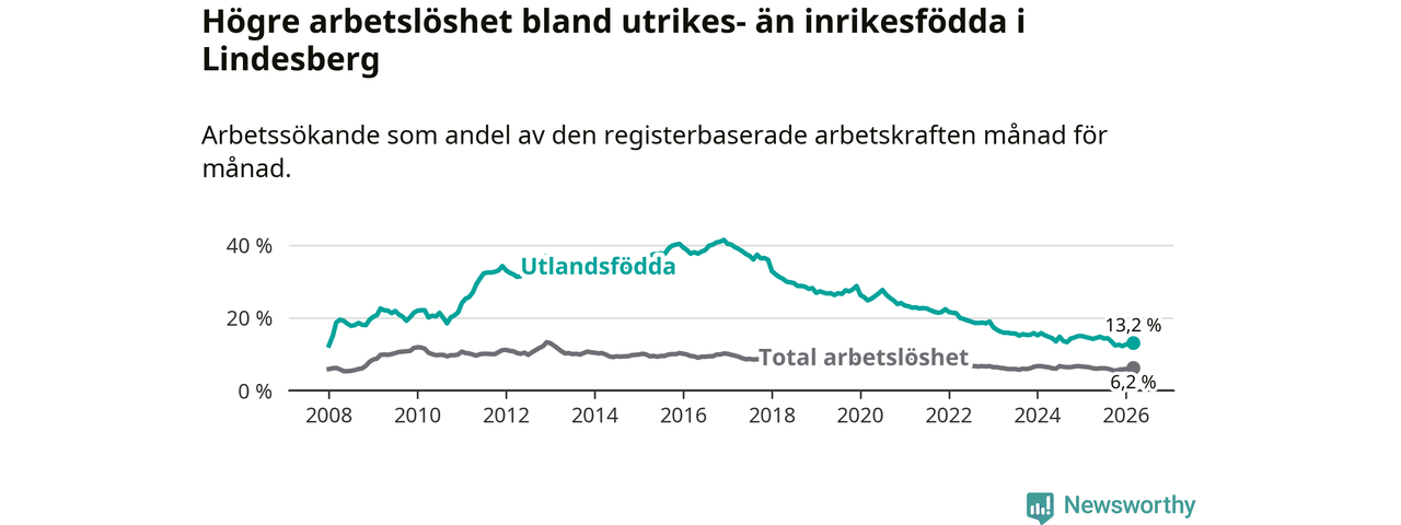 Skillnaden i arbetslöshet mellan utrikesfödda och hela befolkningen är 7,0 procentenheter i Lindesberg. Det är en mindre skillnad än för ett år sedan (−1,1 procentenheter).