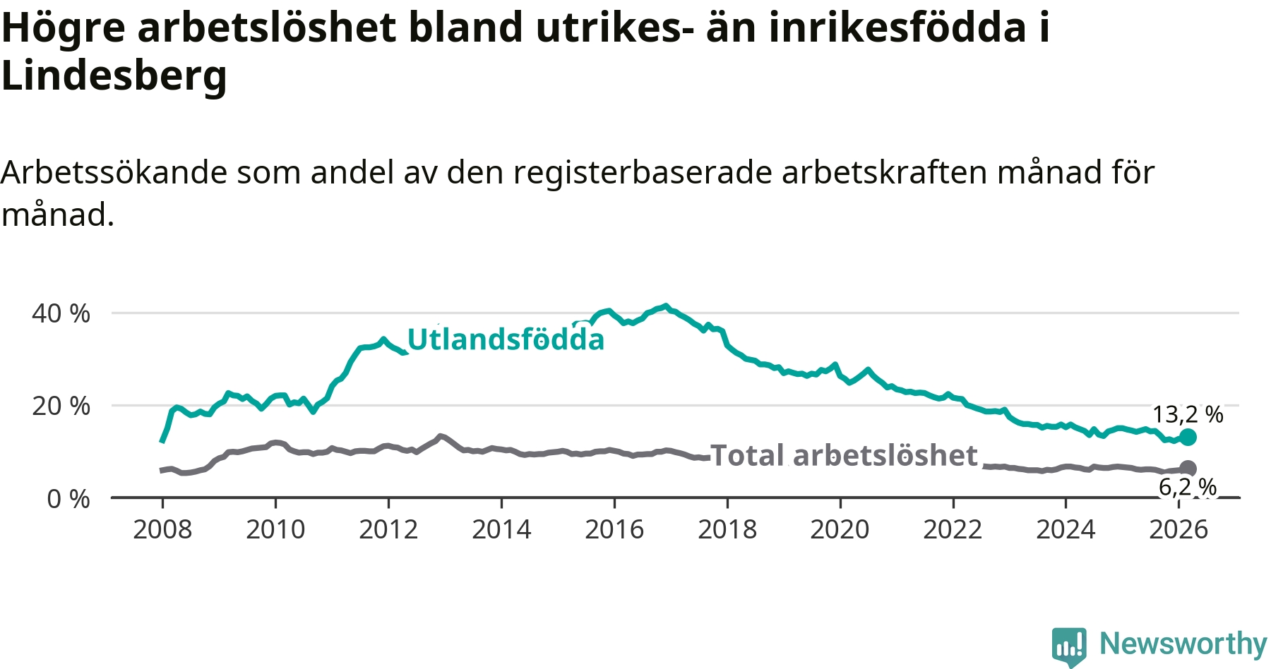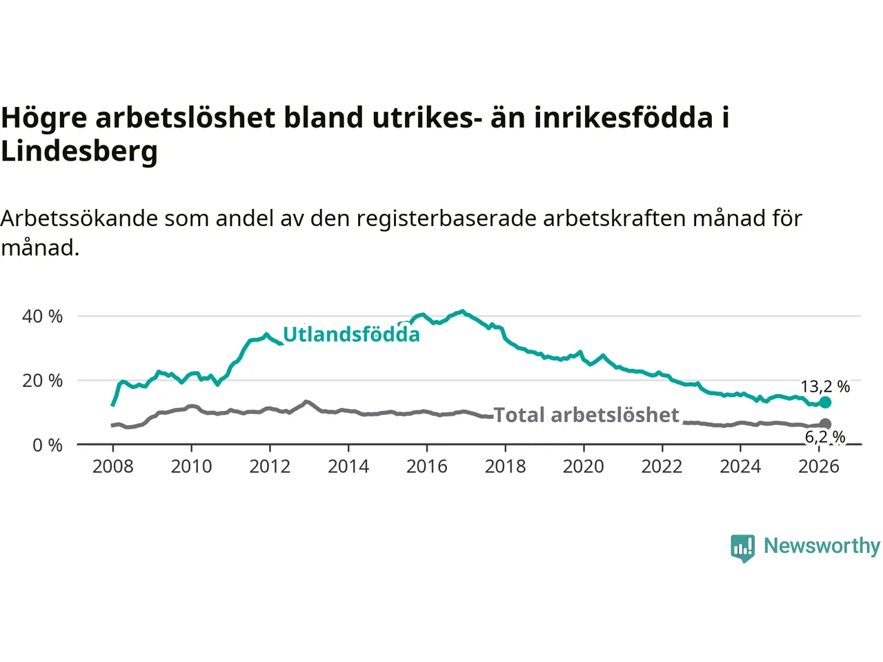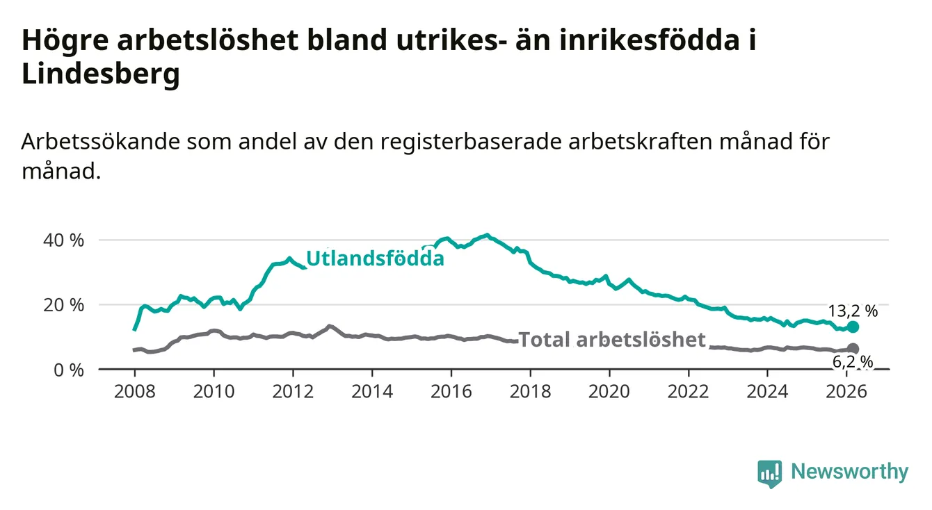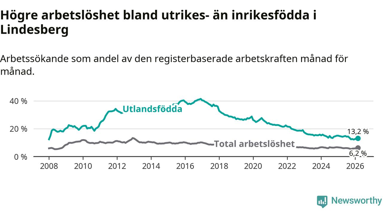 Arbetslösheten bland utlandsfödda var 13,2 procent i Lindesberg under mars månad, motsvarande 252 av 1 909 personer. Det är 1,3 procentenheter färre än vid samma tidpunkt i fjol (−26 om man räknar personer). Därmed är de utlandsföddas arbetslöshet lägre än vid samma tidpunkt i fjol för sjätte månaden i följd.